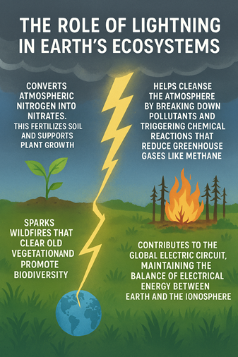 Lightning also helps cleanse the atmosphere by breaking down pollutants and triggering chemical reactions that reduce greenhouse gases like methane. In addition, lightning contributes to the global electric circuit (Schumann Resonance), maintaining the balance of electrical energy between Earth and the ionosphere. Even wildfires sparked by lightning renew ecosystems by clearing old vegetation and promoting biodiversity. Though dangerous, lightning is a powerful force of renewal and balance in nature.