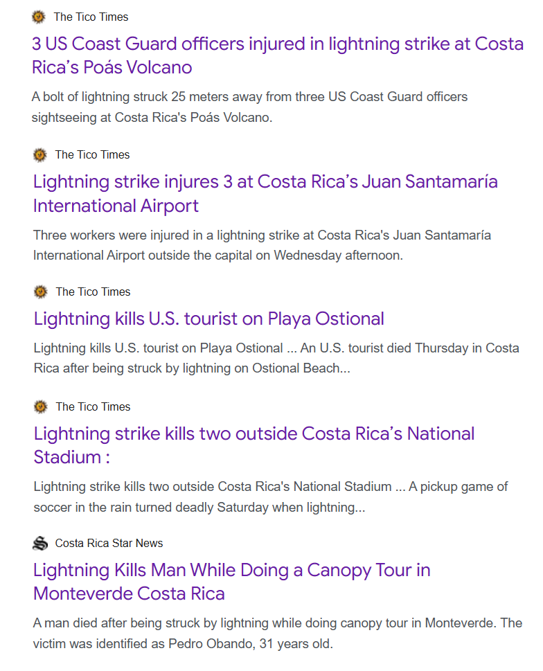 This information is very important – Costa Rica experiences an average of 5 to 10 lightning-related deaths per year. Dozens more are injured. The danger lingers year-round but especially during the rainy season from May to October.