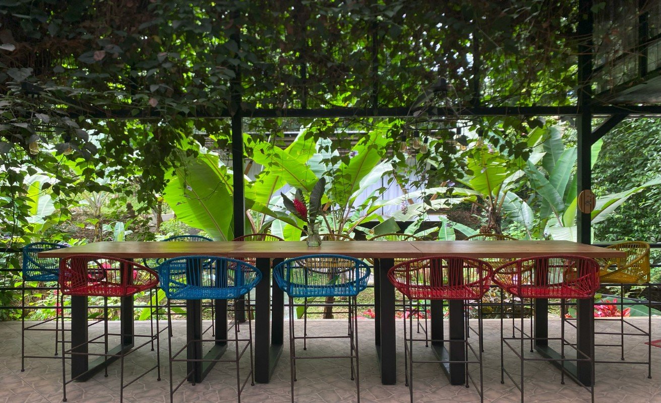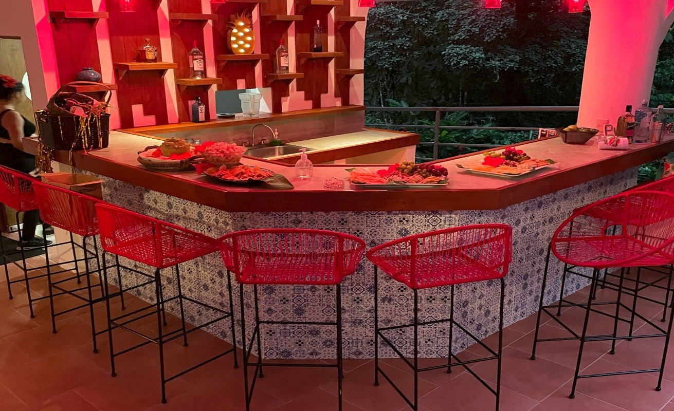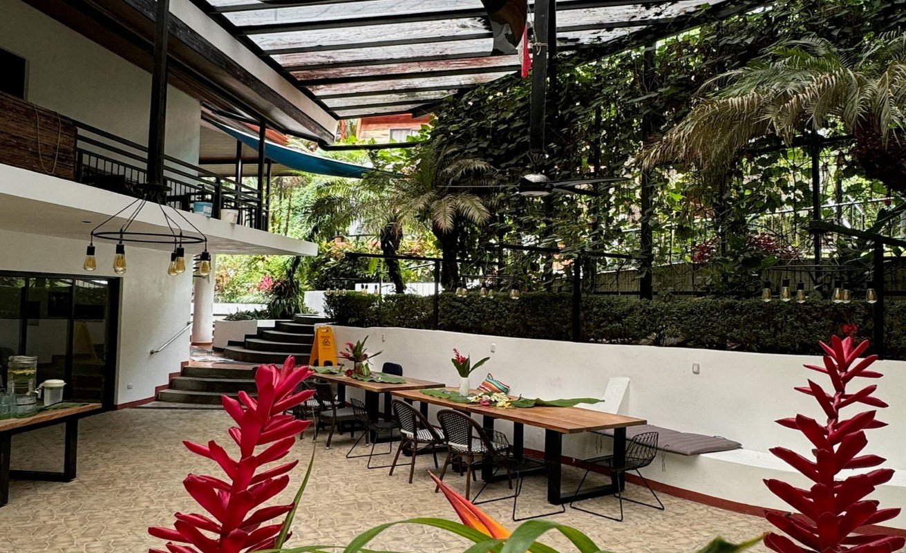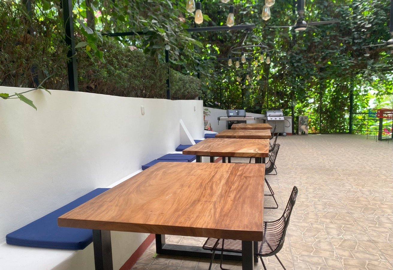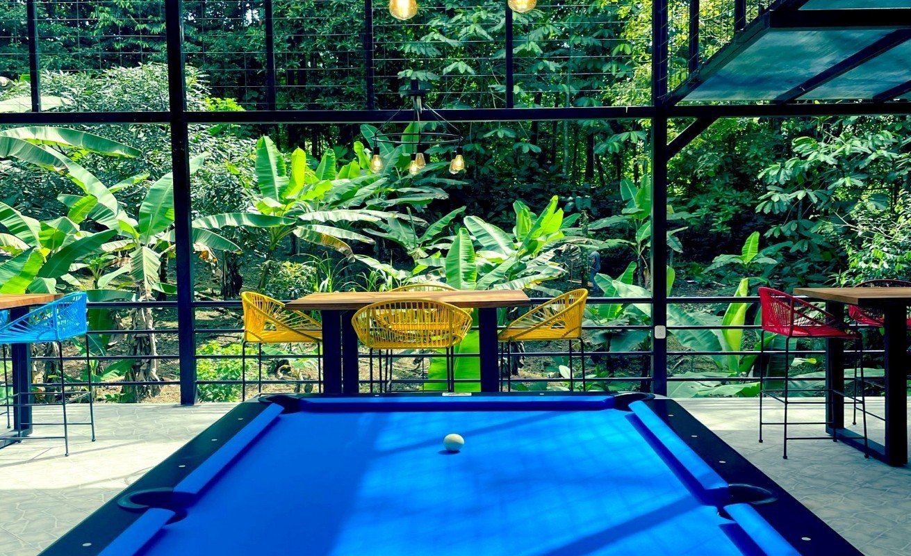 Next to the pool is the main common area, designed for entertaining and hosting. It features a fully equipped commercial kitchen with a bar, and a spacious open-air dining area with multiple tables, ideal for group meals or special events. In the same space, there’s a game corner with a pool table and casual games, creating a lively yet laid-back atmosphere.