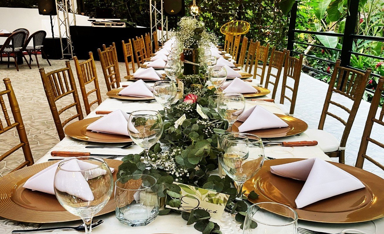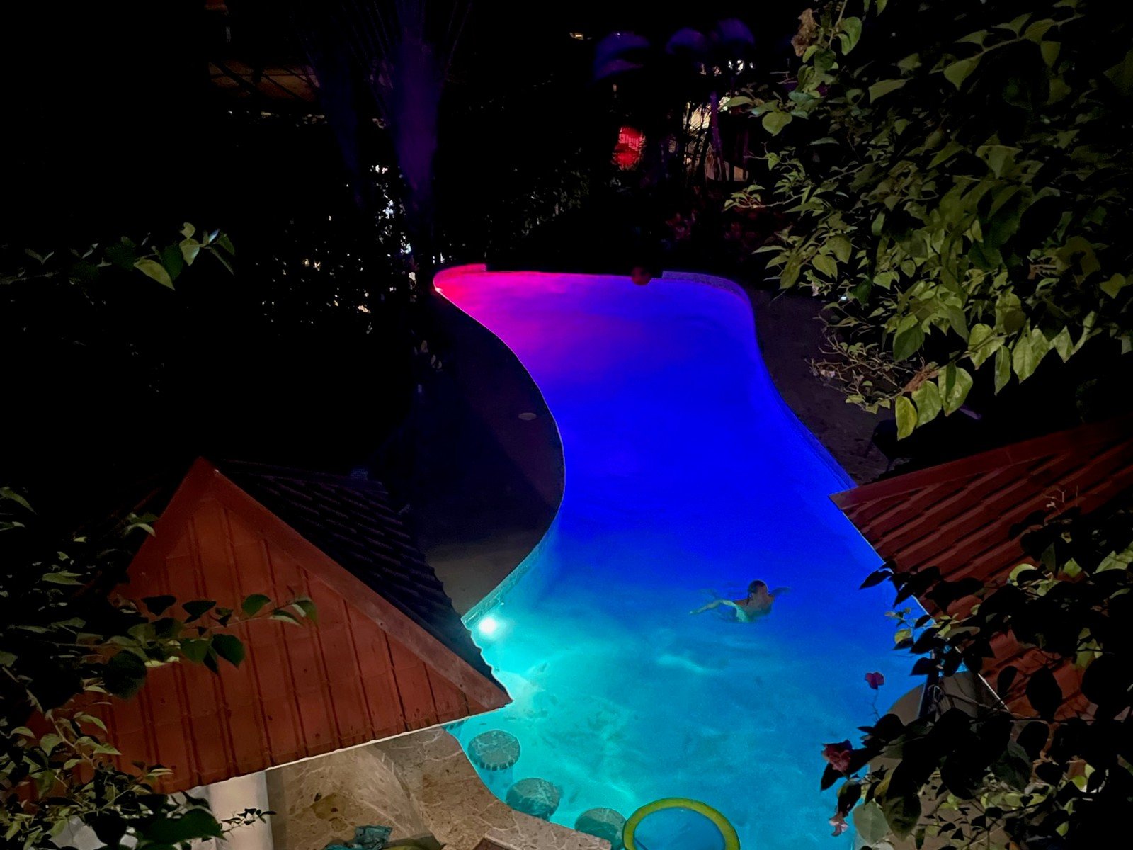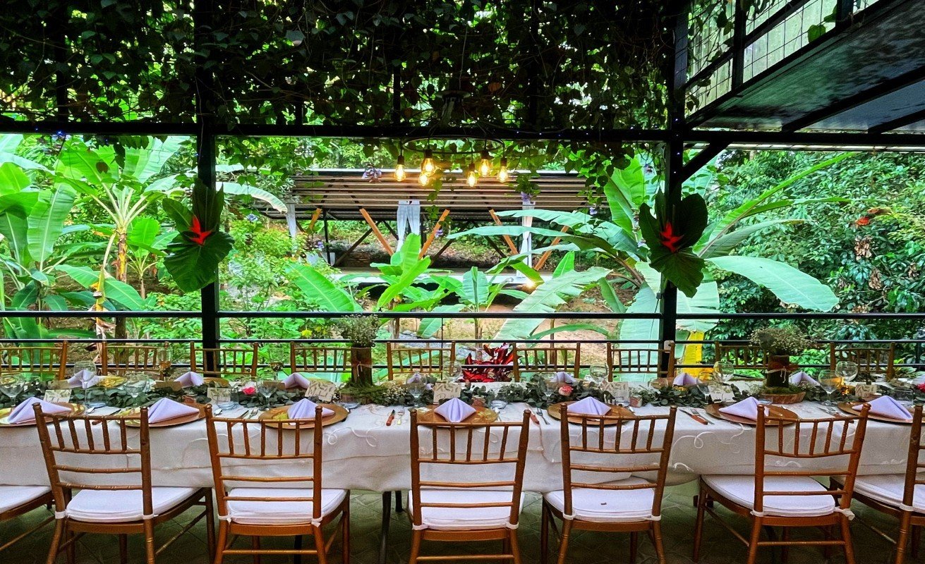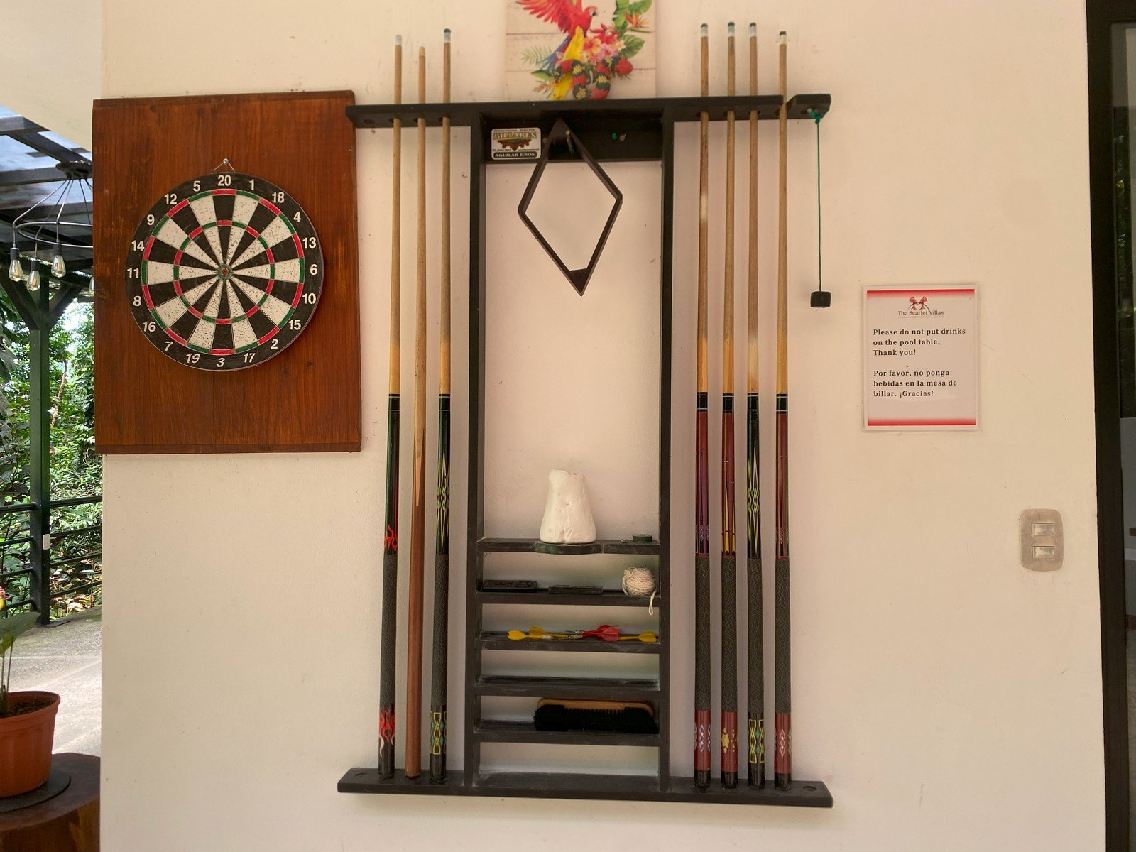 Next to the pool is the main common area, designed for entertaining and hosting. It features a fully equipped commercial kitchen with a bar, and a spacious open-air dining area with multiple tables, ideal for group meals or special events. In the same space, there’s a game corner with a pool table and casual games, creating a lively yet laid-back atmosphere.