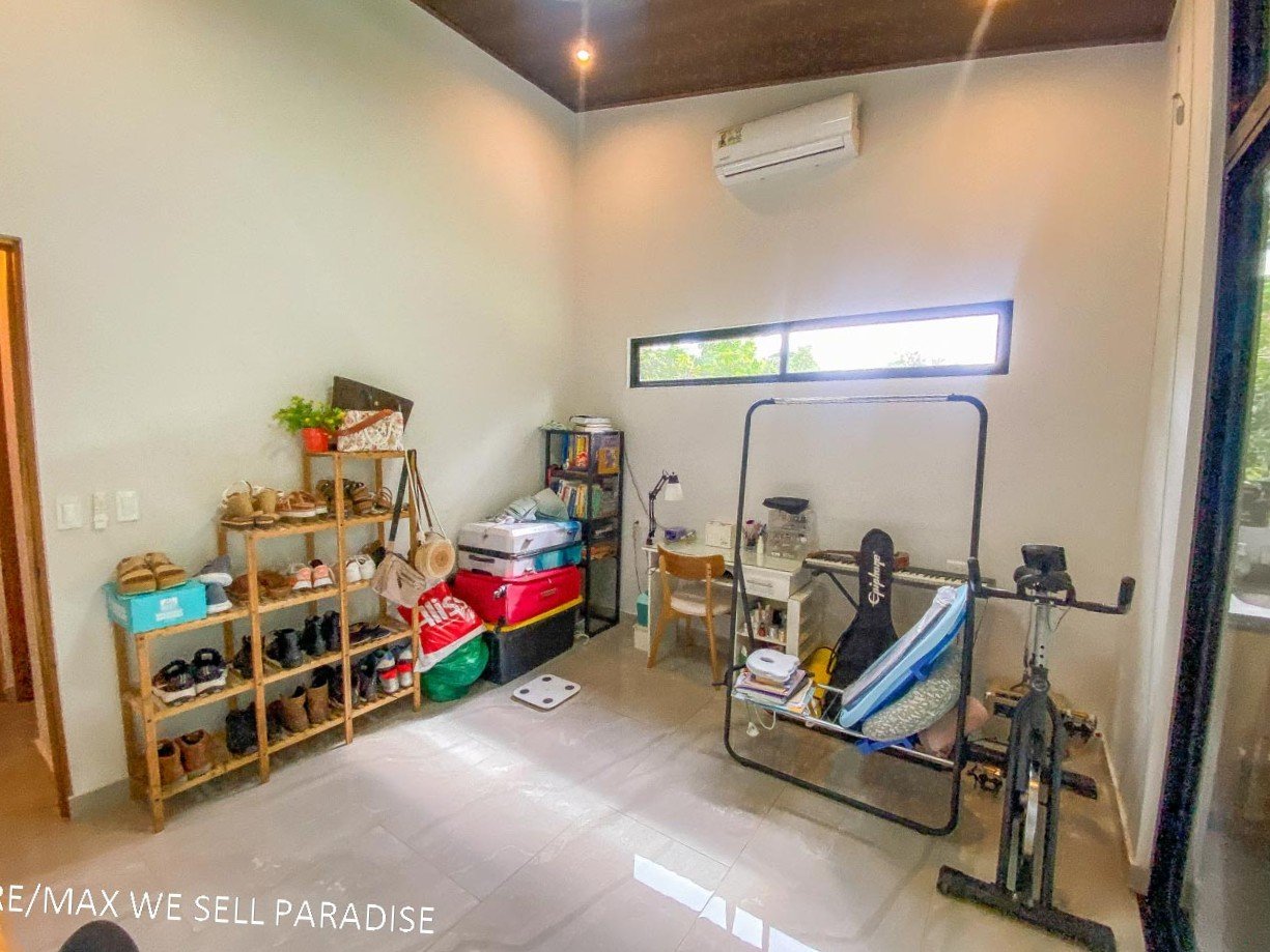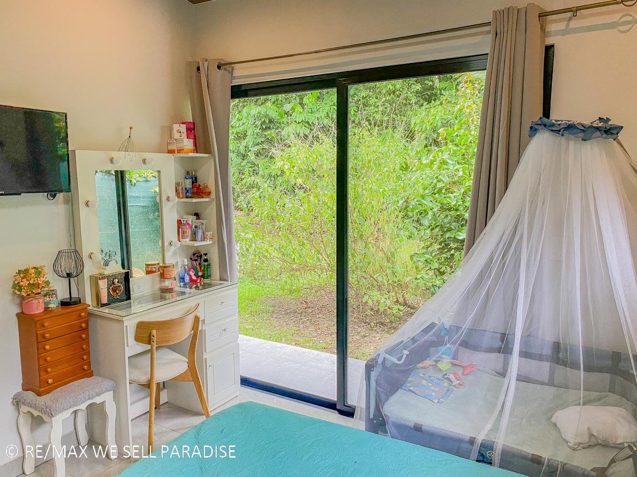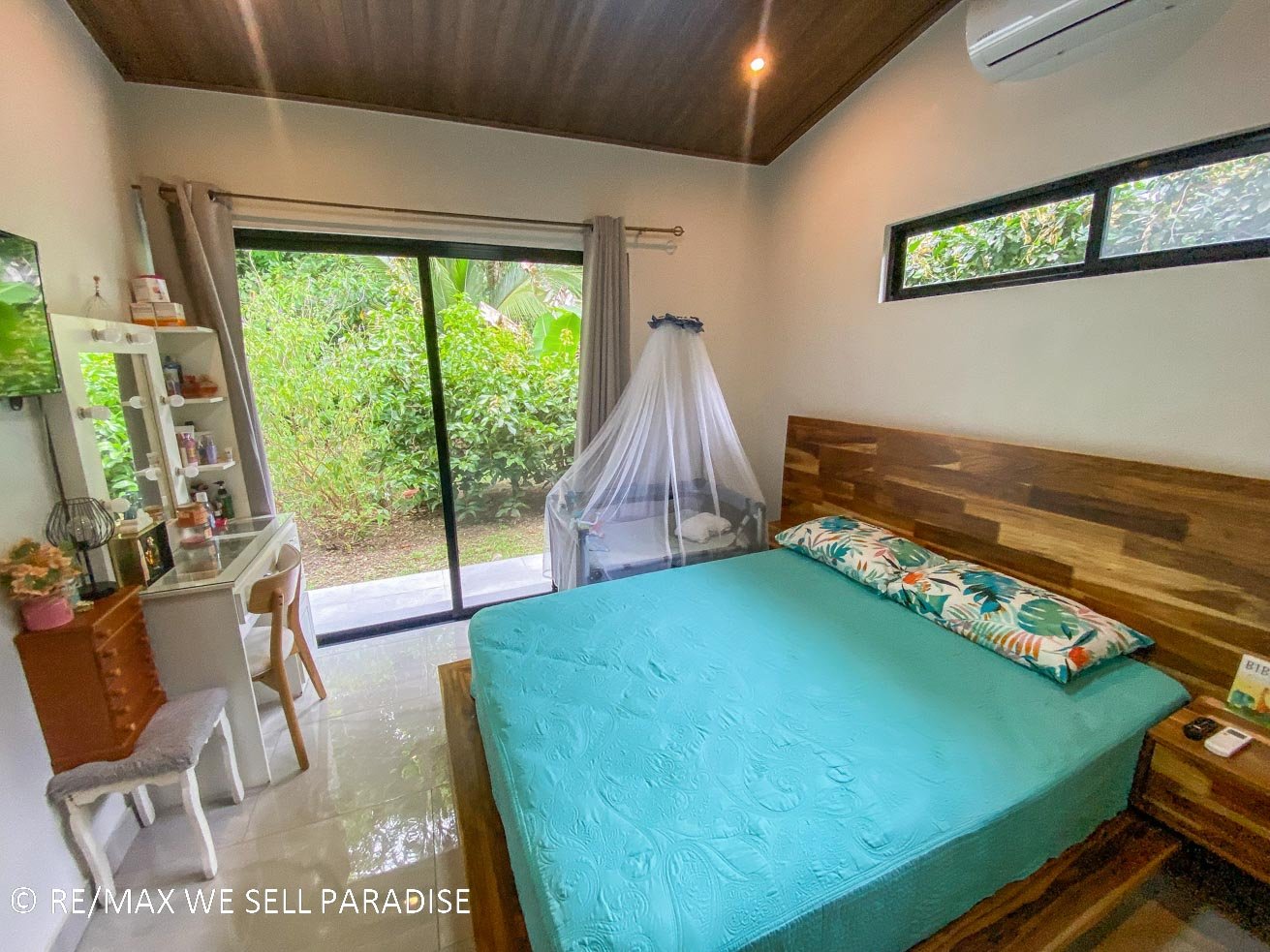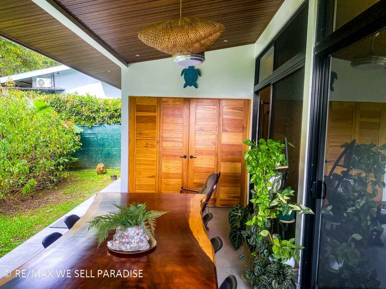 An electric gate & attached carport welcomes you to the property. A side carport entrance puts you into the combined kitchen & living area. On the left, the fully equipped kitchen & breakfast bar look onto Calle Principal and towering jungles that envelop the opposite side of the street. To the right, the living area with a big screen TV and very comfortable leather couches opens directly to the beautiful backyard patio. And in the corner, a shared bathroom & shower, and a master bedroom with sliding door access to the patio, occupy the crook of the home. On the other side of the kitchen / living area are two additional bedrooms and the other bathroom. One bedroom is outfitted as a nursery and the other, with sliding door access to the patio, is currently used as storage / free space with a work station.