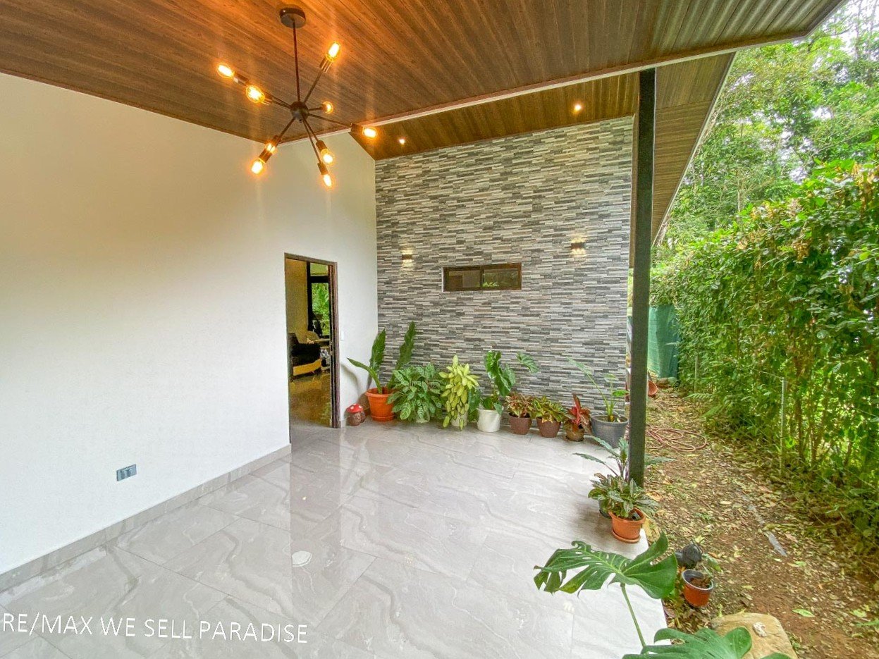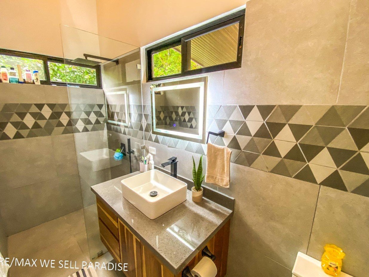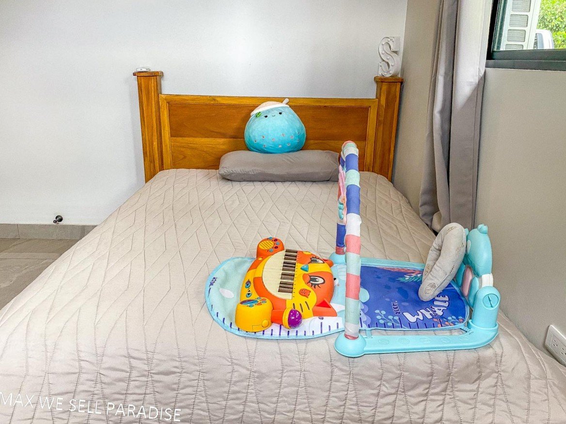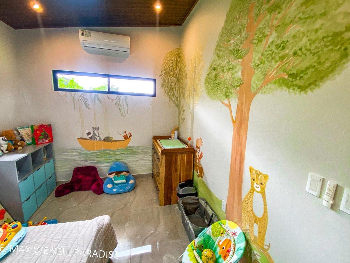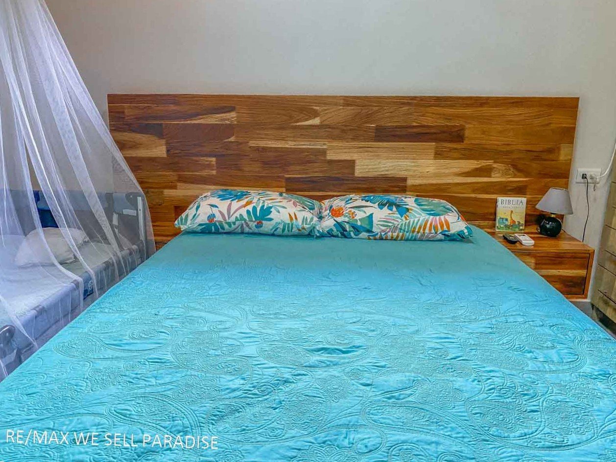 An electric gate & attached carport welcomes you to the property. A side carport entrance puts you into the combined kitchen & living area. On the left, the fully equipped kitchen & breakfast bar look onto Calle Principal and towering jungles that envelop the opposite side of the street. To the right, the living area with a big screen TV and very comfortable leather couches opens directly to the beautiful backyard patio. And in the corner, a shared bathroom & shower, and a master bedroom with sliding door access to the patio, occupy the crook of the home. On the other side of the kitchen / living area are two additional bedrooms and the other bathroom. One bedroom is outfitted as a nursery and the other, with sliding door access to the patio, is currently used as storage / free space with a work station.