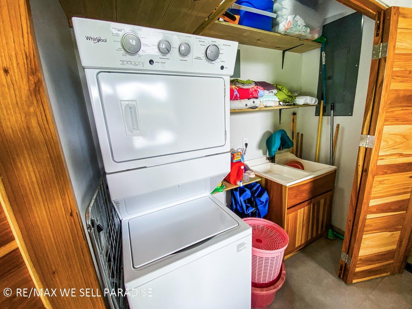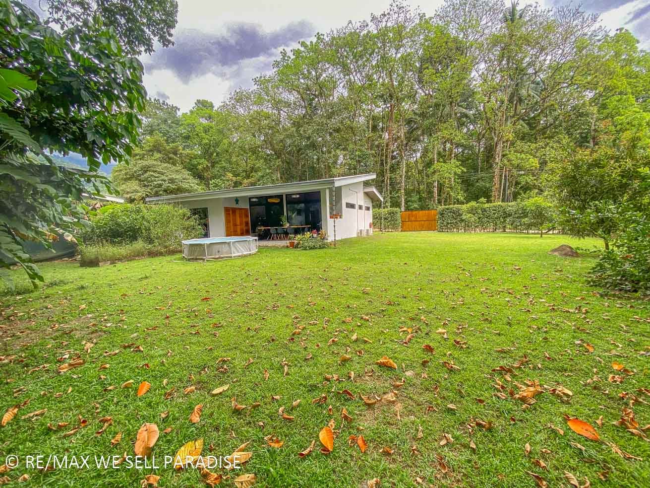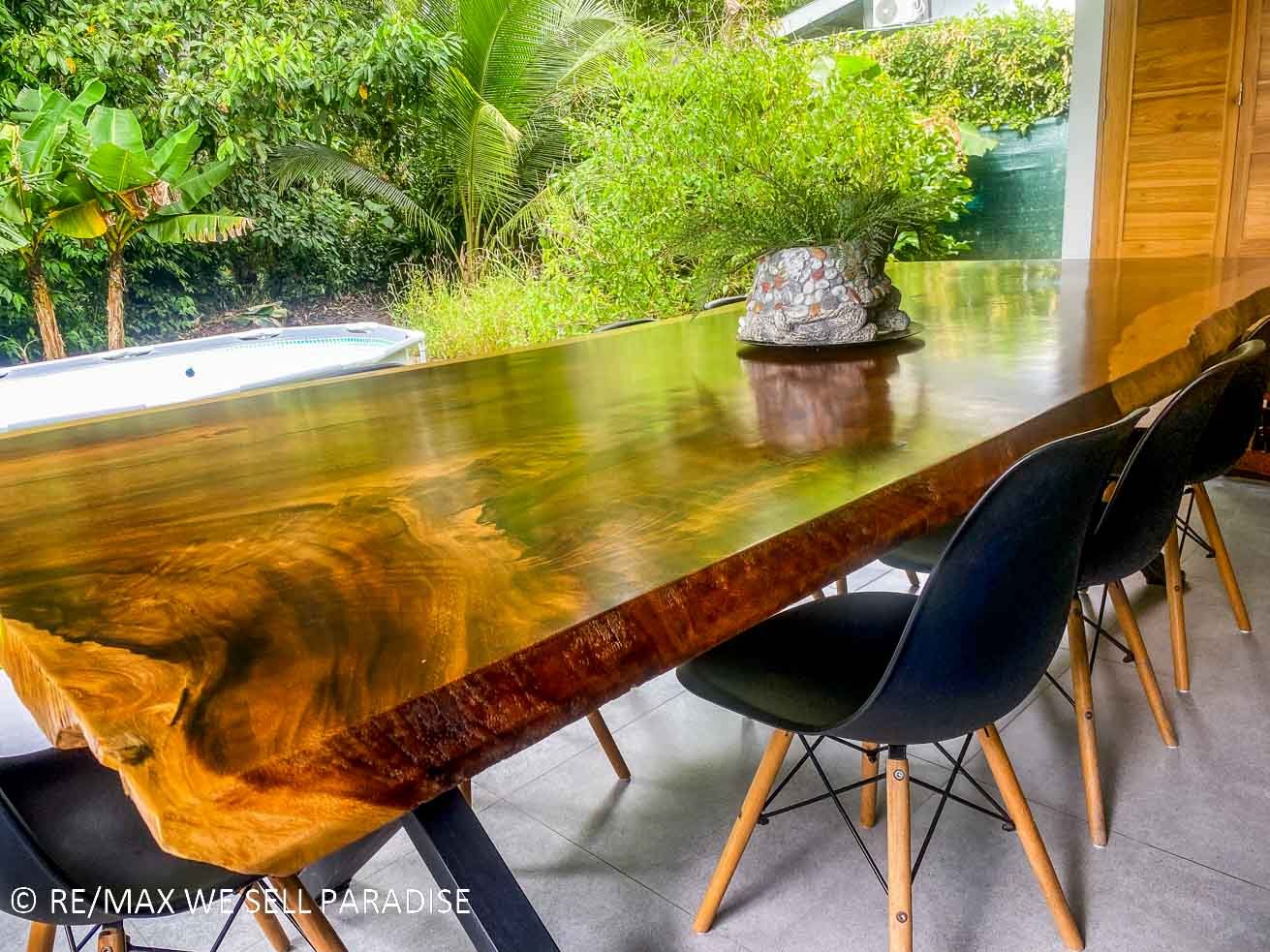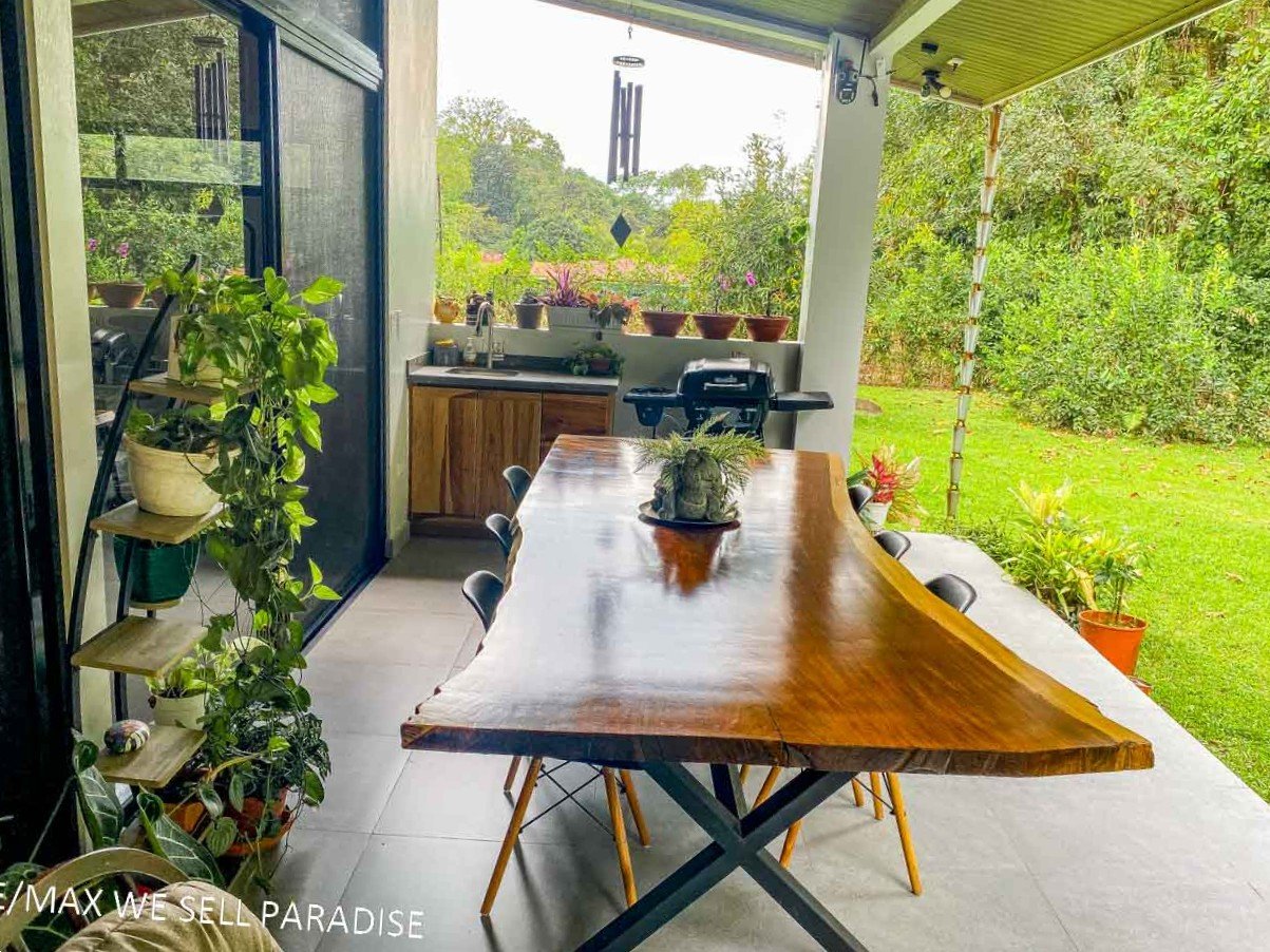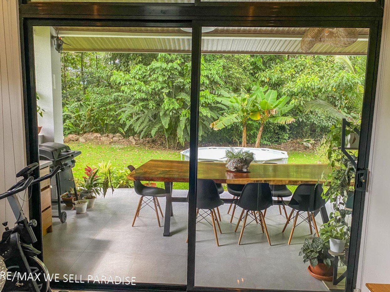 The marvelous outdoor covered patio, which doubles as the dining area, impresses with a majestic single-slab lumber dining table & seating for eight. The patio holds a sink, BBQ, and an enclosed & fully equipped laundry area with large basins and bountiful storage space. Plentiful lighting, potted plants, accents, and fitouts make this patio appear as if it was another room of the home – it is cozy yet blesses with amazing jungle views. An above-ground pool, just off the patio, completes the offering.
