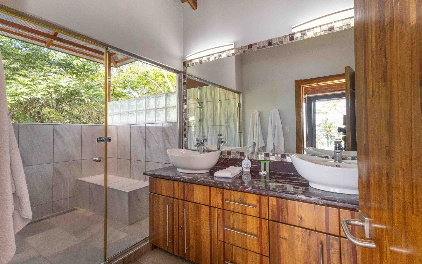 The architectural focus of this residence is the stunning views of the Pacific Ocean. Walls of glass and sliding doors blend the indoor spaces with the outdoor environment, centering nature as the main attraction of each room. All three bedroom suites face the ocean, enabling views of the surf directly from your bed. The en-suite bathrooms, designed with jungle views, invite peaceful reflections with the morning chorus as a backdrop. Additionally, the elegantly curved infinity pool is perfectly aligned to capture spectacular sunset vistas over the ocean.