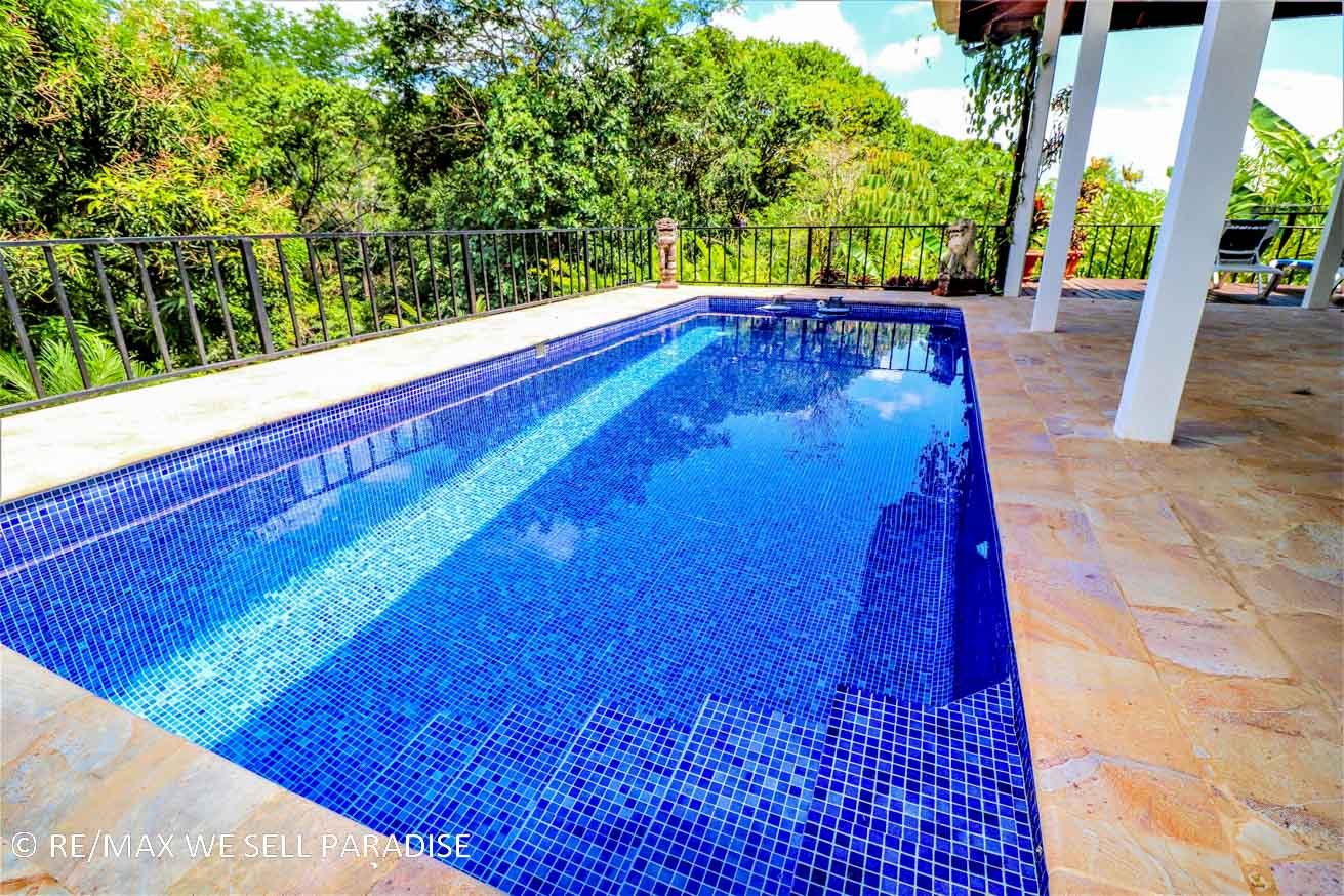 An indigo-tiled swimming pool extends from the patio into the sun, offering panoramic views of jungle‑covered mountains and the Pacific horizon. An enveloping deck invites for a sunbake or evening lounge. The other part of the patio holds multiple eating areas, a lounge and a dramatic cantilevered wooden deck which extends into the treetops, capturing refreshing valley breezes and showcasing a stunning white‑water coastline.