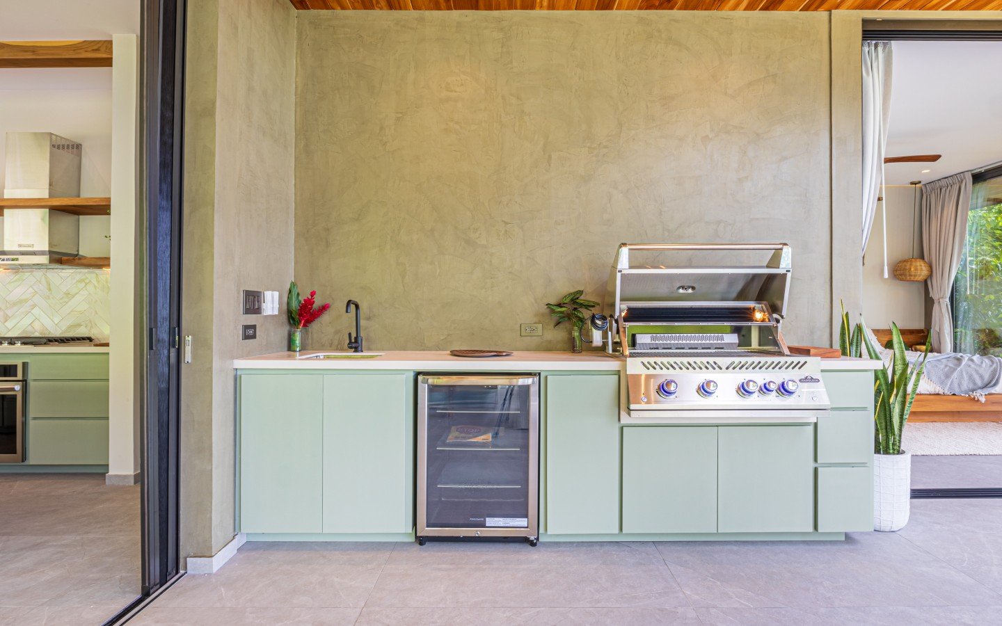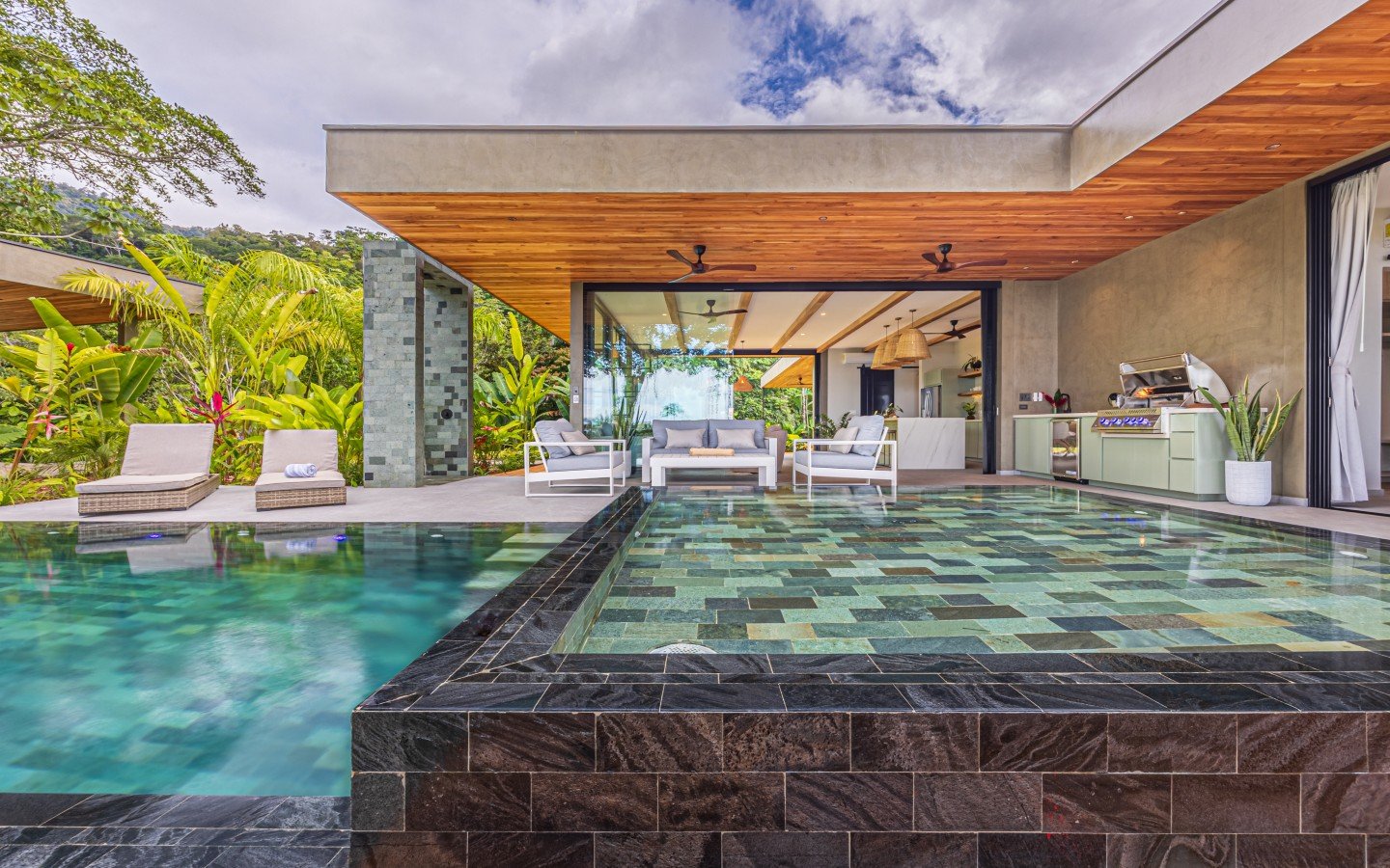 The covered terrace is designed for year-round enjoyment, complete with a built-in bar, refrigerator, sink, and professional-grade stainless steel BBQ. The 12-meter natural-stone infinity pool offers different depths for all ages and overlooks the tropical gardens — a truly tropical gardens.