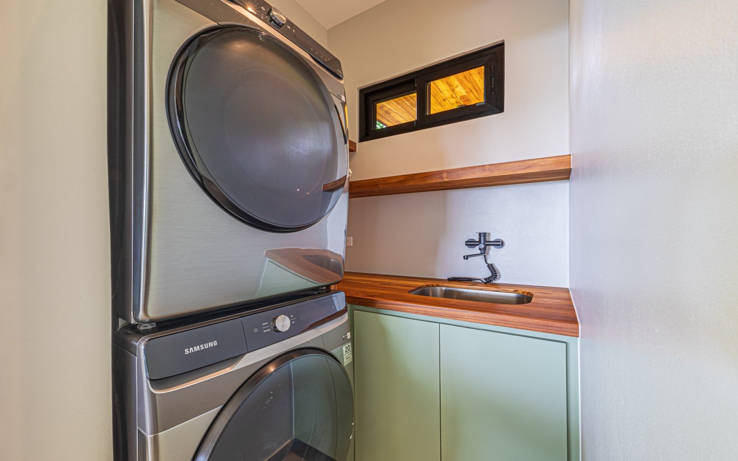 Every detail of this home showcases exceptional craftsmanship — from the custom beams teak ceilings and handcrafted furniture to the ambient LED lighting that enhances each space and the polish concrete finish on the walks. The open-concept kitchen is fully equipped with stainless steel appliances, golden accents, and a stunning waterfall-edge island with seating for four. A walk-in pantry provides ample storage, ideal for long-term living or hosting guests.