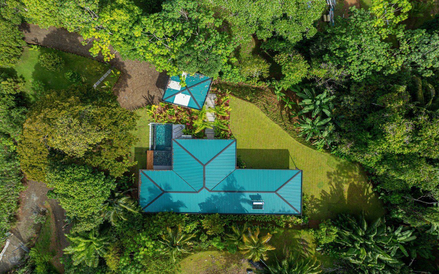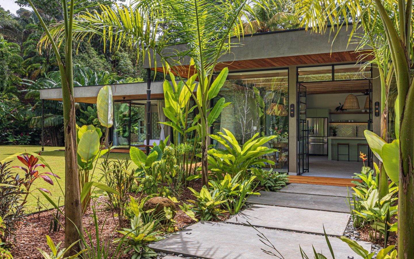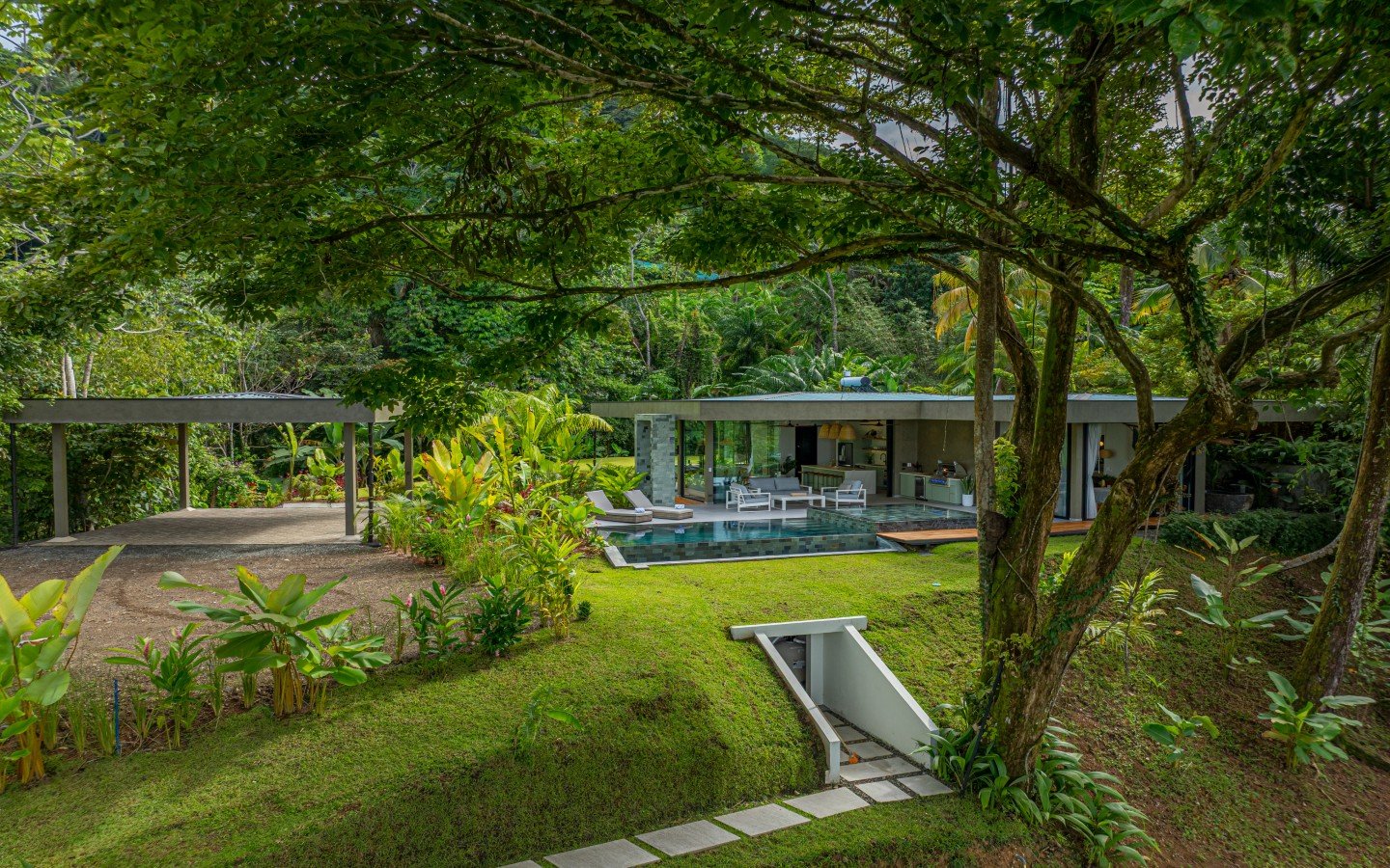 From the spacious two-car carport with teak ceilings and stone pavers, a gently stepped path leads you through the gardens to the home’s entrance. The living and dining area feature elegant French-style double doors and floor-to-ceiling glass panels, perfectly framing the ocean and jungle views.