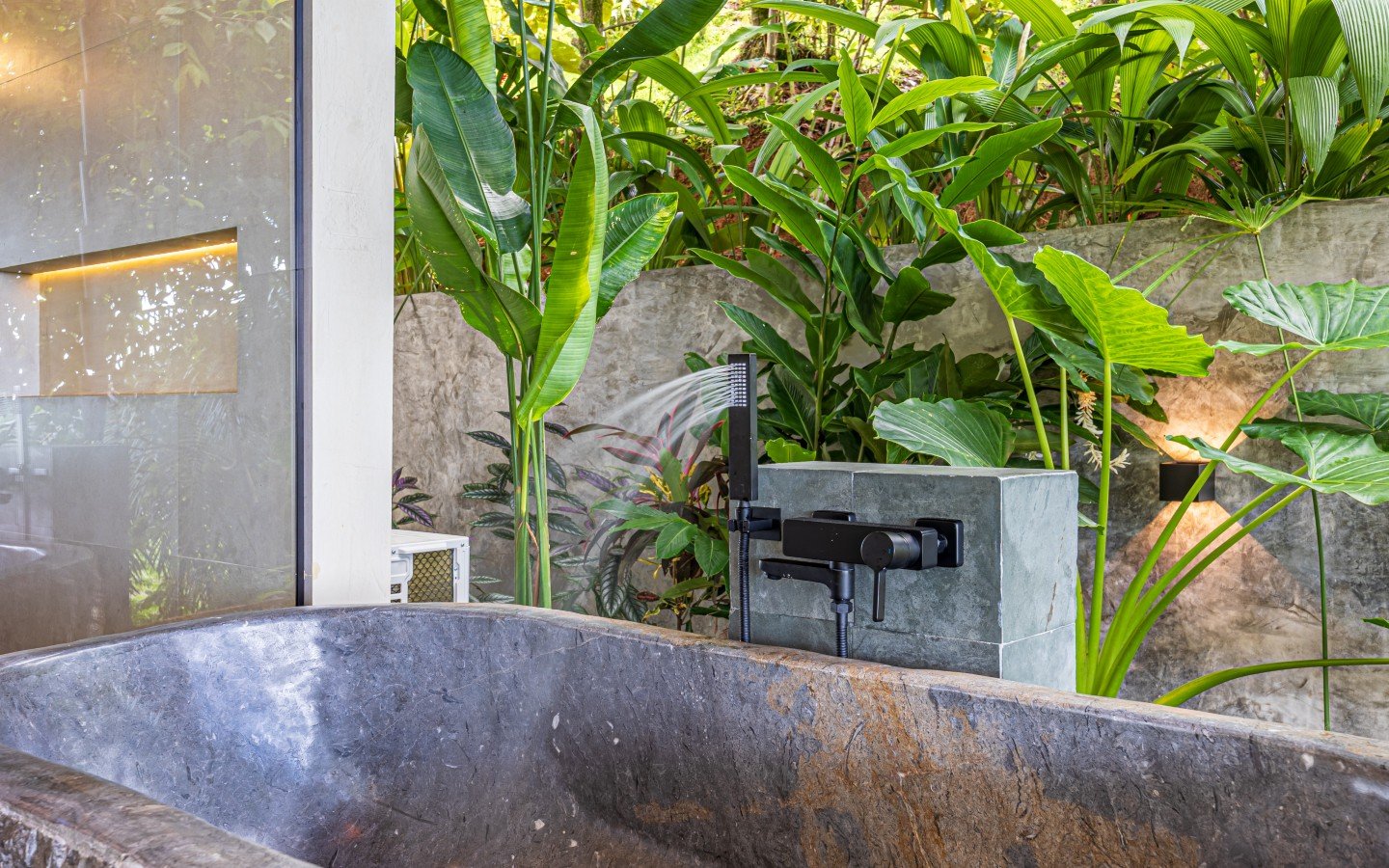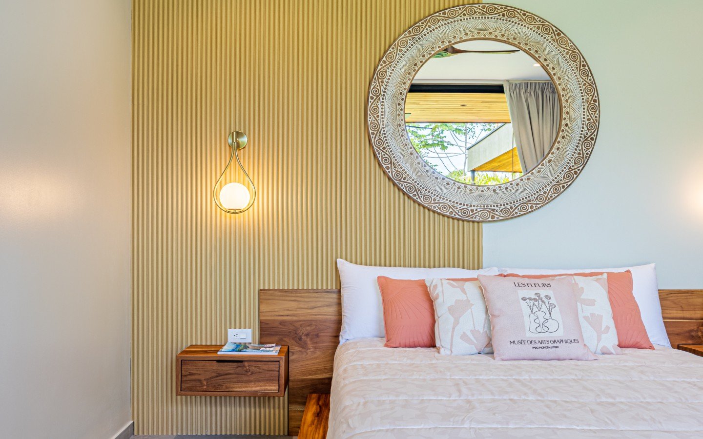 The primary suite features a custom floating teak king-size bed, walk-in closet, ocean views, and direct access to the pool. The en-suite bathroom includes double vanities, a rain shower, and an exclusive outdoor natural-stone hot tub — your private spa.