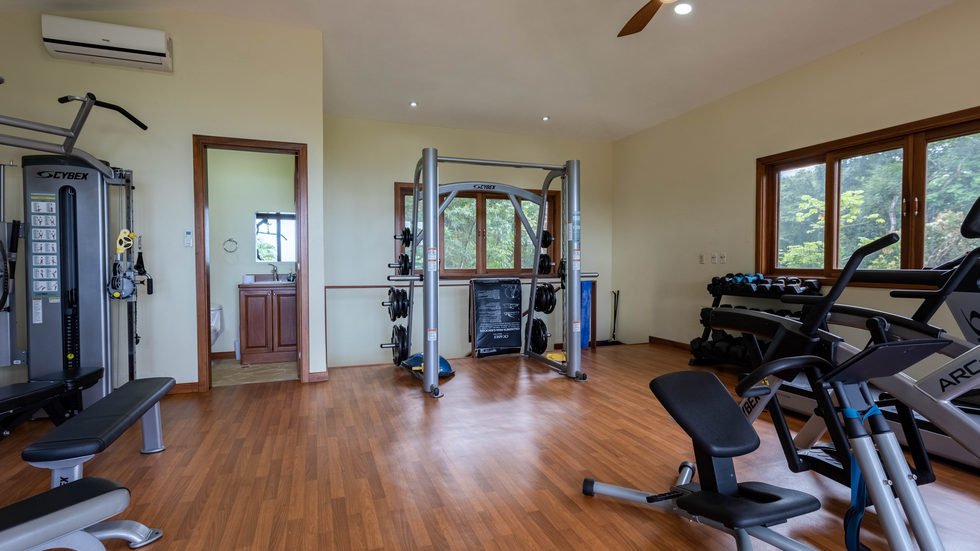 Recently added is a two-car garage and on top of this garage is a one-bedroom/one-bath guest apartment that is currently being used as a gym. This area is currently equipped with a large amount of modern gym equipment.
