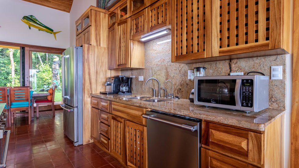 Two master suites on the western side of the home feature ocean views, private bathrooms, spacious closets, and direct access to the pool lounge area. The two bedrooms located on the eastern side of the home feature ample storage space and direct access to the rainforest backyard. The home also includes a fully equipped kitchen with granite counters, a laundry room, a storage room, and a third full bathroom located off of the living room. Luxurious Guanacaste wood finishes were used throughout the entire home including custom kitchen cabinets, windows, and doors.