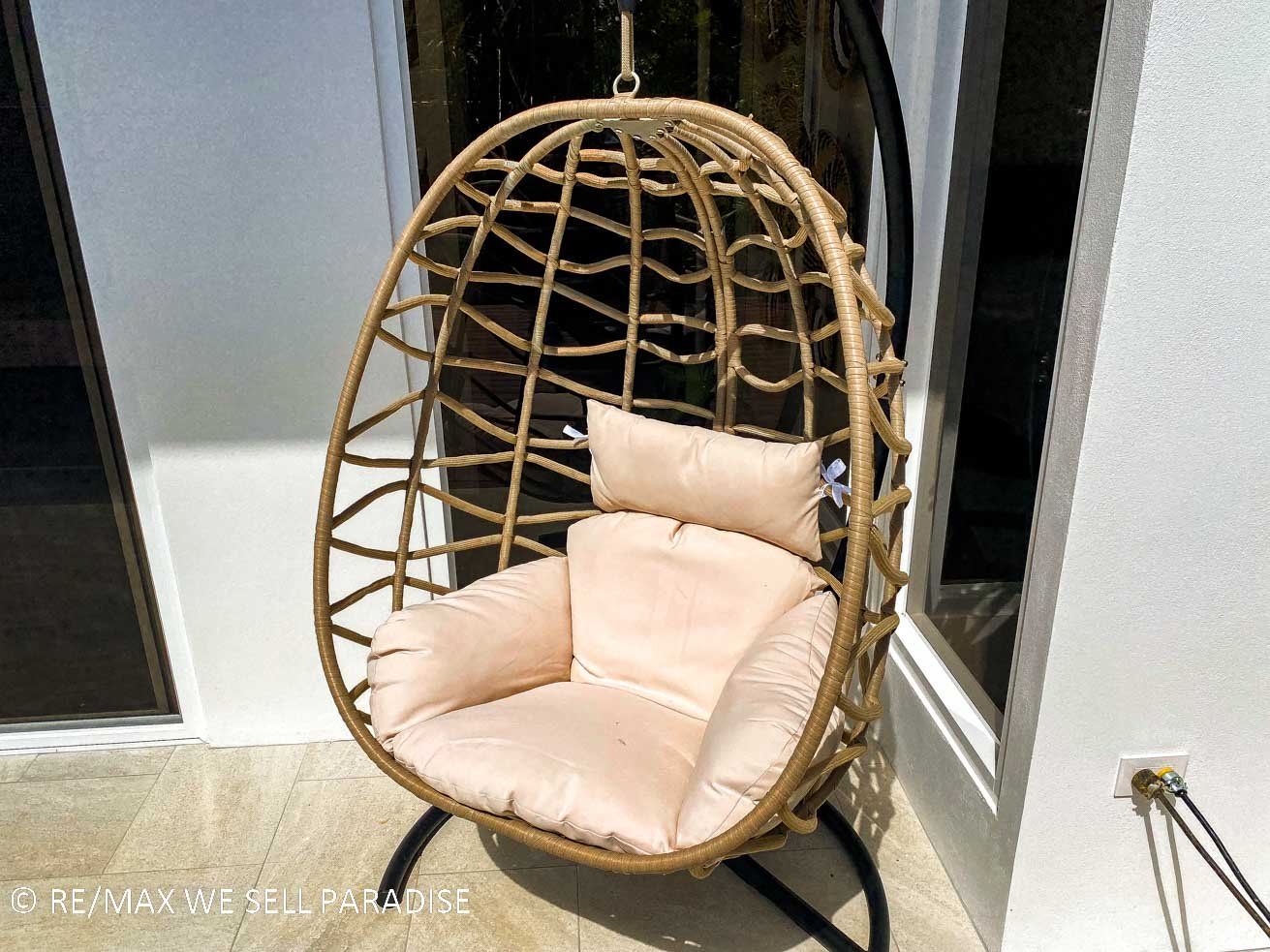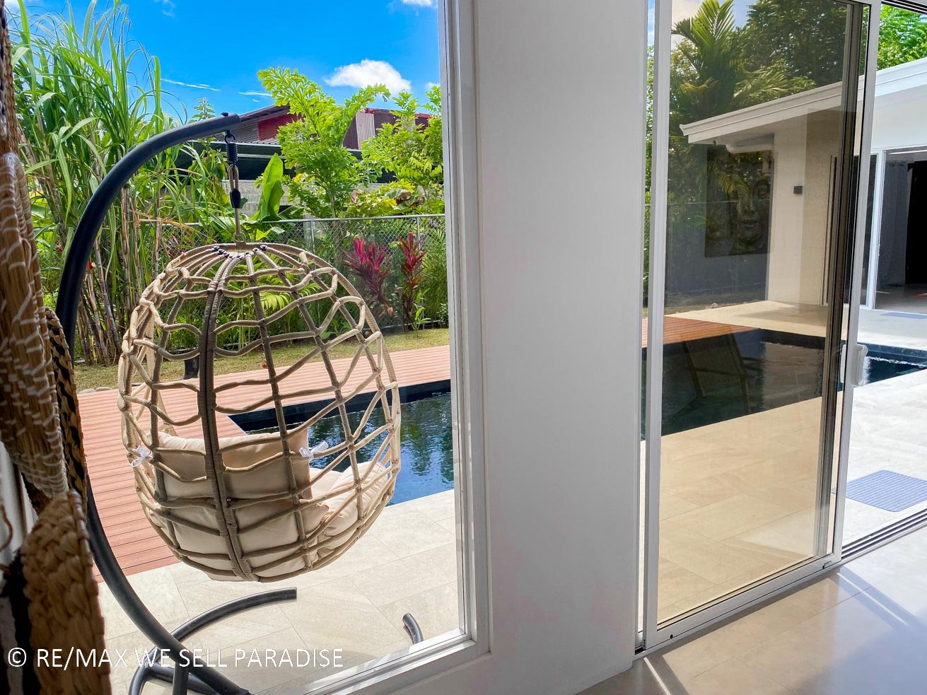 A unique glazed hallway connects the main living area with the bedrooms, with one side almost entirely glazed to capture views of the patio. All four bedrooms feature beautiful lumber furnishings and sliding glass doors that open to various outdoor and indoor areas. The bathrooms continue the warm wood aesthetic, enhanced by natural stone finishes in the showers. The house is fully air-conditioned.