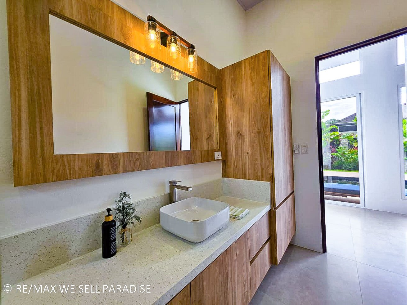 High ceilings and clerestory windows fill the space with natural light. Off‑white tiles, warm lighting, and rich lumber cabinetry and accents create a welcoming, tropical warmth throughout.
