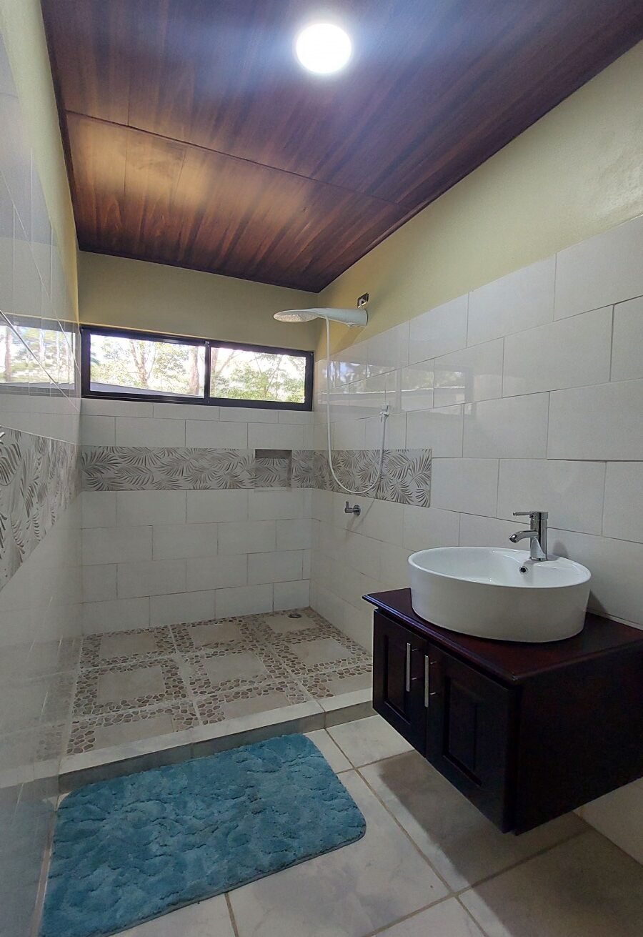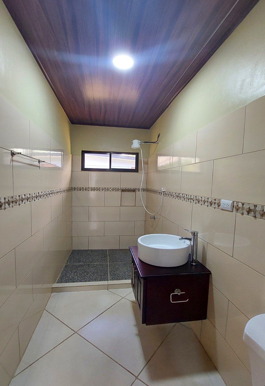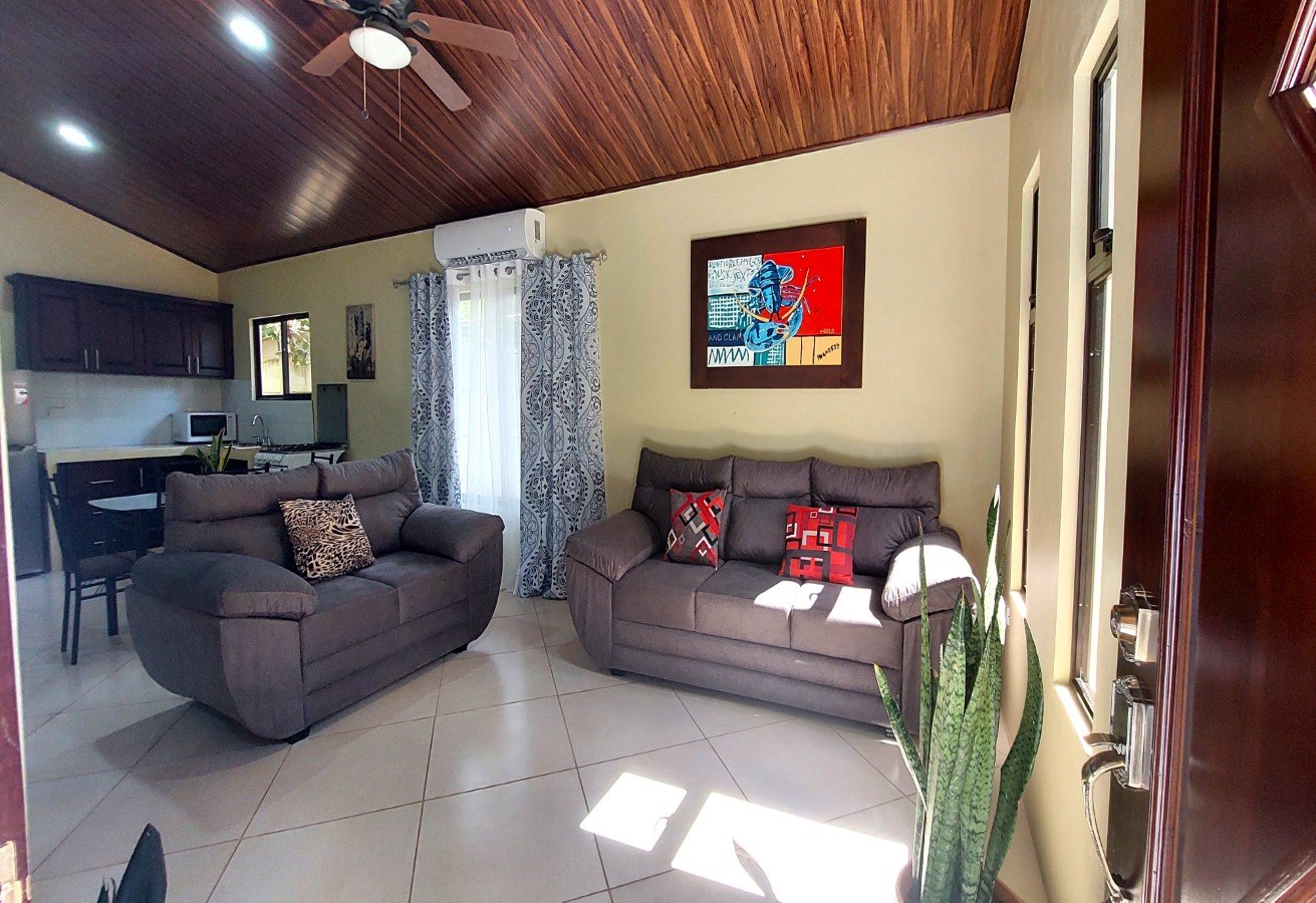 The charming single level home features 2 bedrooms and 2 full bathrooms. This home has combined living and dining area with comfortable sofas, internet, ceiling fans, and air conditioner. It is a great place to relax with friends and spacious for digital nomads working remotely, or retirees looking to enjoy the Costa Rican way of life in a brand new home. The fully equipped kitchen connects to a spacious laundry room located in the back of the house. Tiled counters and backsplash, solid wood cabinets hand crafted locally, and tile floors are all in a traditional style making it the perfect setting for cooking up some delicious meals.