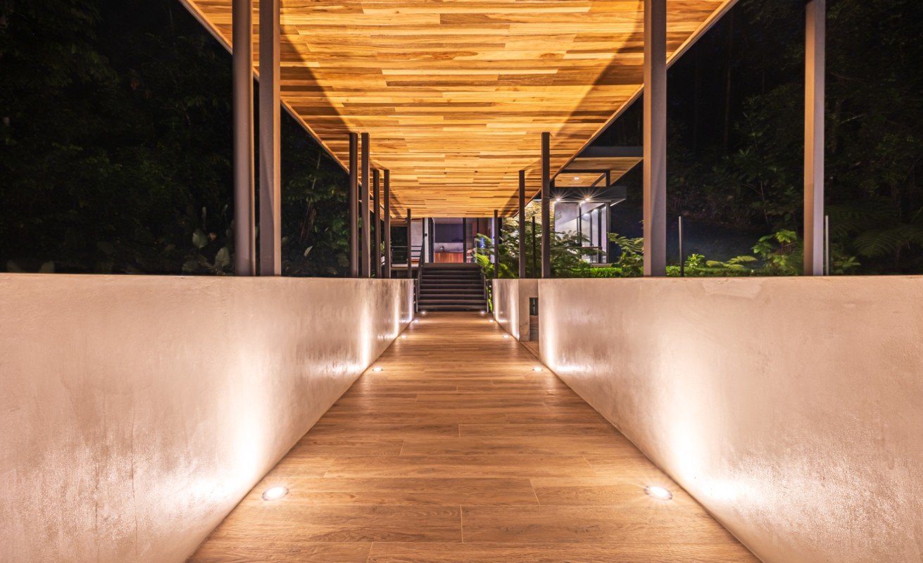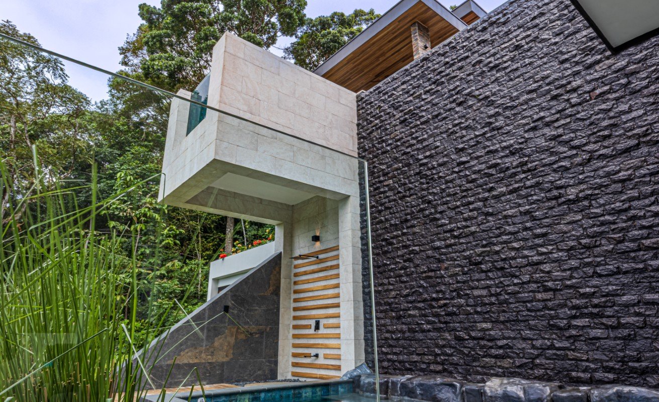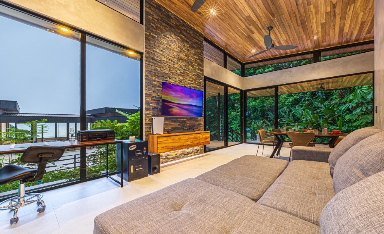 Perfect for entertaining or quiet reflection, the estate boasts multiple terraces, a built-in outdoor kitchen and barbecue, and a gas fireplace for cool mountain evenings. The infinity-edge pool appears to float above the rainforest canopy, with the Pacific Ocean shimmering in the distance.