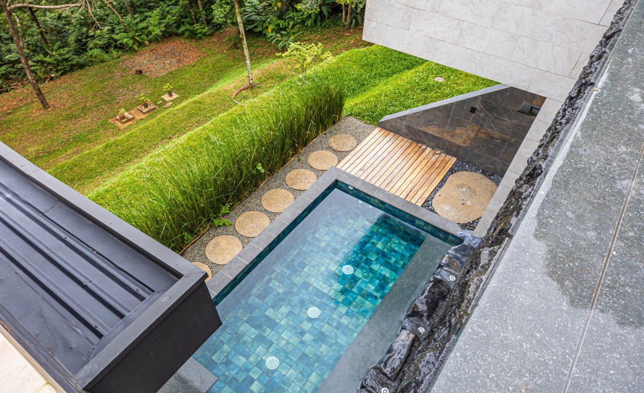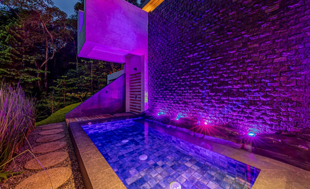Below the main home lies an independent guest suite, featuring a large bedroom, ensuite bath, full kitchen, and living area. A cascading waterfall from the infinity pool above spills into a private dipping pool, creating an unforgettable setting of tranquility and seclusion. In total, the estate can comfortably sleep 14 people.