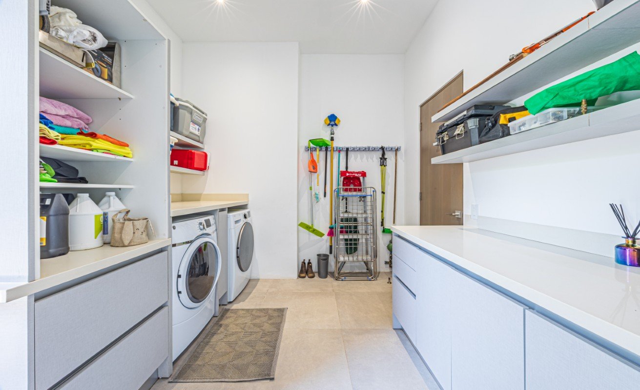 Sustainability complements design. The estate is equipped with solar panels paired with a brand-new Sol-Ark 15kW inverter and battery backup for essential systems, solar-heated domestic hot water, and a five-stage whole-house water filtration system with UV purification, softening, and reserve tanks. Fiber-optic internet ensures seamless connectivity, while a secure 24-hour gated entry with staffed guardhouse and full-time property management by Mabinsa provide complete peace of mind. A self-sustaining composting system enriches the tropical gardens, while a permeable paver driveway, covered carport, and bodega add understated practicality.