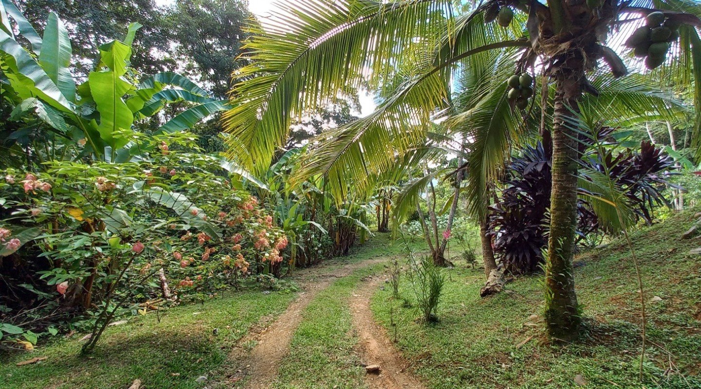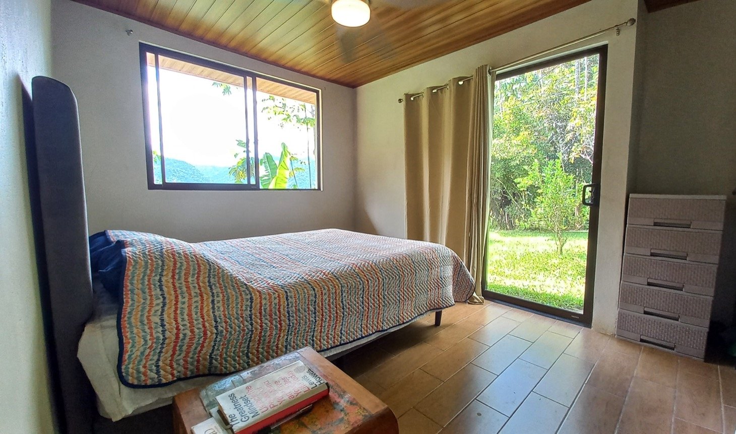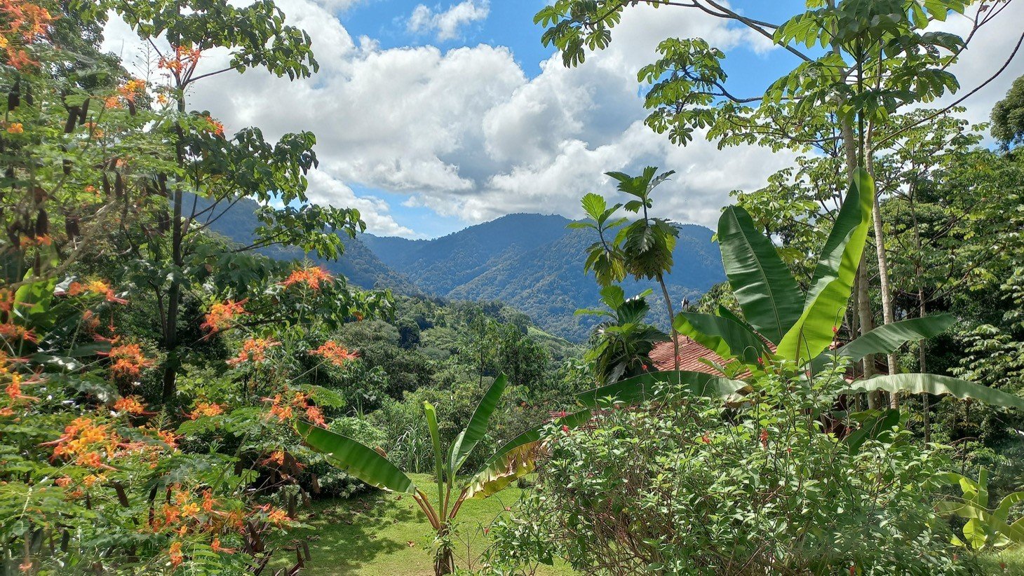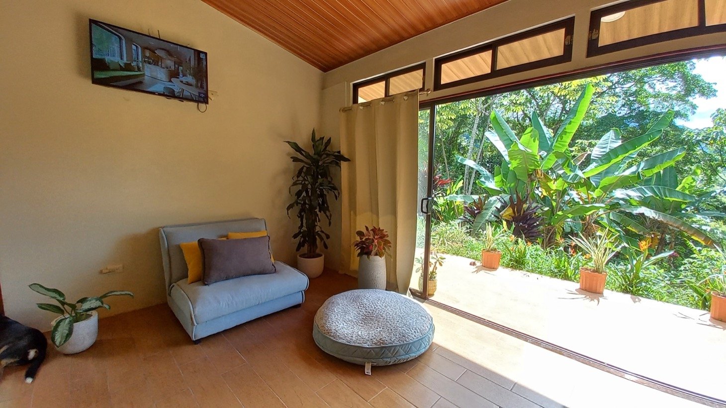 Perched above the village of Tres Rios, this sweet 2 bedroom, 2 bath home has lovely mountain views and fresh breezes 24/7. This 1.5 acre property is a gardeners’ delight, lushly landscaped with a wide variety of flowering bushes and mature fruit trees. The modest home is nicely furnished with fantastic views from the large mountain-facing terrace and master bedroom. A large, attached carport can accommodate a couple of vehicles, while a laundry station on the backside of the home. Plenty of space to string up your hammock or build a yoga deck