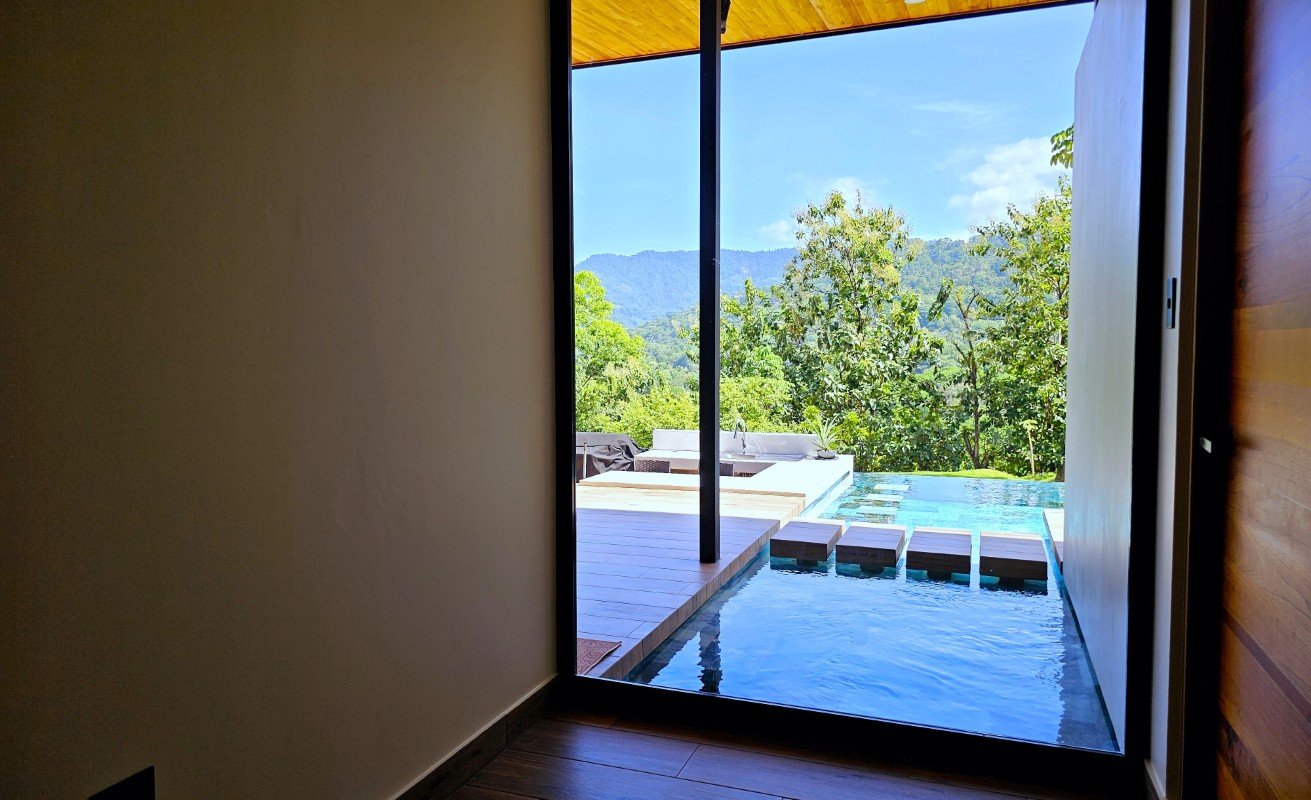 Step outside, and the lifestyle flows naturally. The pool is finished with natural-toned tiles in shades of blue and stone, creating a shimmering effect that makes the water appear turquoise — a beautiful contrast against the surrounding green views. It features multi-color lighting, a heated water system, bar stools, and a wet bar with built-in grill. A custom-built cenizaro wood dining table comfortably seats eight in the covered outdoor space, perfect for gathering and entertaining.The master bedroom and living room both open directly to the pool. Just outside, four floating concrete steps connect the front patio of the master suite to the living room patio and BBQ area — forming a small bridge that crosses over a shallow end of the pool. This clever architectural detail gives the impression that the pool partially enters the home, and also creates a safe shallow section that could be ideal as a children’s splash area.