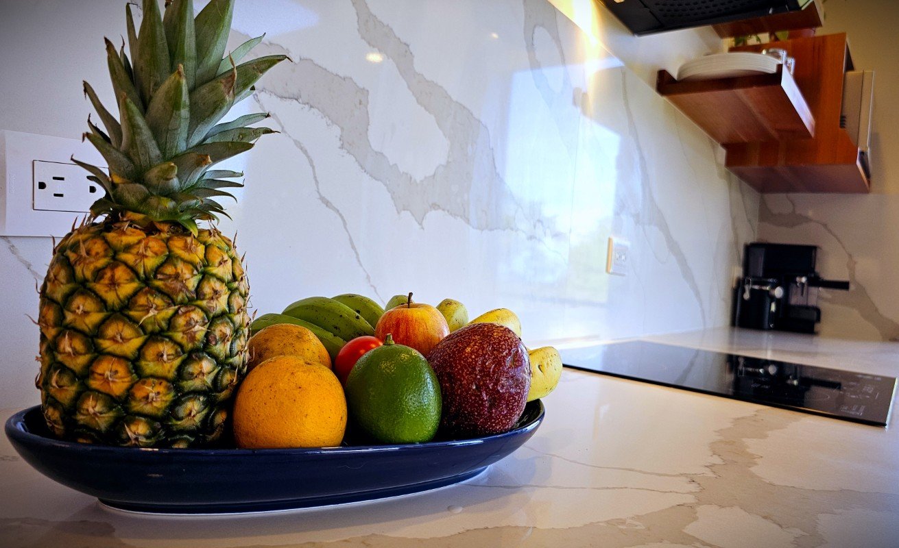 Inside, the home is fully furnished and ready to move in. It features custom cabinetry made from locally sourced cedar, teak, and cenizaro woods, and a large kitchen island (11 feet long) with quartz countertops, high-end appliances, and storage. There are two king-sized bedrooms, a sleep sofa in the living room, two bathrooms, and a dedicated laundry area with washer and dryer. Every detail — from the electric blinds and smart door lock to the amplified ceiling audio system and porcelain wood-look tiles — speaks to quality and ease of maintenance.