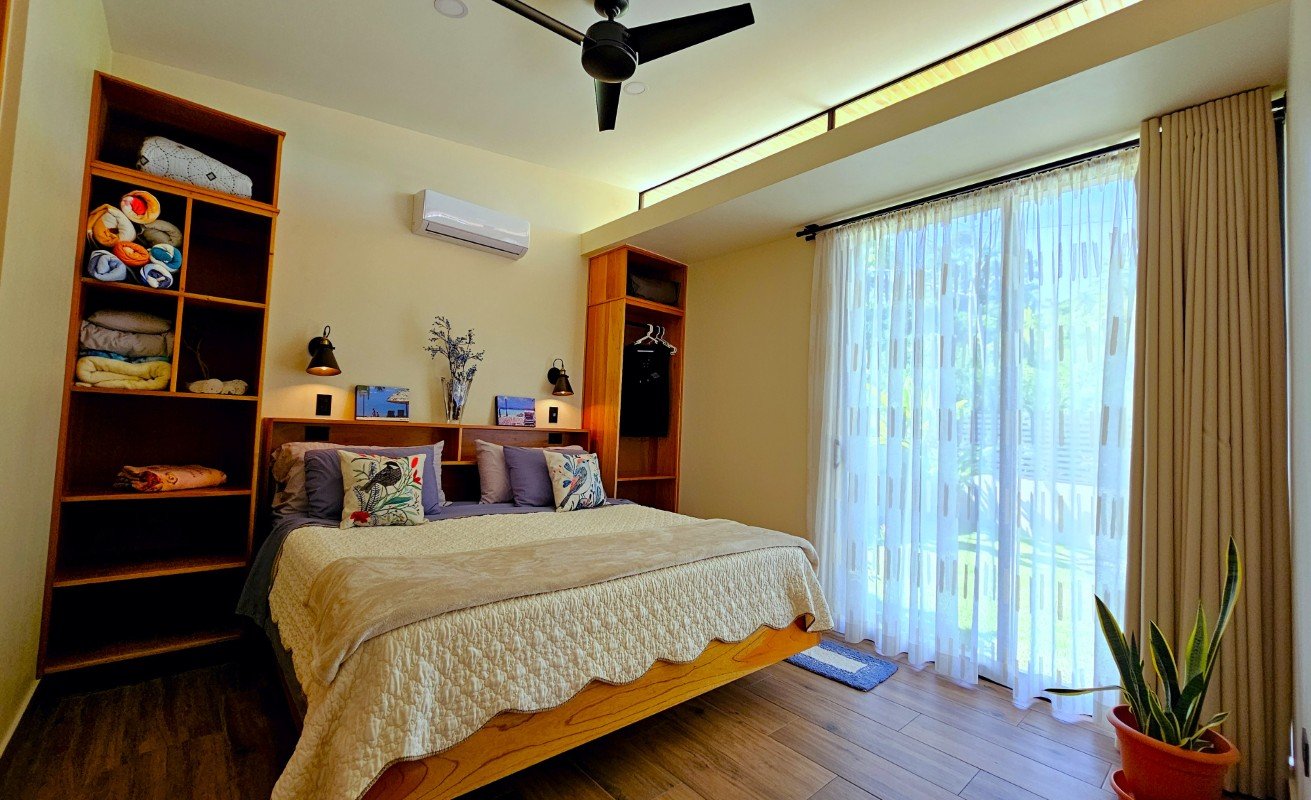 The original design included louver-style clerestory windows (now fixed but still functional for light), creating a clean, well-lit interior. Every room includes mosquito screens and air conditioning, though the natural ventilation makes A/C optional for much of the year.