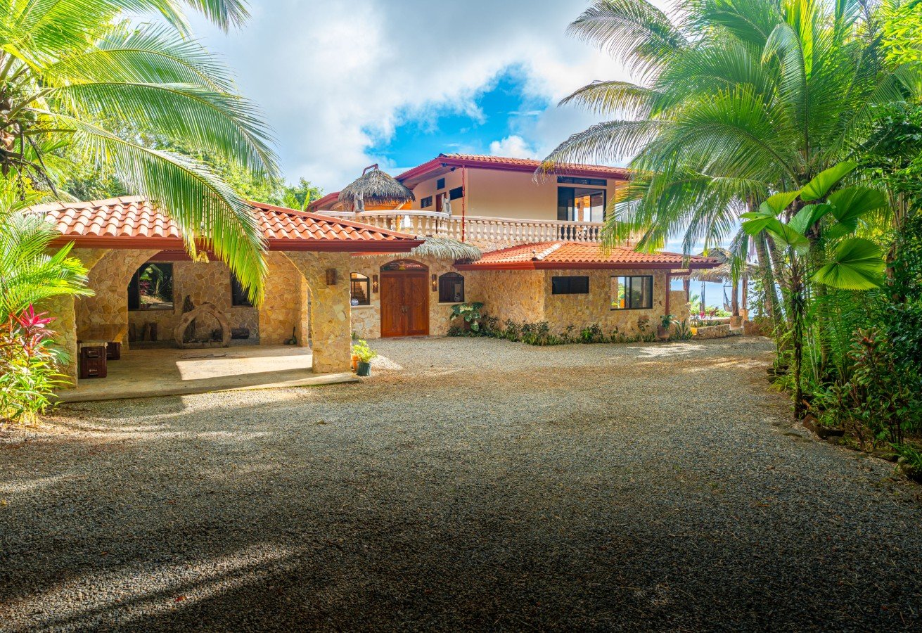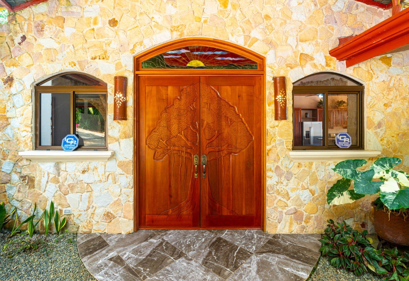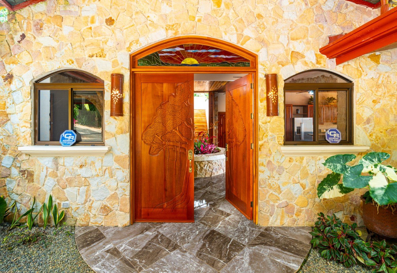 As you approach this enchanting estate, you are greeted by the sight of a beautiful stone exterior, crowned by a roof of low-maintenance Teja Real tiles that keep the home cool and comfortable year-round. A private hardwood gate opens to reveal a driveway lined with swaying palm trees, pineapples, and vibrant tropical flowers, guiding you to the entrance of this dream home.