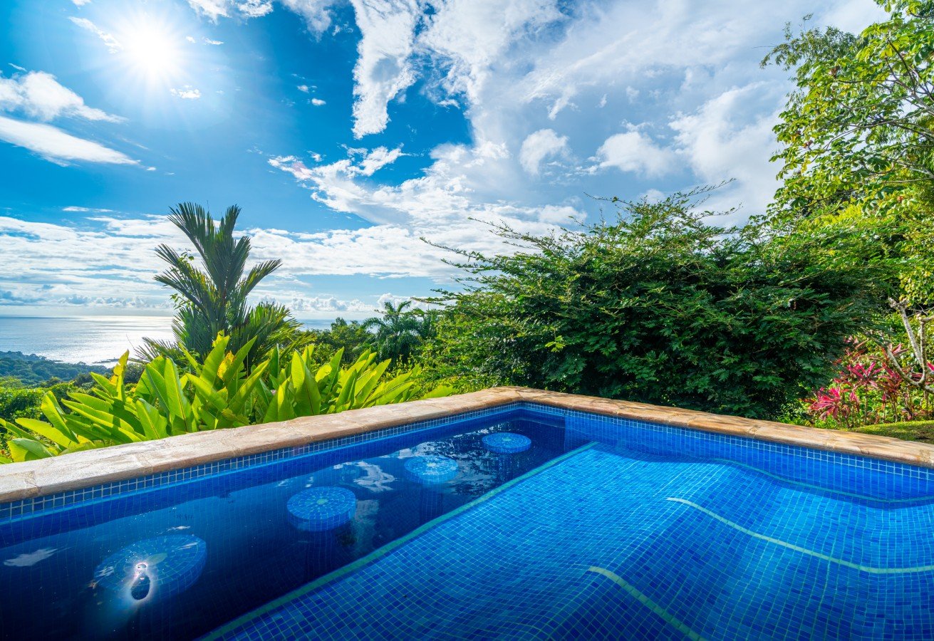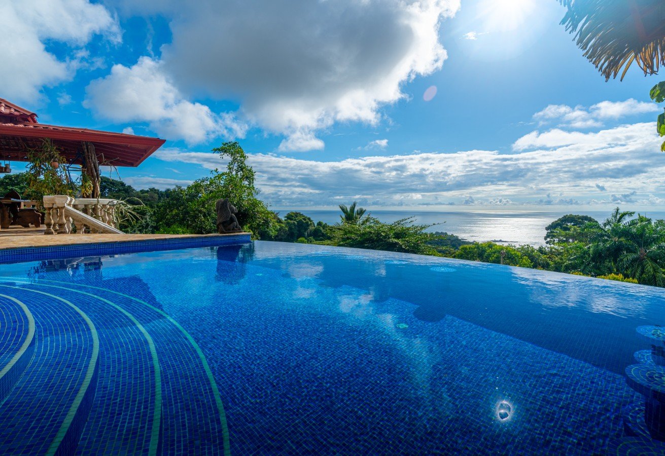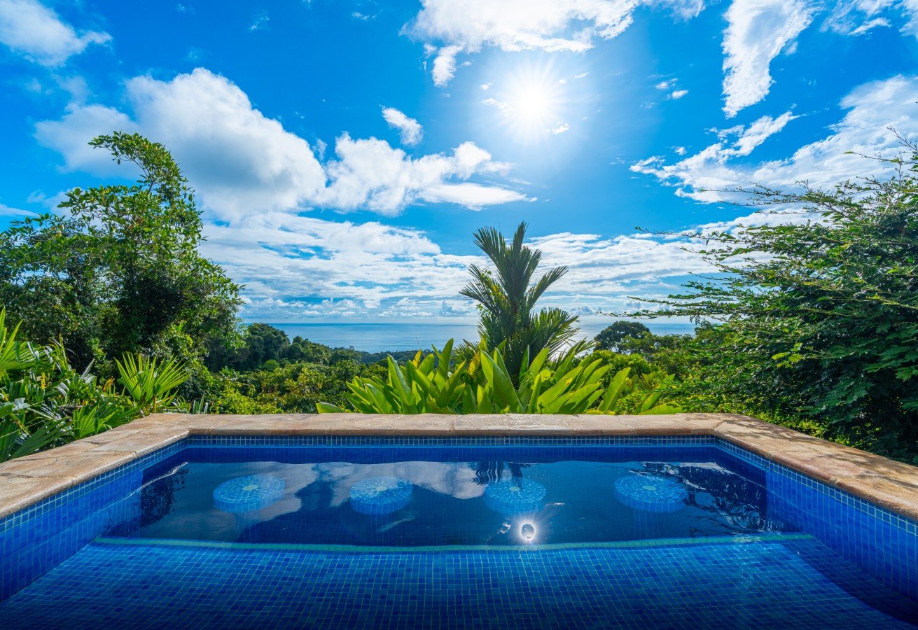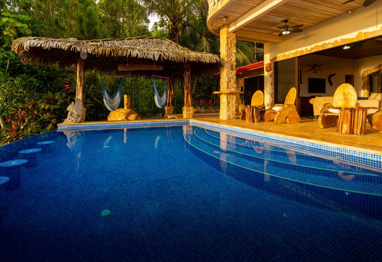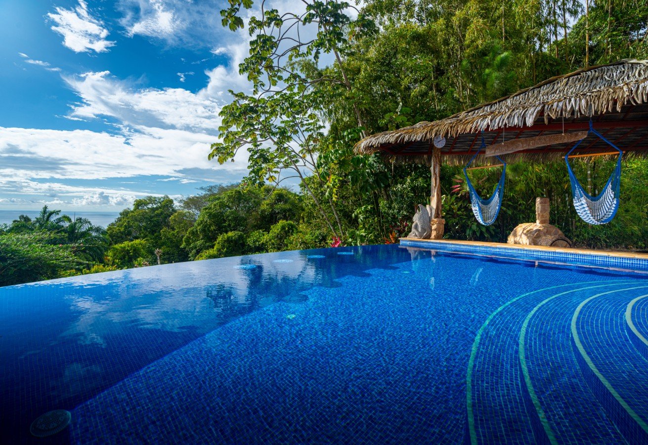 One of the estate's most enchanting features is the outdoor living space. The infinity-edge pool, tiled in a vibrant blue that mirrors the sky and ocean, is the perfect place to unwind as you watch whales breach in the distance or marvel at the playful antics of monkeys and sloths in the surrounding trees. The pool is complemented by a hot tub lounge, where you can relax under the stars, feeling the warmth of the water and the coolness of the mountain breeze.