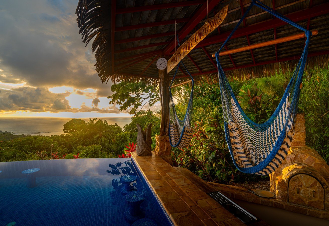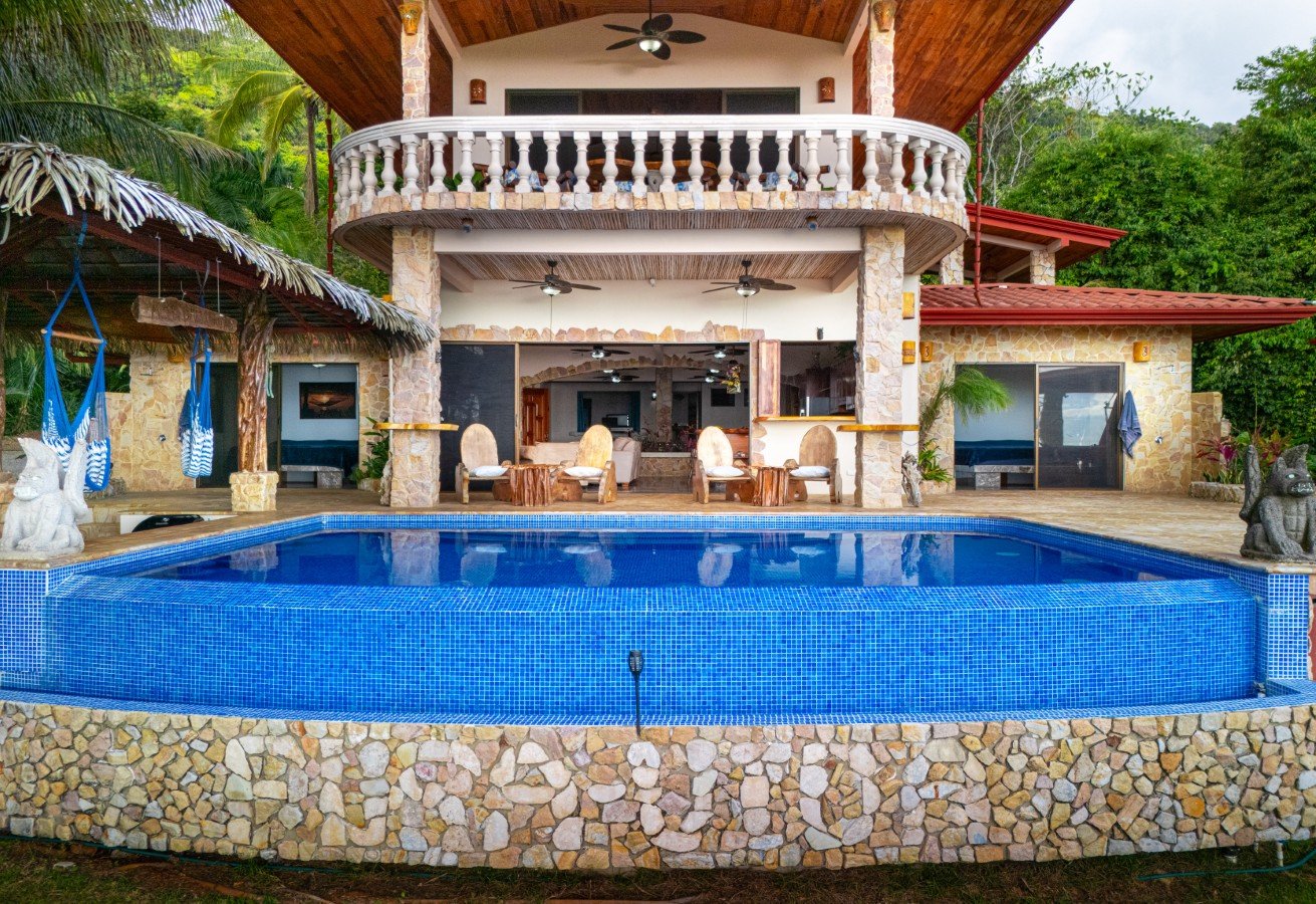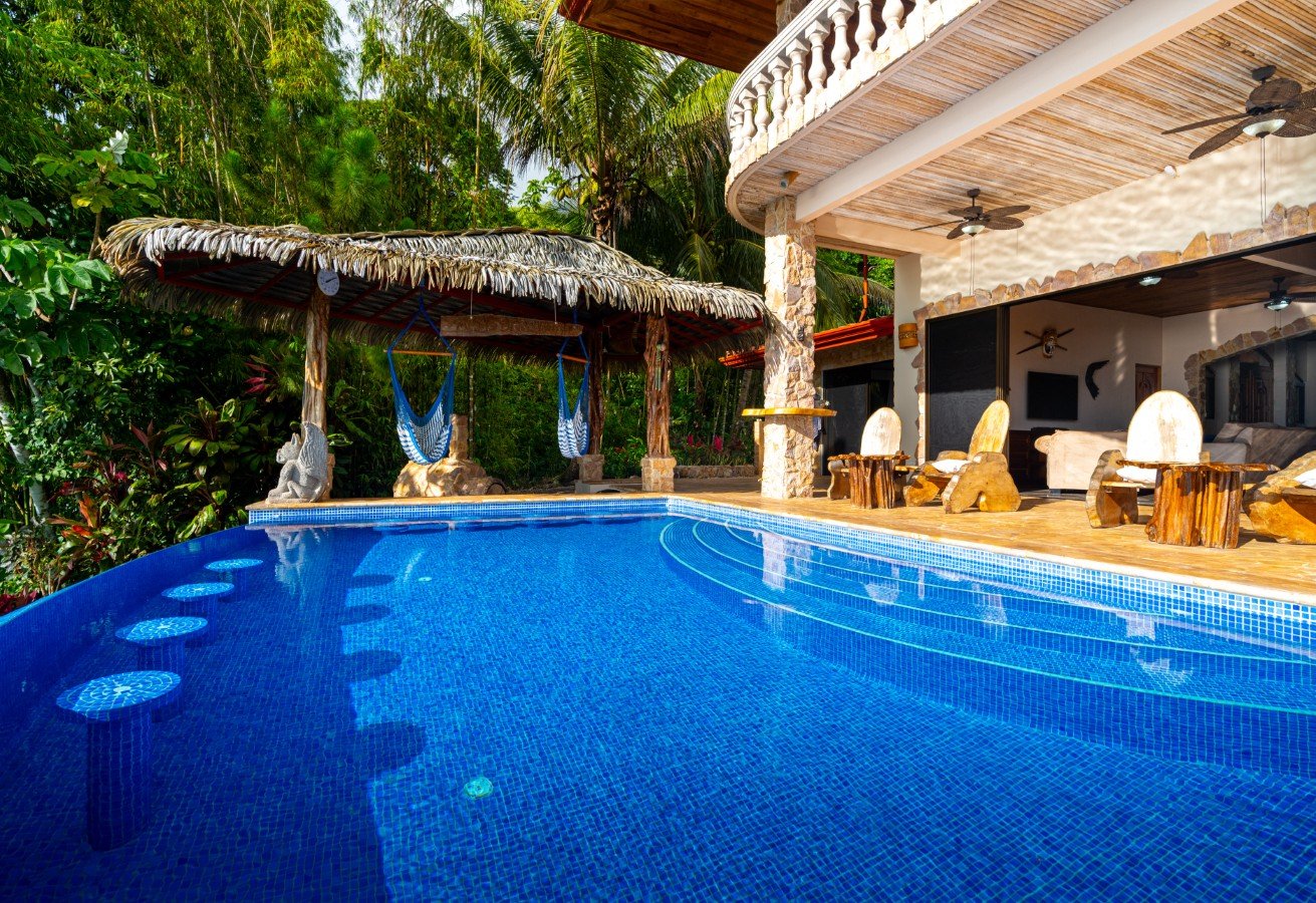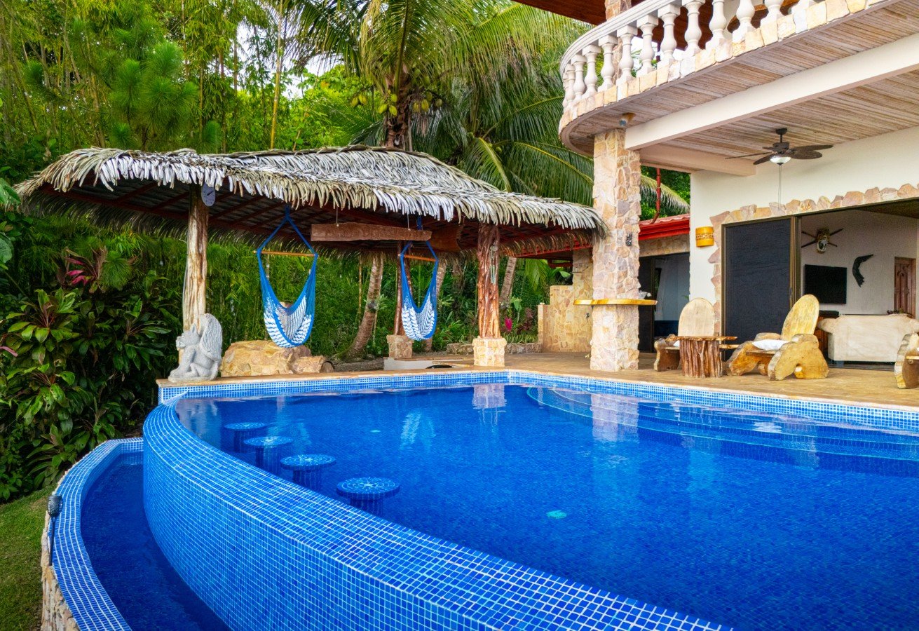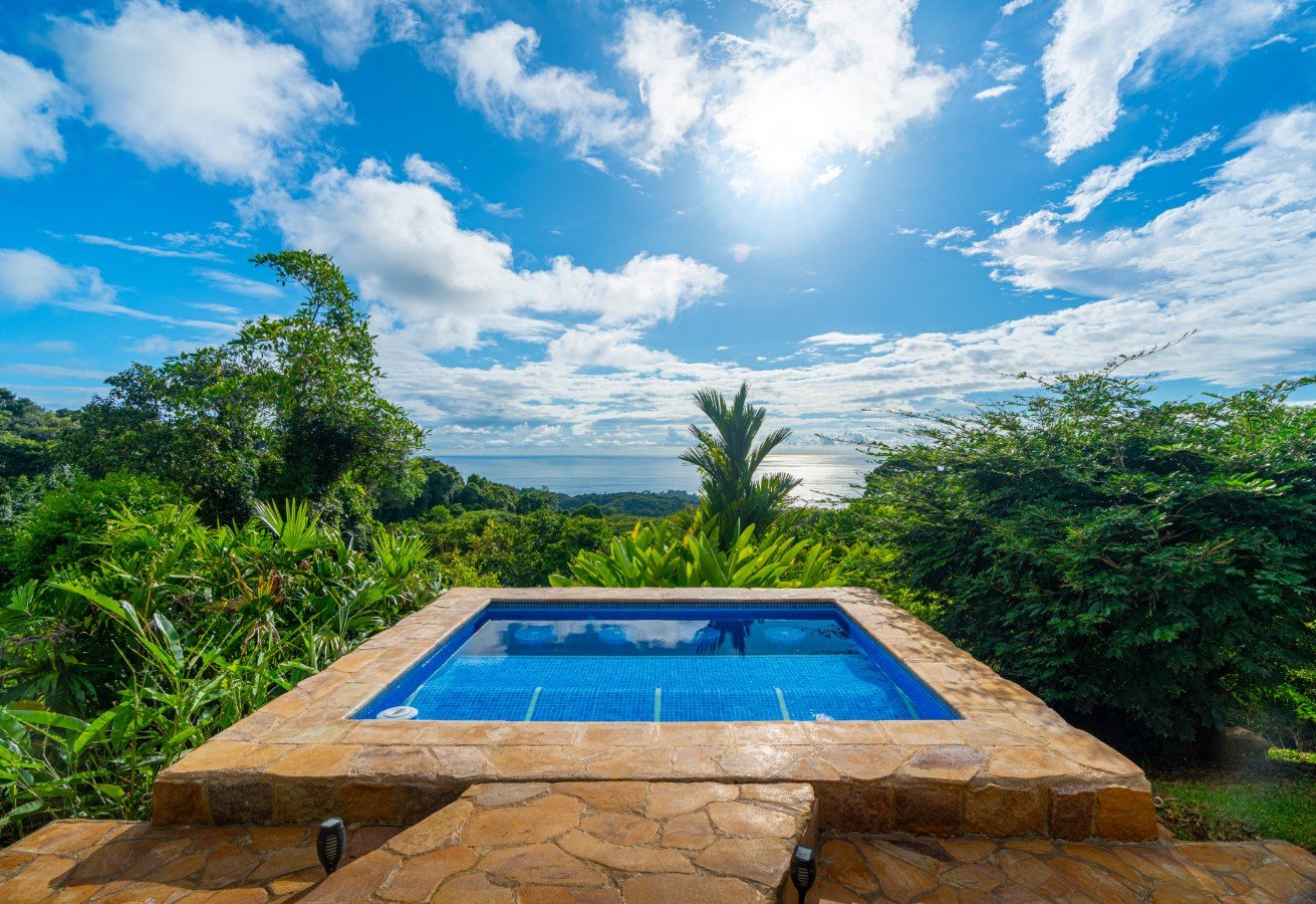 One of the estate's most enchanting features is the outdoor living space. The infinity-edge pool, tiled in a vibrant blue that mirrors the sky and ocean, is the perfect place to unwind as you watch whales breach in the distance or marvel at the playful antics of monkeys and sloths in the surrounding trees. The pool is complemented by a hot tub lounge, where you can relax under the stars, feeling the warmth of the water and the coolness of the mountain breeze.