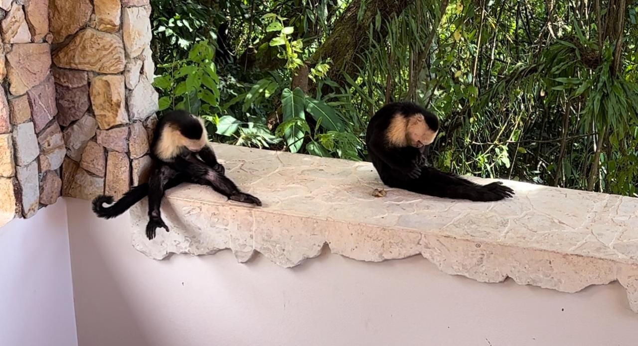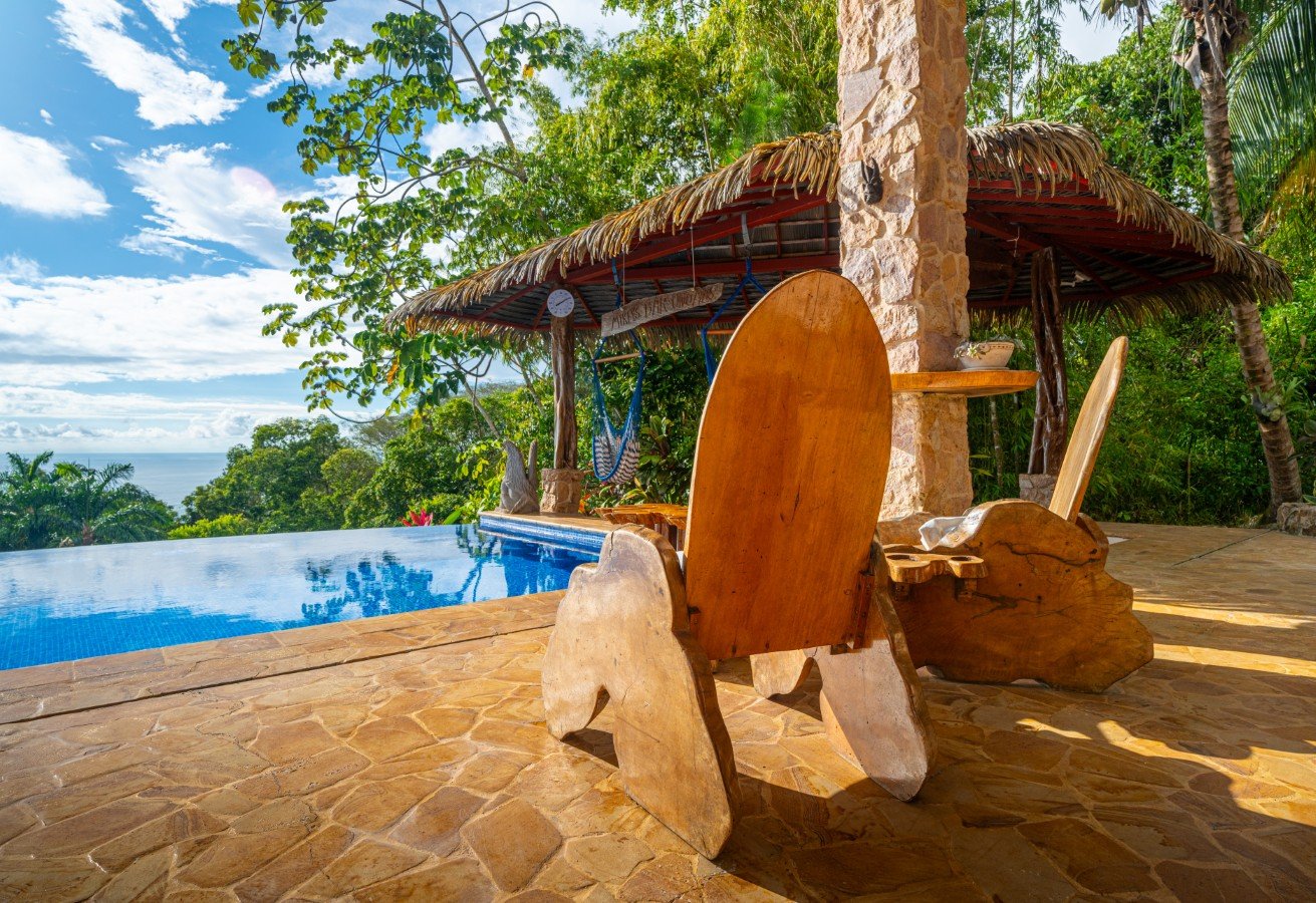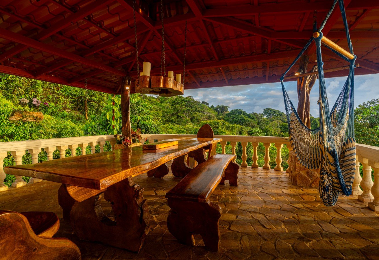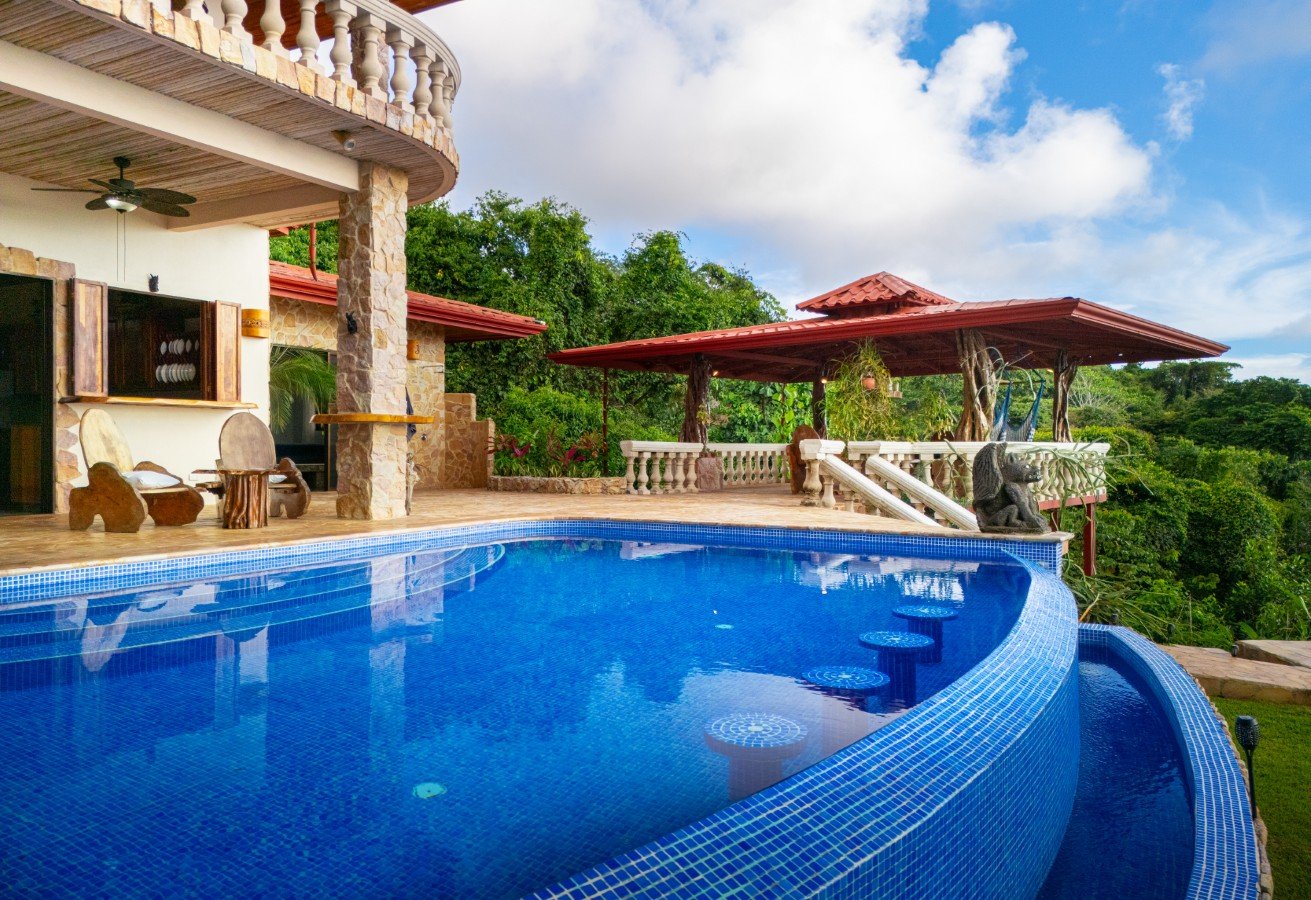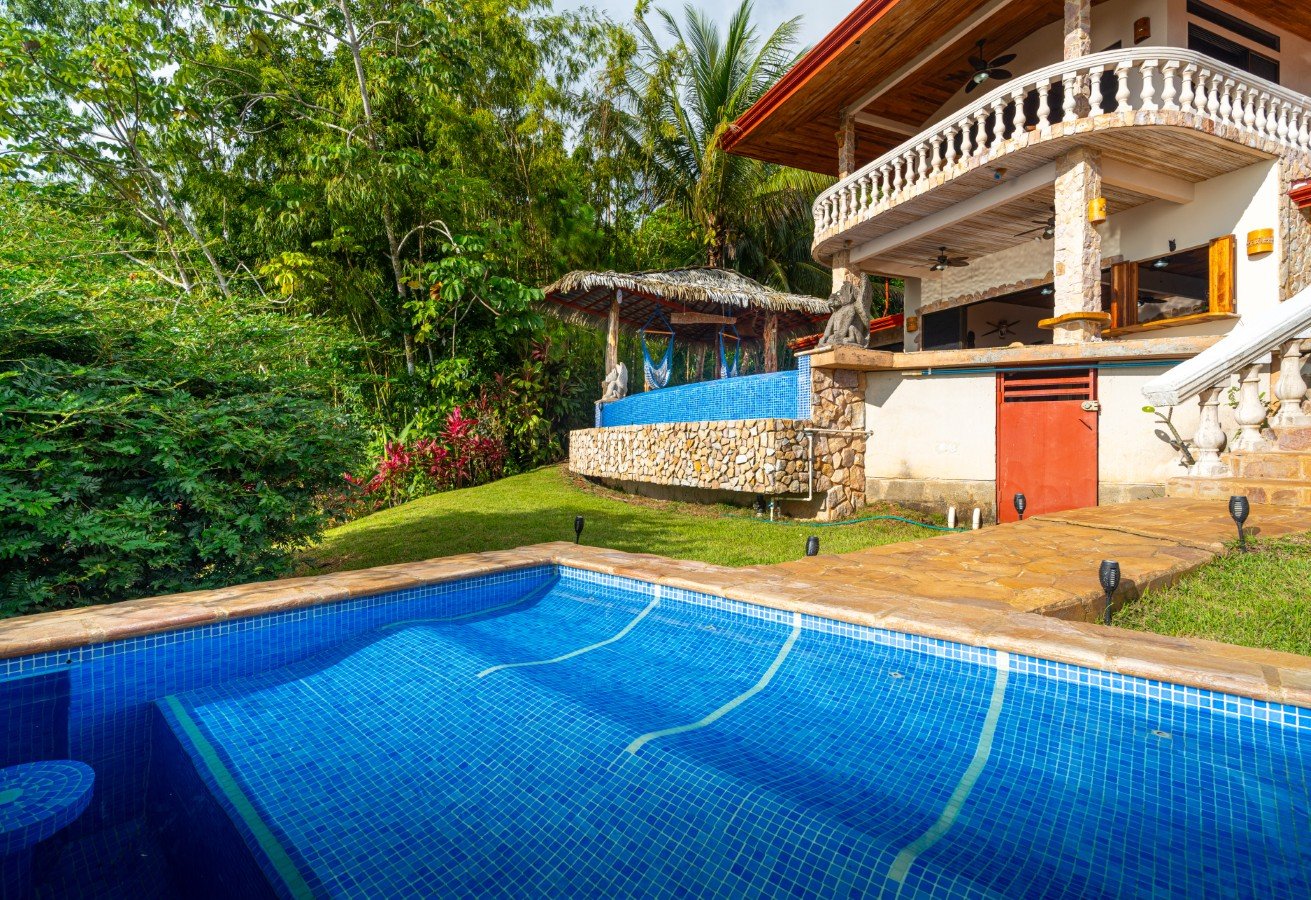 One of the estate's most enchanting features is the outdoor living space. The infinity-edge pool, tiled in a vibrant blue that mirrors the sky and ocean, is the perfect place to unwind as you watch whales breach in the distance or marvel at the playful antics of monkeys and sloths in the surrounding trees. The pool is complemented by a hot tub lounge, where you can relax under the stars, feeling the warmth of the water and the coolness of the mountain breeze.
