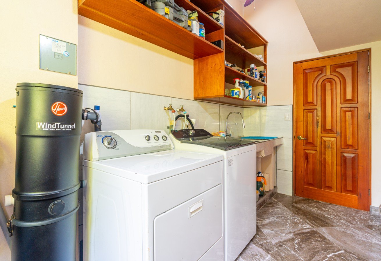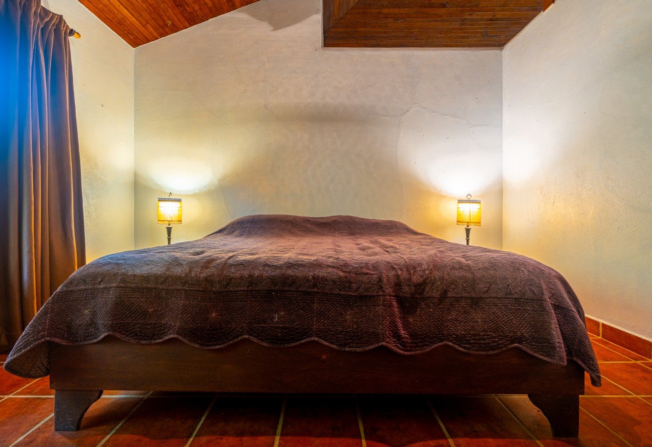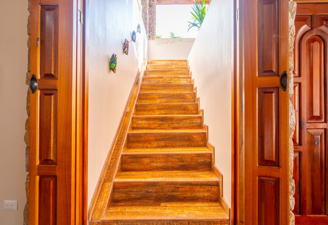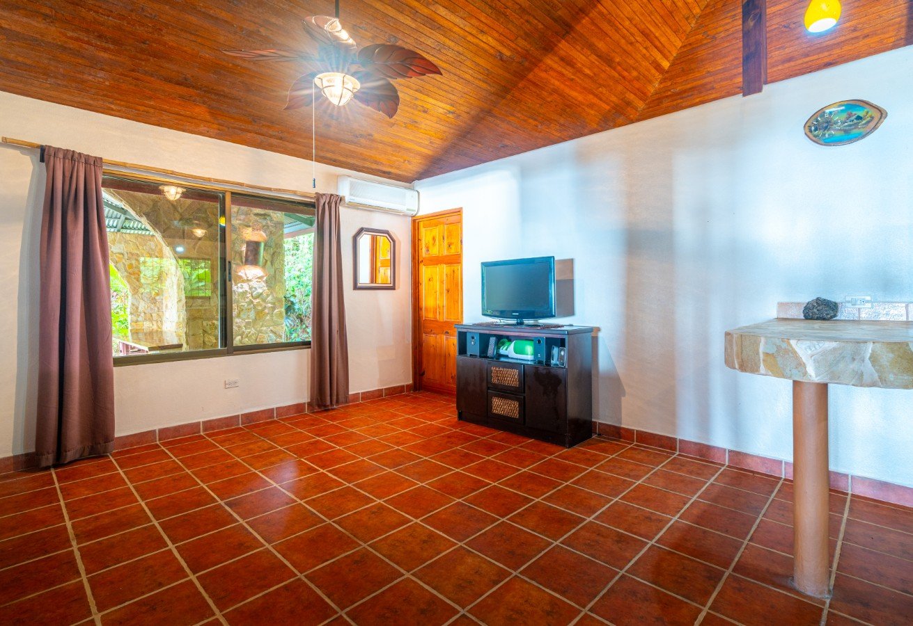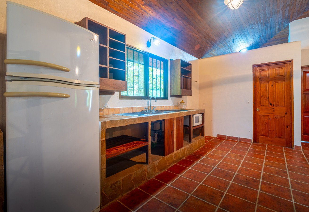 Step inside, and you are immediately embraced by a sense of warmth and tranquility. The heart of the home is an open-concept living space, where elegant marble-accented tiles from Spain meet the rich warmth of tropical hardwood ceilings. Here, the living room and kitchen flow seamlessly into one another, creating a space that is both inviting and sophisticated. The centerpiece of the kitchen is a massive island, hewn from a single piece of Costa Rican Cenizero wood, offering not just a place to prepare meals, but a gathering spot where stories are shared and memories are made.