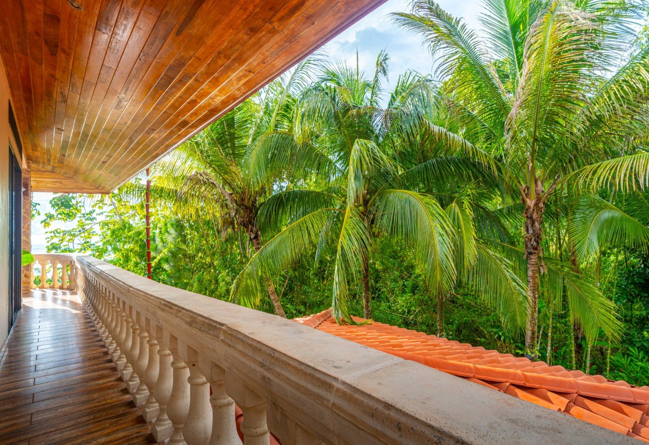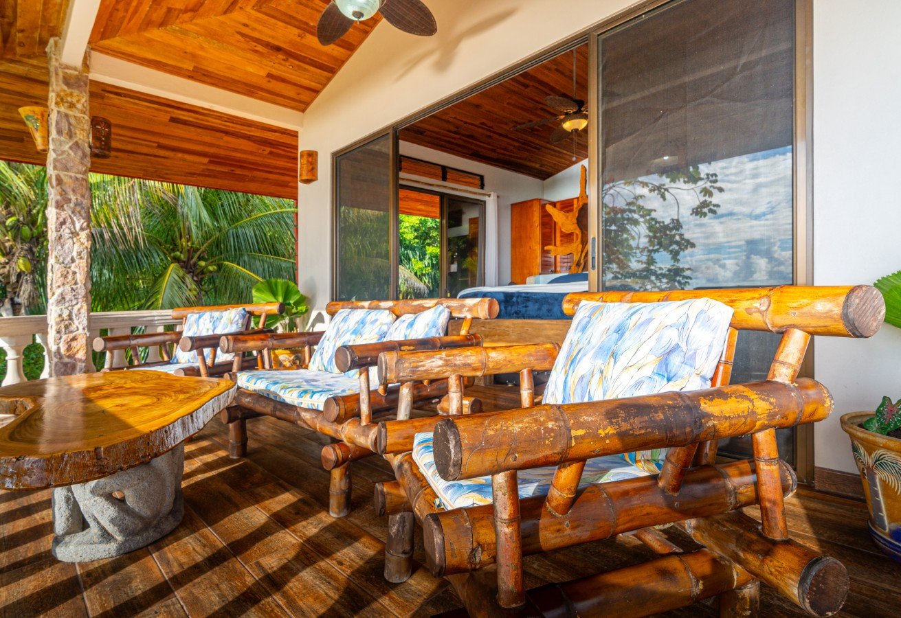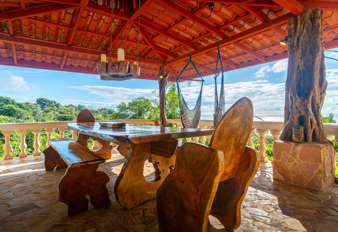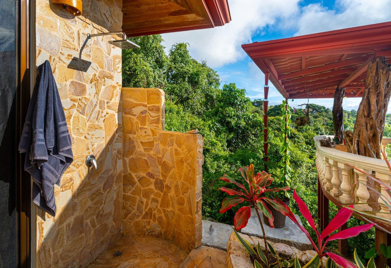As you ascend to the rooftop terrace, you are greeted by sweeping views of the jungle and ocean, a perfect spot for entertaining or simply enjoying a quiet moment with a glass of wine. The terrace is adorned with Coralina fossil rock ledges and features a round-tabled lounging area shaded by a Palmex umbrella, offering a serene space to relax and soak in the beauty of Costa Rica.