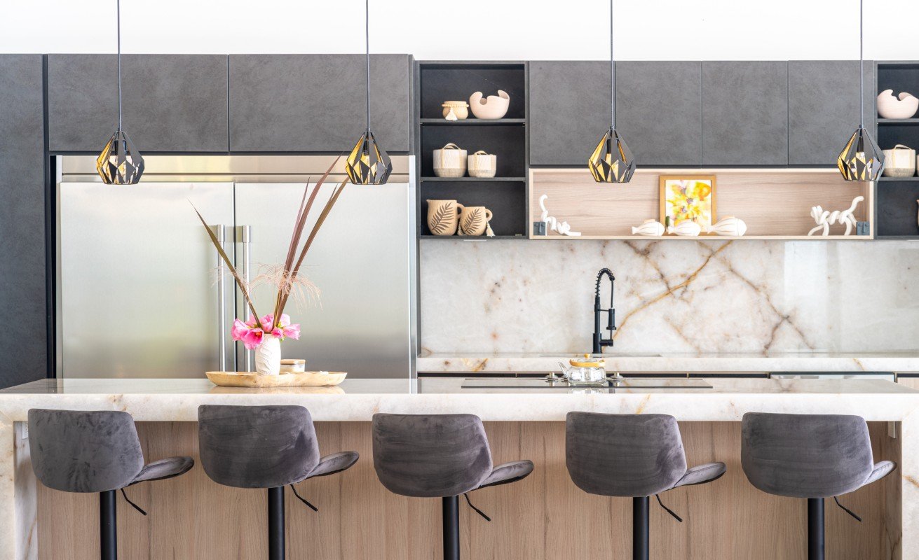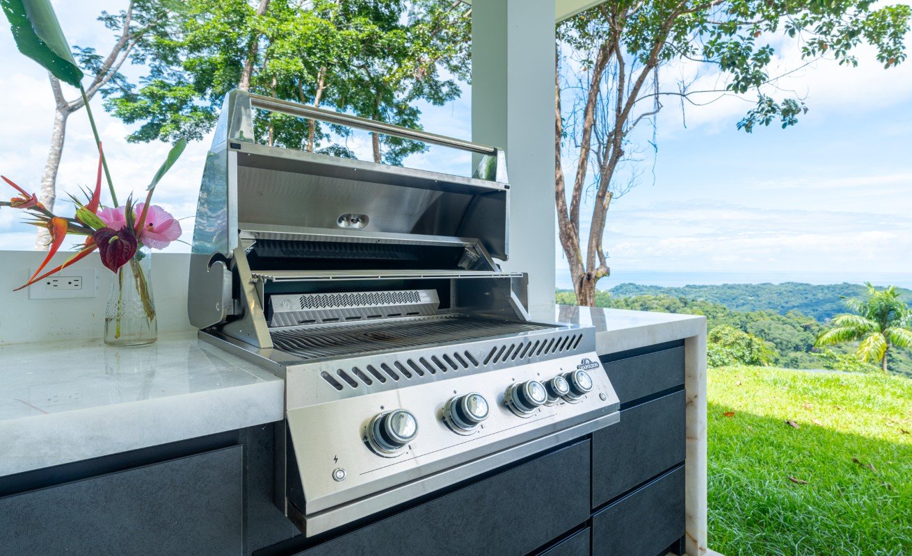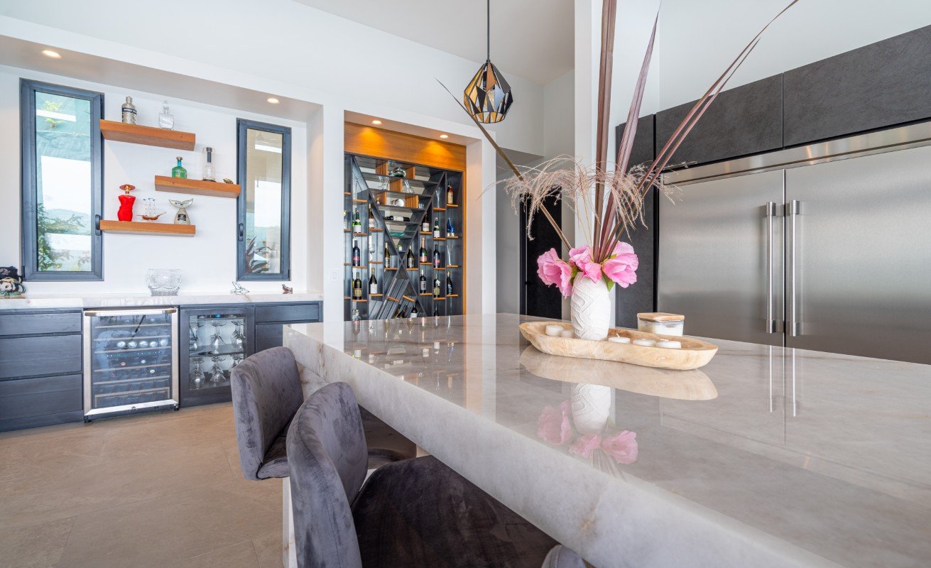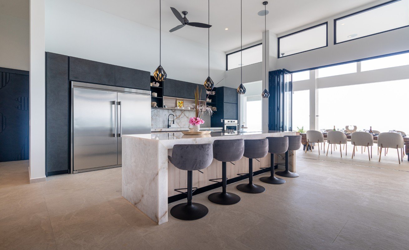 - The chef’s kitchen flows into expansive indoor-outdoor living spaces, ideal for alfresco dining or sunset cocktails.