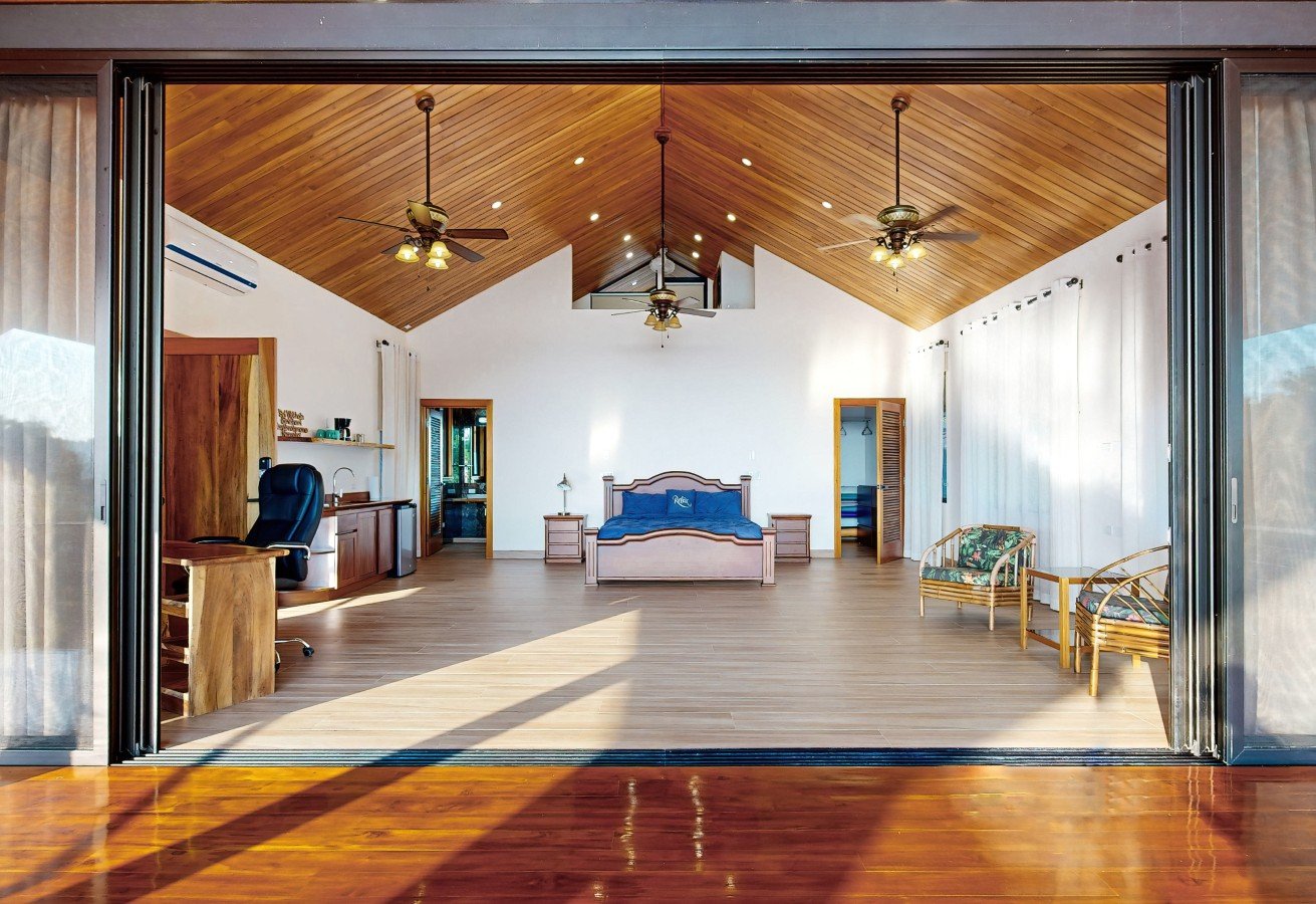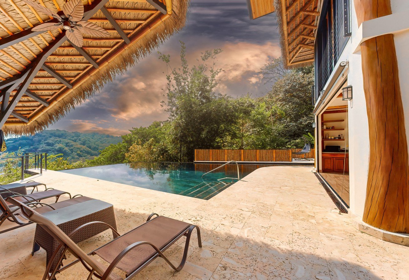 The entry level unveils a flexible studio apartment, ingeniously designed with a full-size Murphy bed to optimize the space. Culinary adventures await in the well-appointed kitchen, showcasing a striking live-edge bar complemented by bespoke bamboo stools and equipped with modern conveniences, ensuring complete independence for visiting guests. Walls of glass, courtesy of accordion sliding doors, blur the lines between indoors and out, leading to a covered outdoor lounge with a Palapa roof crafted from Palmex and a stunning infinity pool, all poised to capture the breathtaking panorama of the Pacific’s azure expanse and the verdant tapestry of the surrounding mountains.