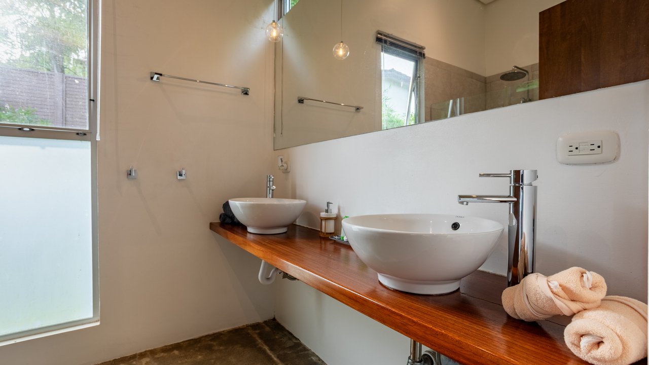 King-size bed, spacious closet, and a luxurious ensuite bathroom with a double vanity, wooden countertop, and a shower overlooking the ocean.