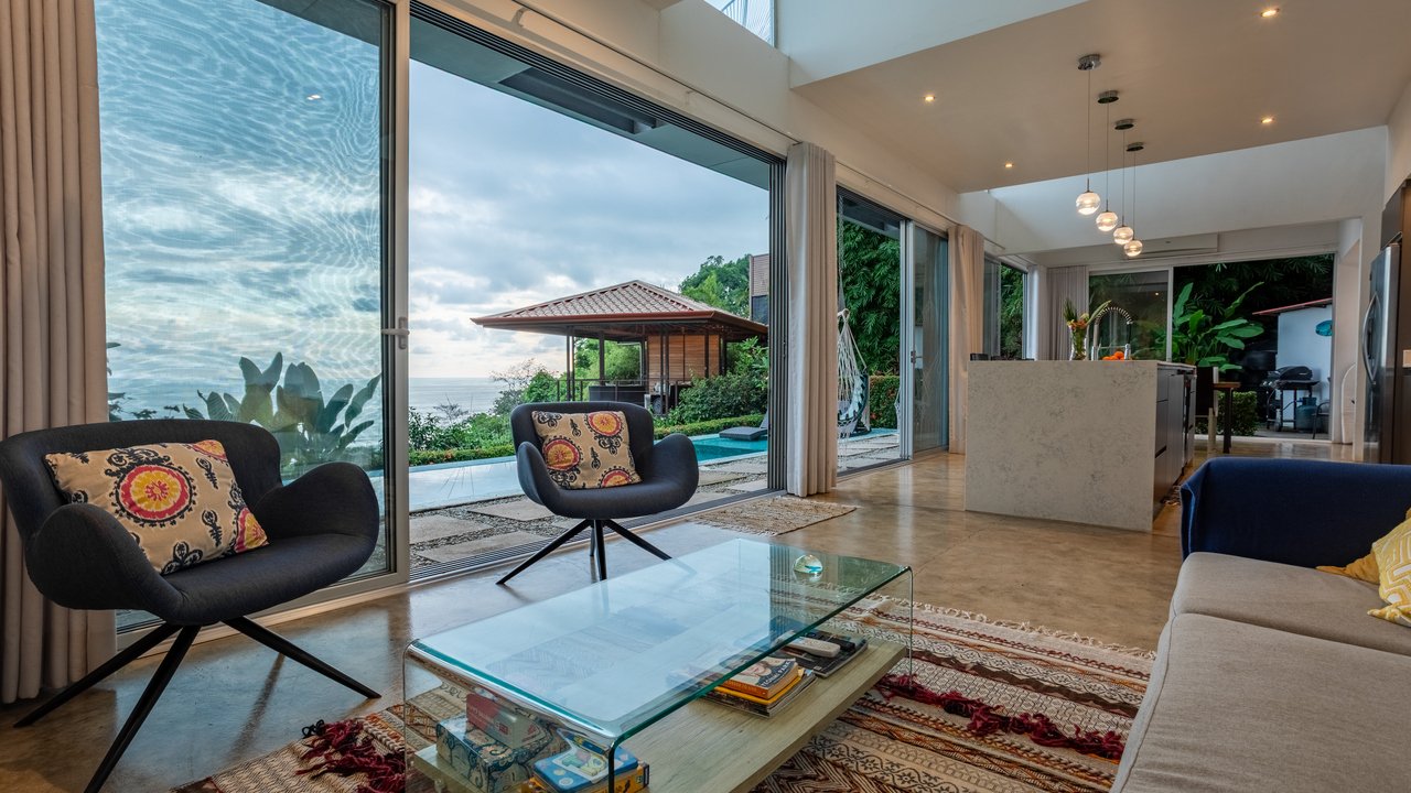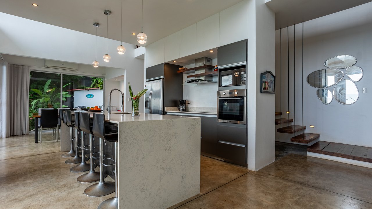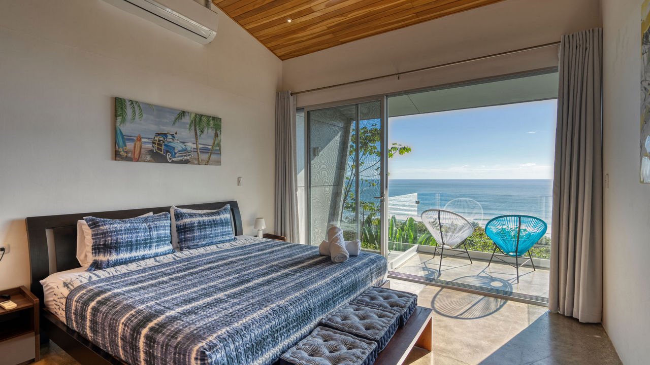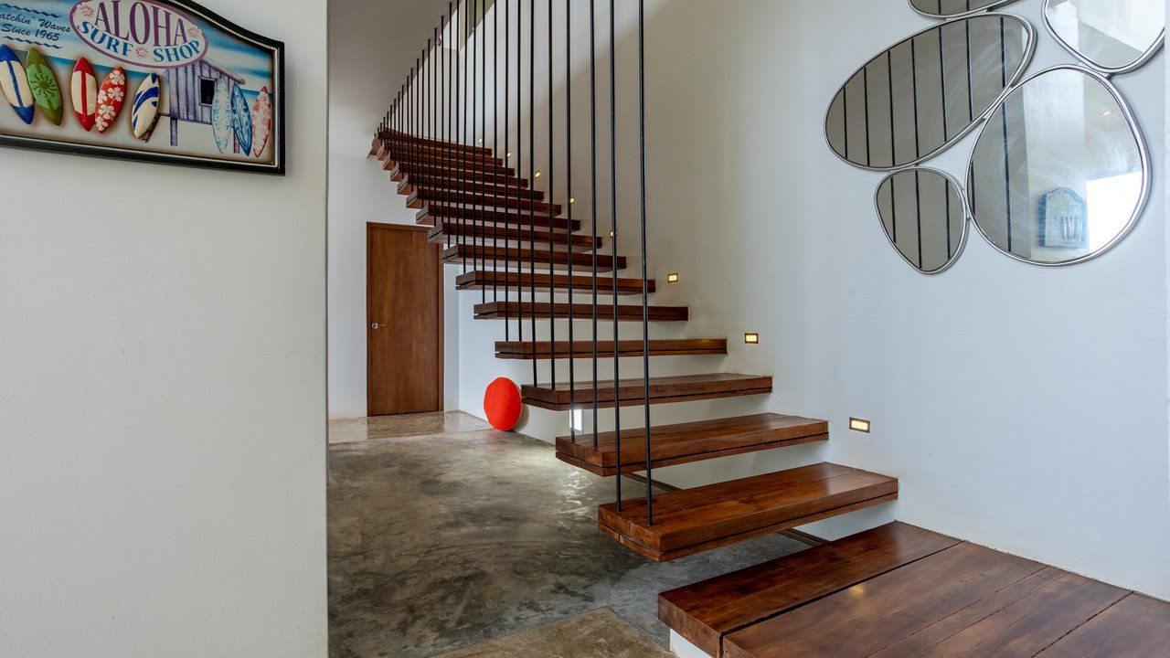 A wooden staircase leads to three beautifully appointed, air-conditioned bedrooms, each with its balcony and stunning ocean views right from the bed.