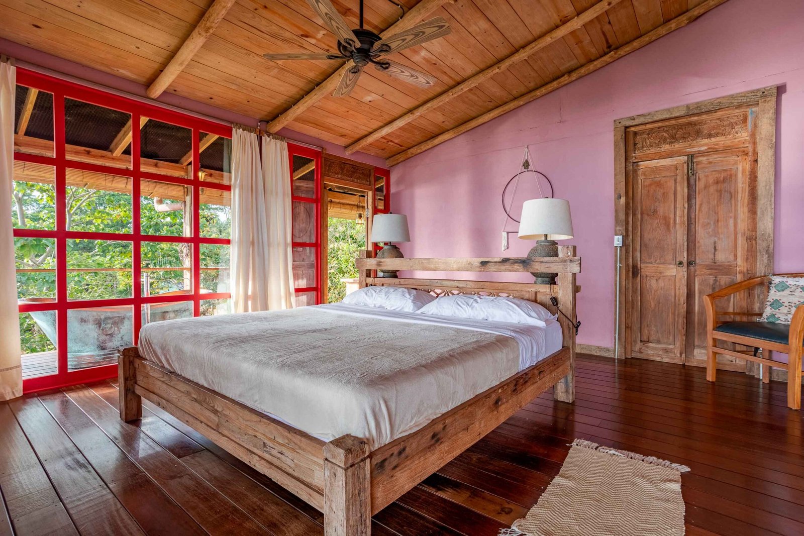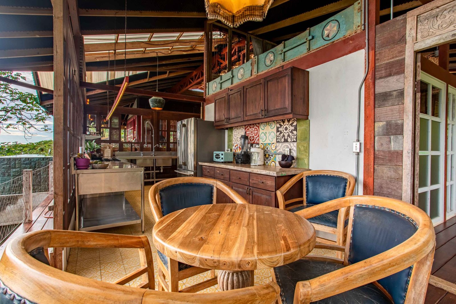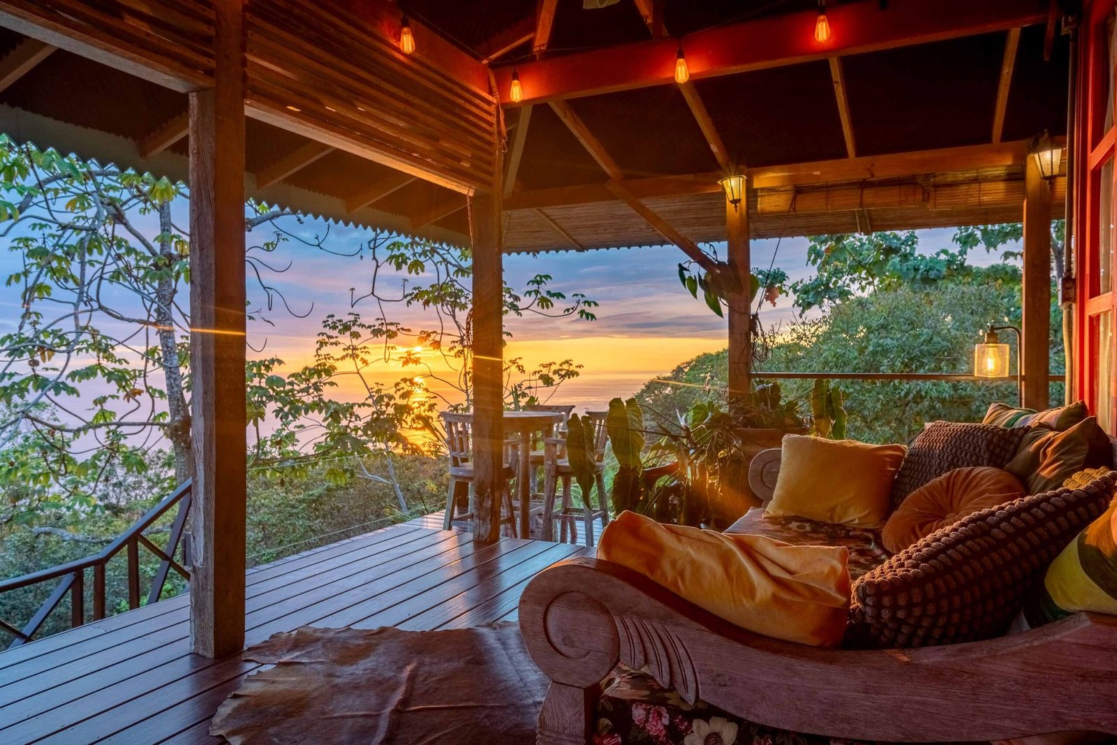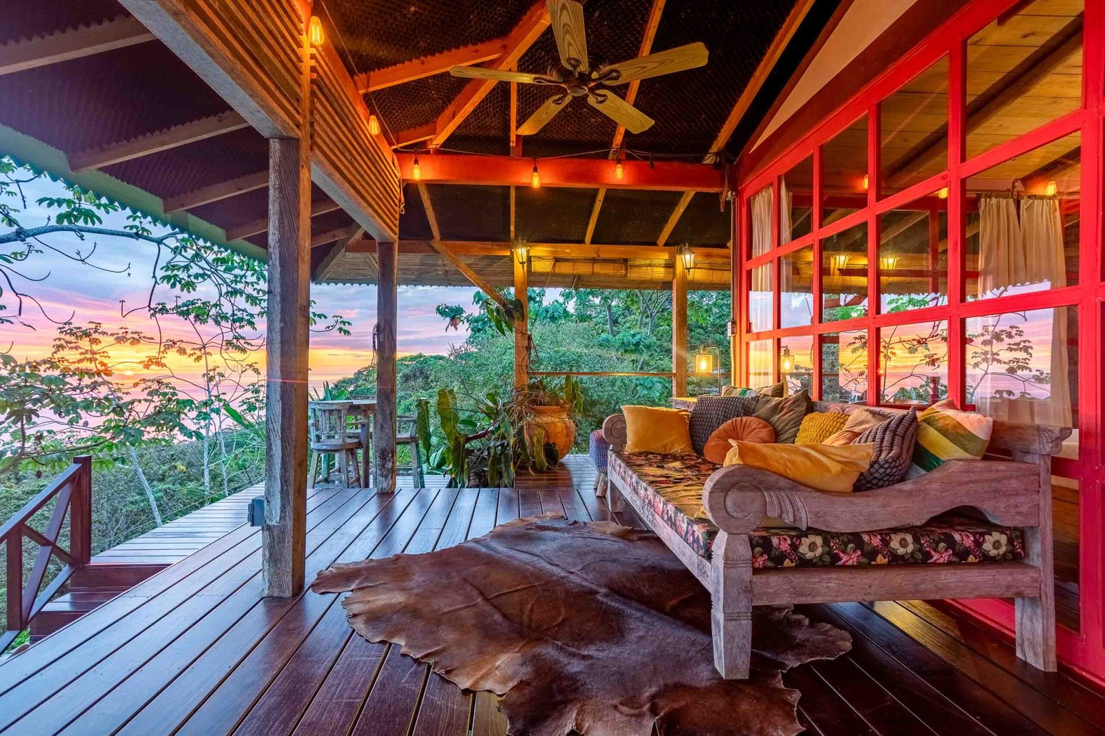 The residence reflects a curated blend of craftsmanship, imported materials, and historic character. Hardwood floors made of guapinol (Brazilian cherry) set a warm foundational tone, while handcrafted shutters built from Indonesian hardwoods—many reclaimed antiques from Java more than a century old—add depth and cultural richness. At the heart of the home, an indoor pool anchors the main living area and opens onto wrap-around terraces that frame the surrounding rainforest. A suspended designer fireplace imported from France elevates the evening atmosphere, and an antique standalone soaking tub off the primary suite creates a serene vantage point for enjoying the shifting colors of the sunset.