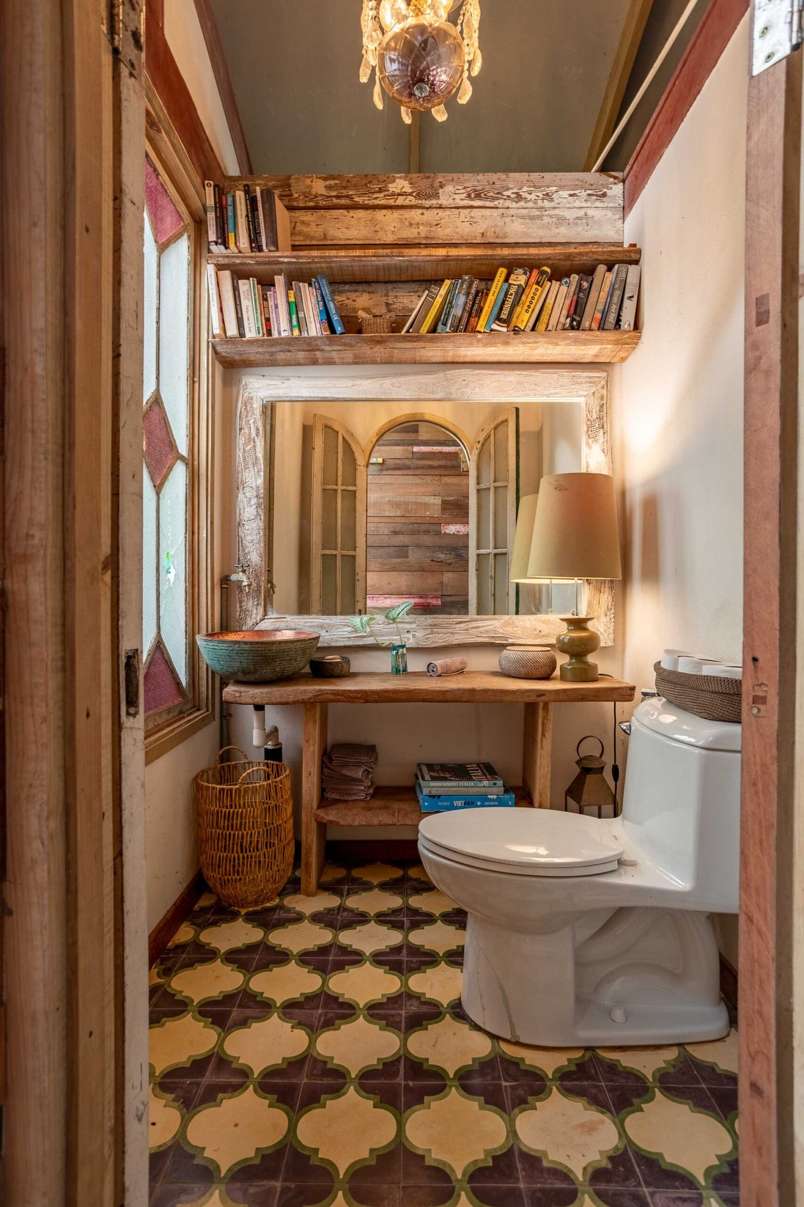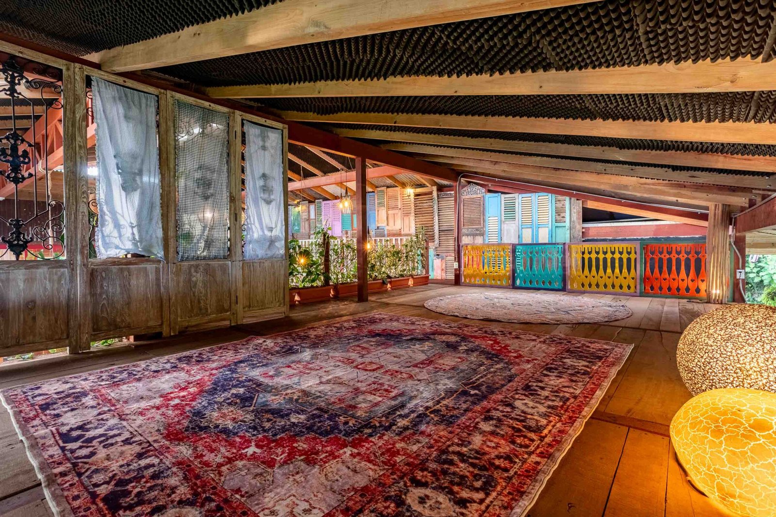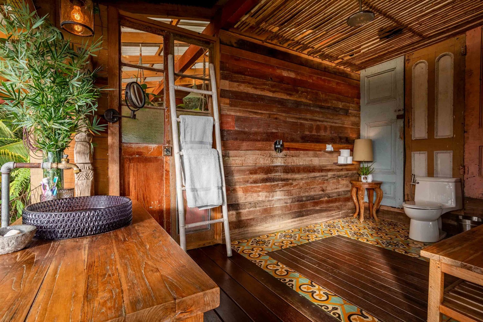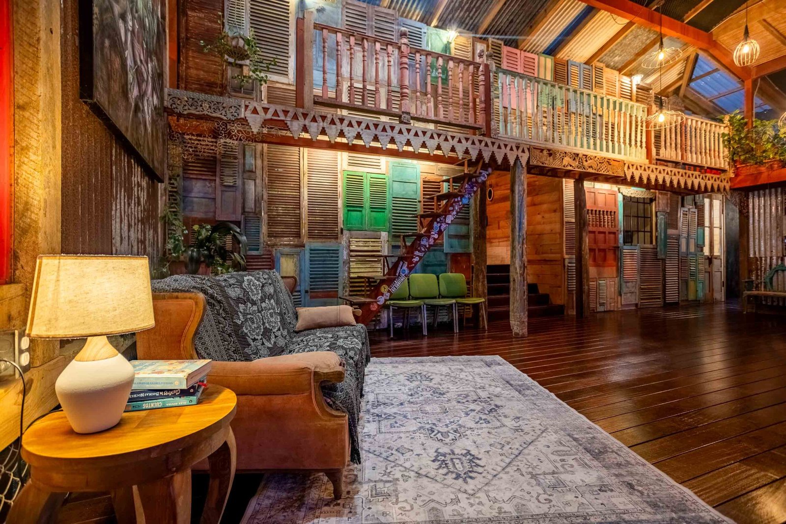 The residence reflects a curated blend of craftsmanship, imported materials, and historic character. Hardwood floors made of guapinol (Brazilian cherry) set a warm foundational tone, while handcrafted shutters built from Indonesian hardwoods—many reclaimed antiques from Java more than a century old—add depth and cultural richness. At the heart of the home, an indoor pool anchors the main living area and opens onto wrap-around terraces that frame the surrounding rainforest. A suspended designer fireplace imported from France elevates the evening atmosphere, and an antique standalone soaking tub off the primary suite creates a serene vantage point for enjoying the shifting colors of the sunset.