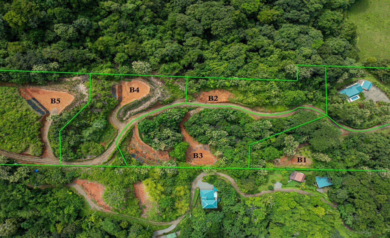 As you turn off the main road, the gated entrance to Tulpa Ridge welcomes you. The first three lots (B2, B3, and B4) are completely flat, 100% usable, with secondary forest and teak plantations, making them ideal for building. Lot B5 already has a house built, which is also for sale.
