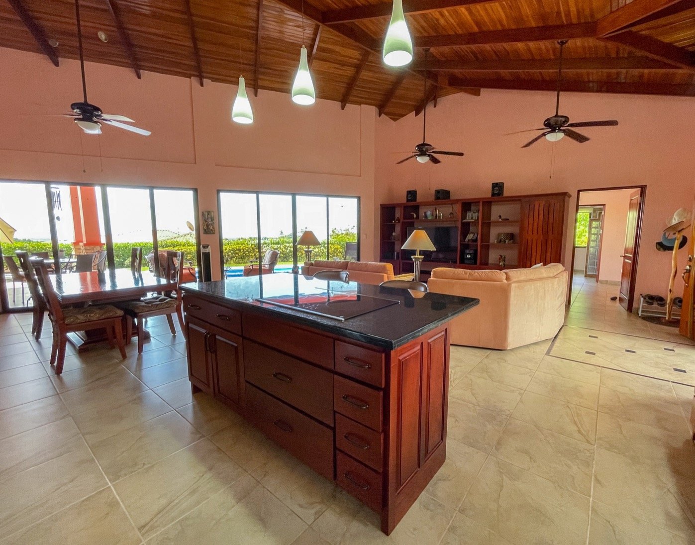 The moment you step inside this thoughtfully designed single-level home, you'll be captivated by the warm glow of locally-sourced ronrón wood featured throughout. This prized Central American hardwood, renowned for its exceptional durability and rich golden tones, infuses every space with tropical elegance and sophisticated charm.