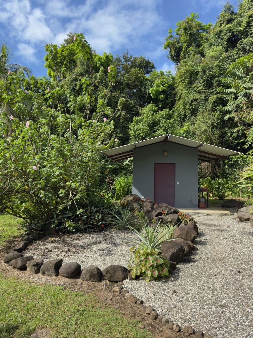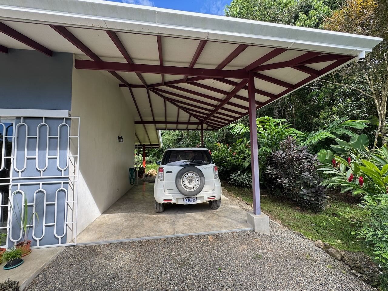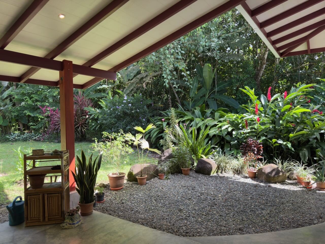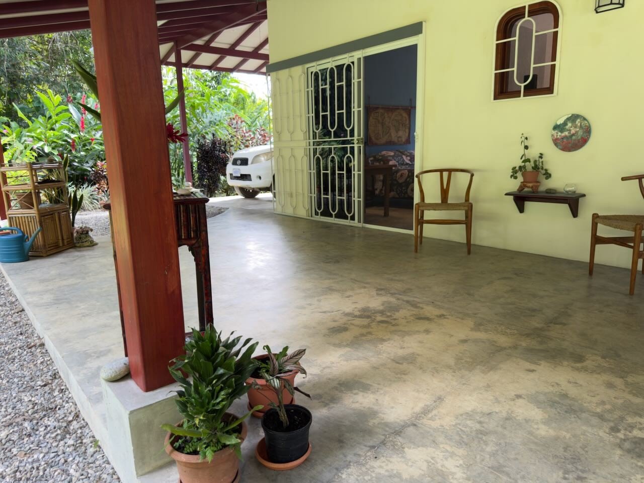 When entering the property you are greeted by a long gravel driveway and a beautiful lush garden before arriving at the house and it’s carport for parking. Entrance to the house is generally around back where a large roofed patio the length of the house accommodates seating for dining, entertaining, Yoga or just lounging in the quiet view of the garden and neighbouring forest. The access paths to the forest are facing the Patio. At the end of the patio facing west is a path leading to the nine sq. meter Bodega/Laundry Room built just 4 years ago of cement block.