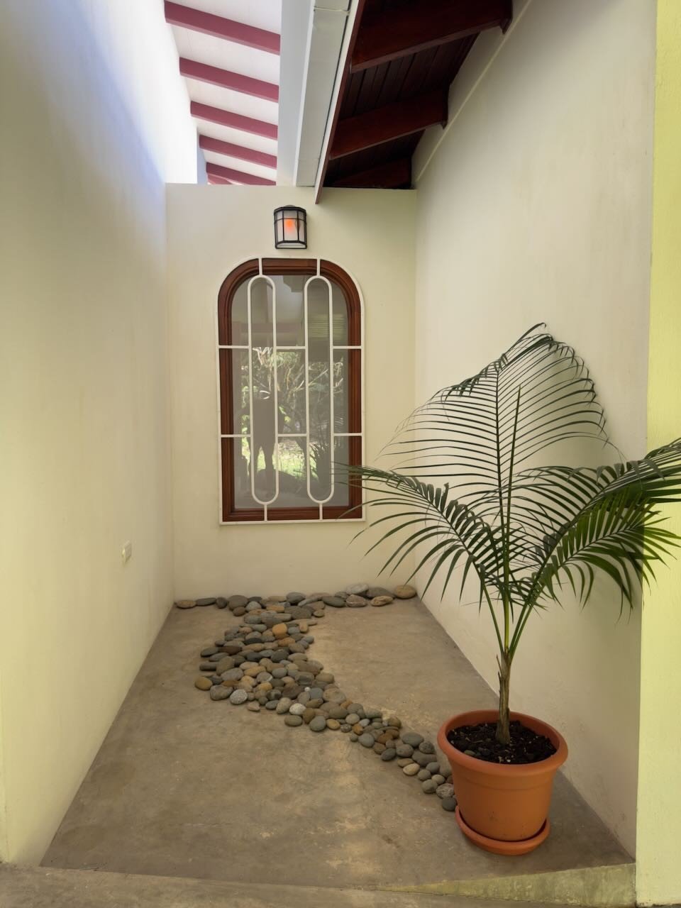 The house is a combination of an original classic 1 room home built in 1997 and an extension built just 4 years ago, both in cement block construction. The new 150 square meter extension was designed with an attention to detail with matching elements that create a beautiful cachet of it’s own. The original now a bedroom, bathroom and a T.V. area and the new holds the kitchen and another bathroom and bedroom with three patio doors leading to the outside patio and yard which has plenty of room for a pool if desired. The architecture was designed with a flume roof allowing the escape of heat for those who enjoy life without A/C.