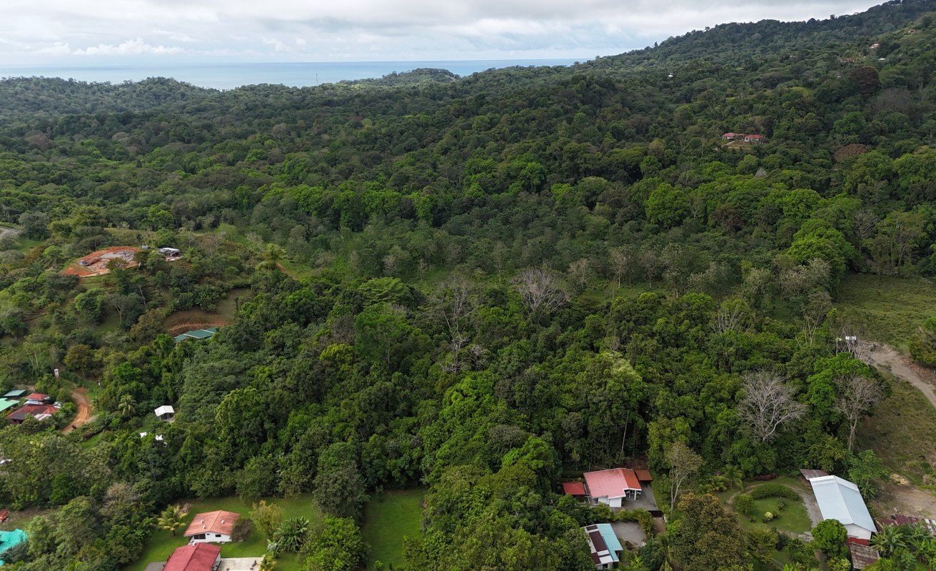The property is neighboured on one side by an original Ojochalian Family Farm and on the other by 9 lots facing Calle del Bosque. The street frontage of the property is 56 meters. Just 100 meters of dirt road east to the beginning of the pavement of Calle del Bosque which leads just 600 meters south to Ecuela Tortuga and the convenience store on Calle Principale which runs two kilometres with its supermarket, Pharmacy, Soccer field and restaurants to the entrance of Ojochal and all of it’s amenities including restaurants, bars, shops and Hardware