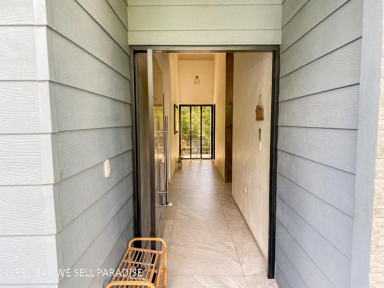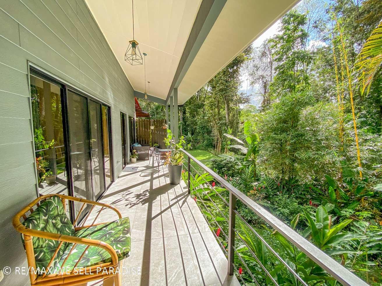 Step through the front entrance into a breezy hallway that leads straight to the jungle-view deck. To the right, the open-plan living space includes: