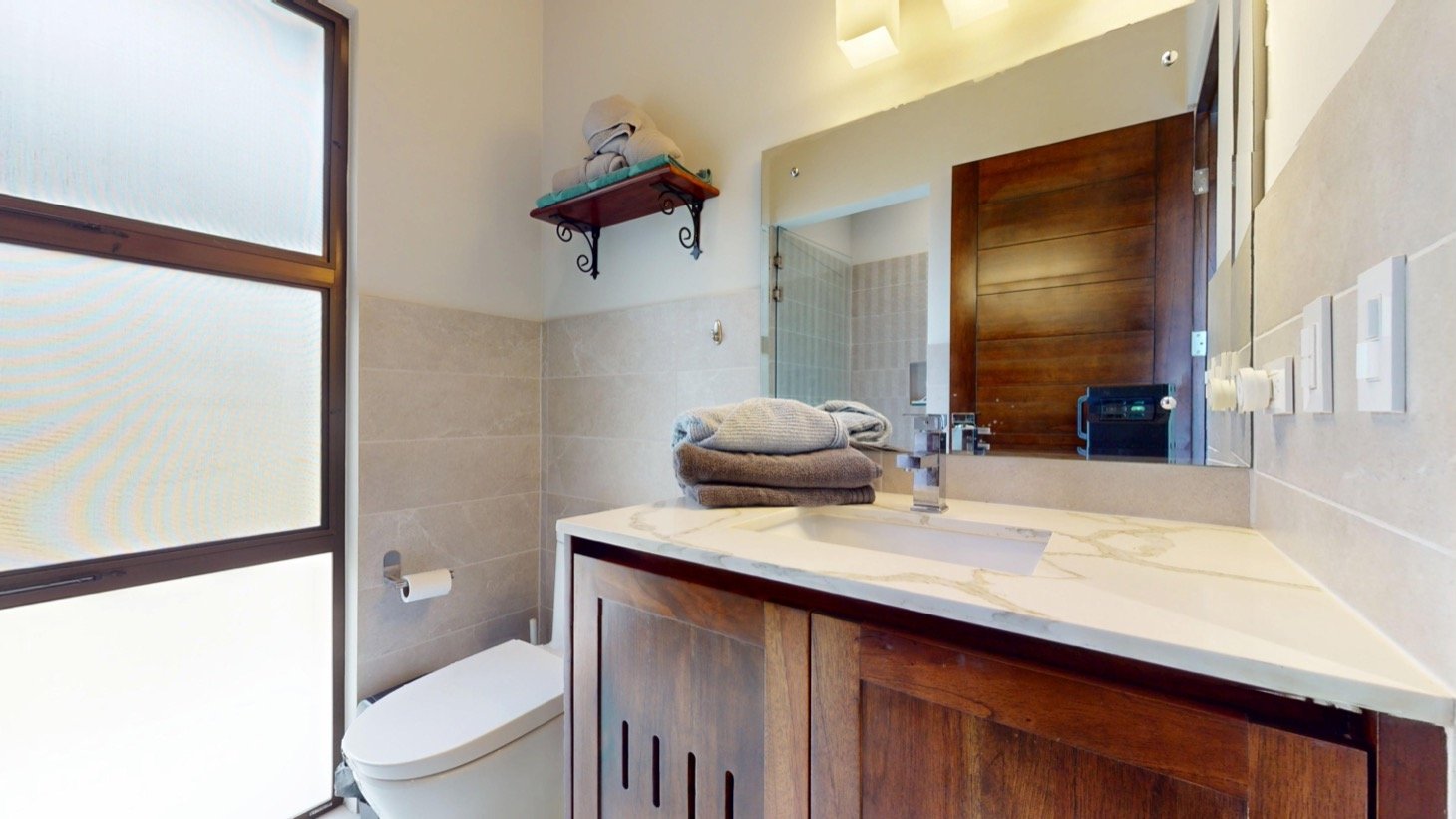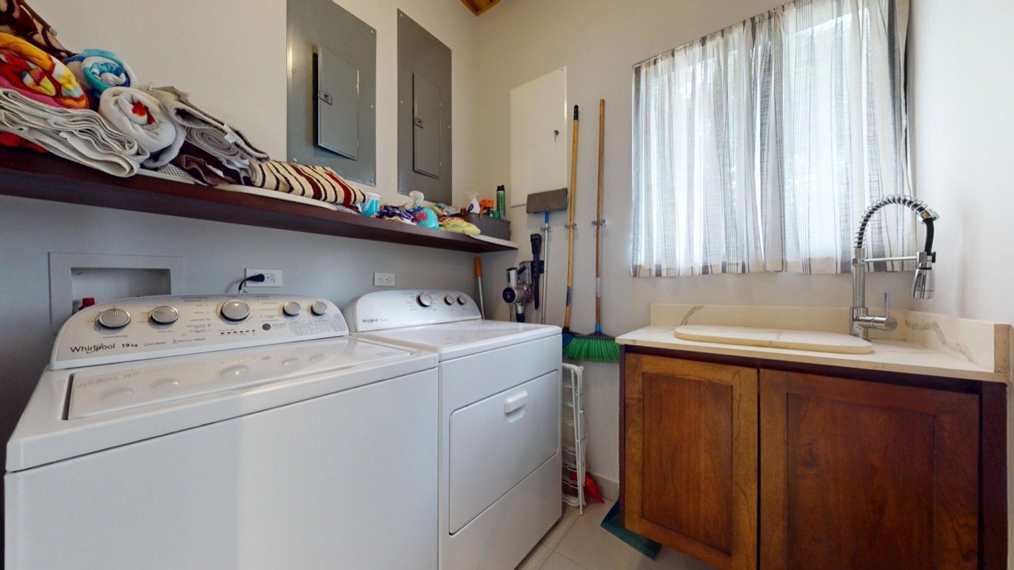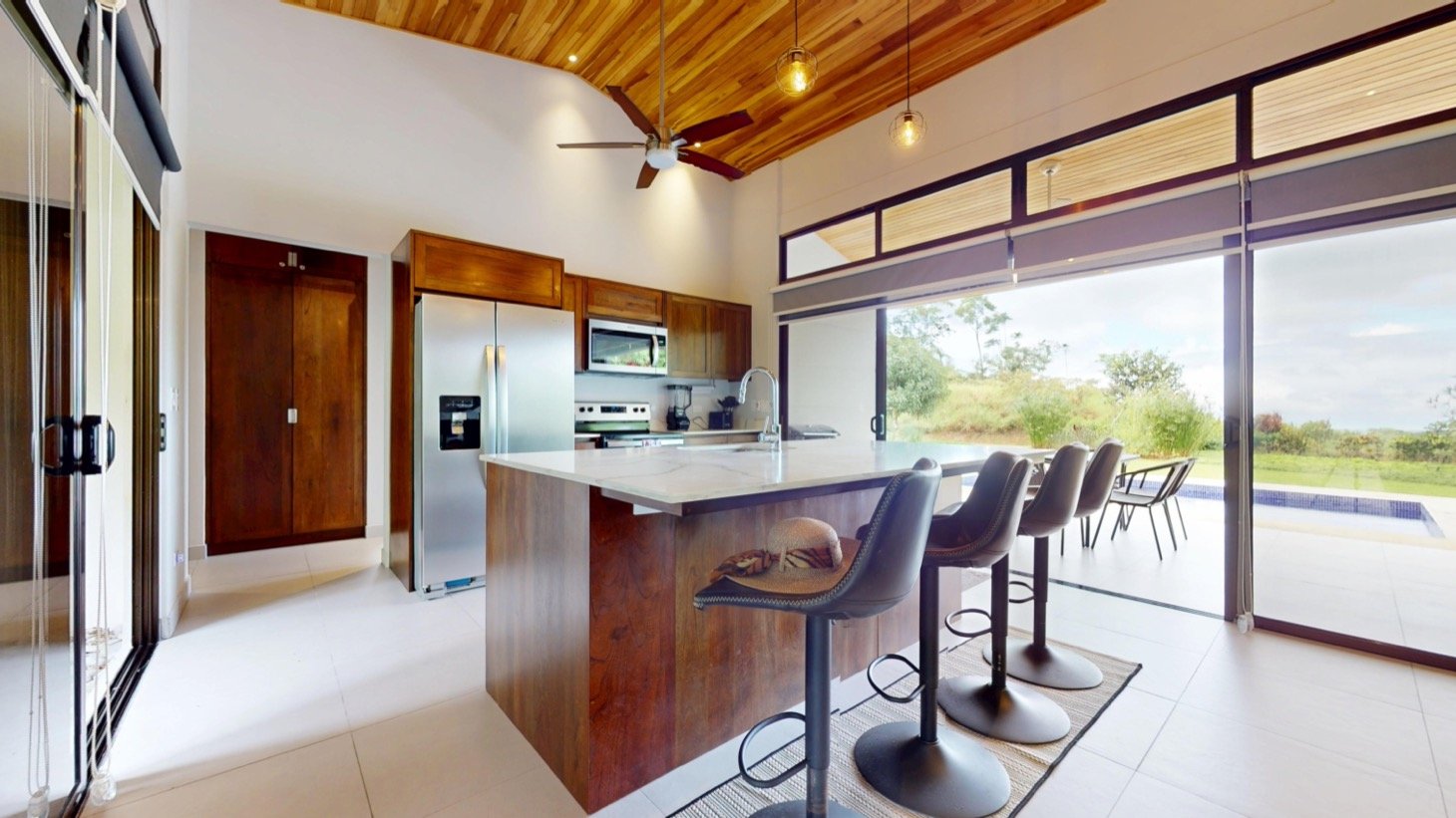 Step inside to discover vaulted ceilings finished in rich Costa Rican hardwood, giving the home both warmth and plenty of spacious feel. Matching hardwood cabinetry and furnishings throughout elevate every space with an authentic natural touch. The open-concept design and large glass doors invites soft breezes and natural light, creating a peaceful and stylish atmosphere for daily living or entertaining.