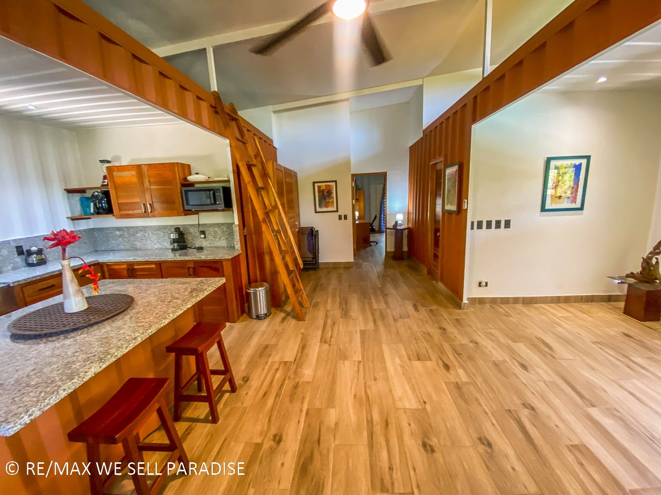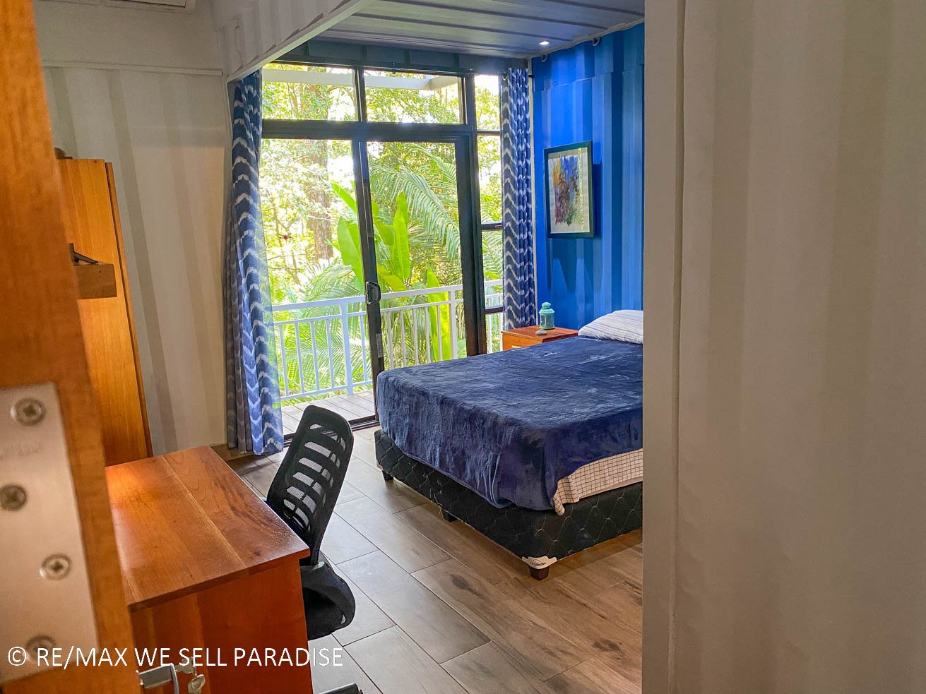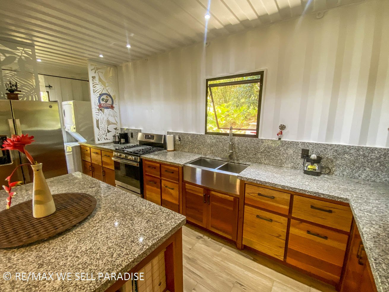 The beautiful house hangs over a steep jungle-covered ravine – and a covered wrap-around patio takes full advantage of this elevated location. As you relax on the patio, you are looking straight into the canopies of a towering tropical rainforest. Two large bedrooms with full ensuites, plentiful storage, workspaces, TVs and large windows offer direct patio access via large sliding glass doors. The central area of the home is airy & spacious with high ceilings, bright walls and an outstanding kitchen which will bring out the inner chef in everyone. The kitchen’s storage & counter space is simply outstanding, the breakfast bar offering even more space to cook, eat or relax with a hot or cold drink. Across the kitchen is a spacious, lofty area that can be converted into a living space, dining room, functional / workout area, and even an indoor relaxation garden.