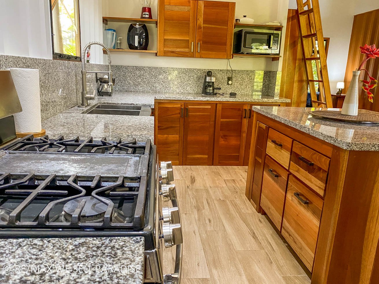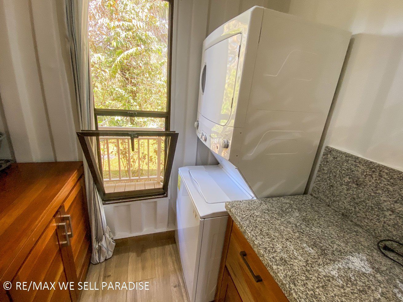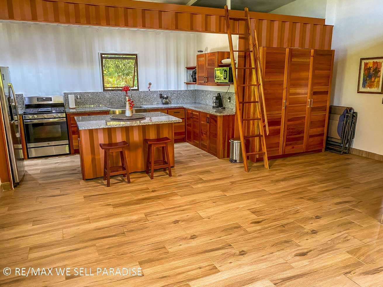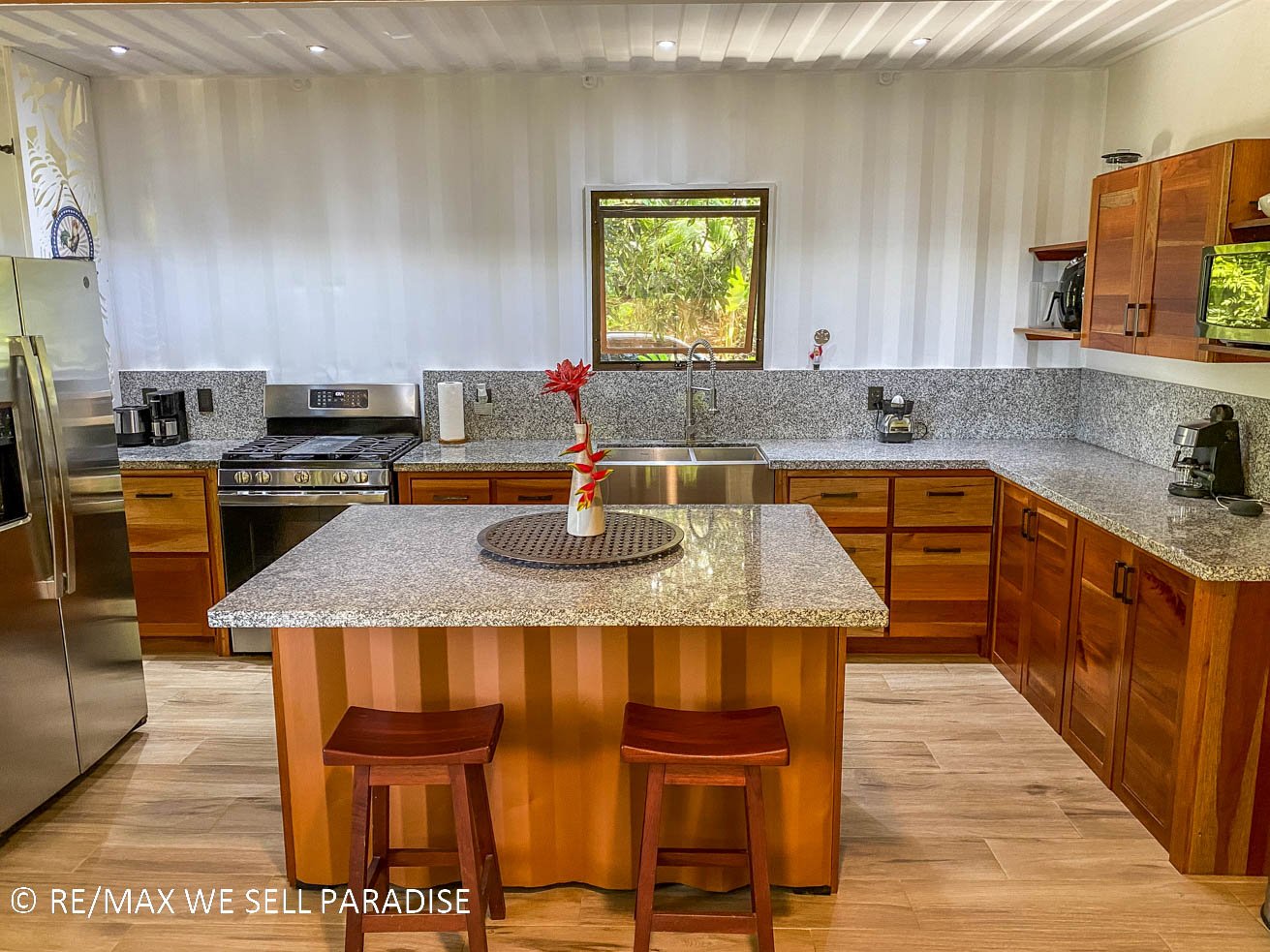 The beautiful house hangs over a steep jungle-covered ravine – and a covered wrap-around patio takes full advantage of this elevated location. As you relax on the patio, you are looking straight into the canopies of a towering tropical rainforest. Two large bedrooms with full ensuites, plentiful storage, workspaces, TVs and large windows offer direct patio access via large sliding glass doors. The central area of the home is airy & spacious with high ceilings, bright walls and an outstanding kitchen which will bring out the inner chef in everyone. The kitchen’s storage & counter space is simply outstanding, the breakfast bar offering even more space to cook, eat or relax with a hot or cold drink. Across the kitchen is a spacious, lofty area that can be converted into a living space, dining room, functional / workout area, and even an indoor relaxation garden.