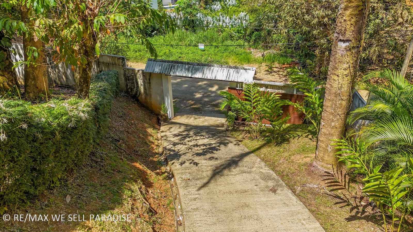 A secure front gate and high concrete walls provide security and privacy, and the home’s elevated location add more separation from the public road (and neighbors) below.
