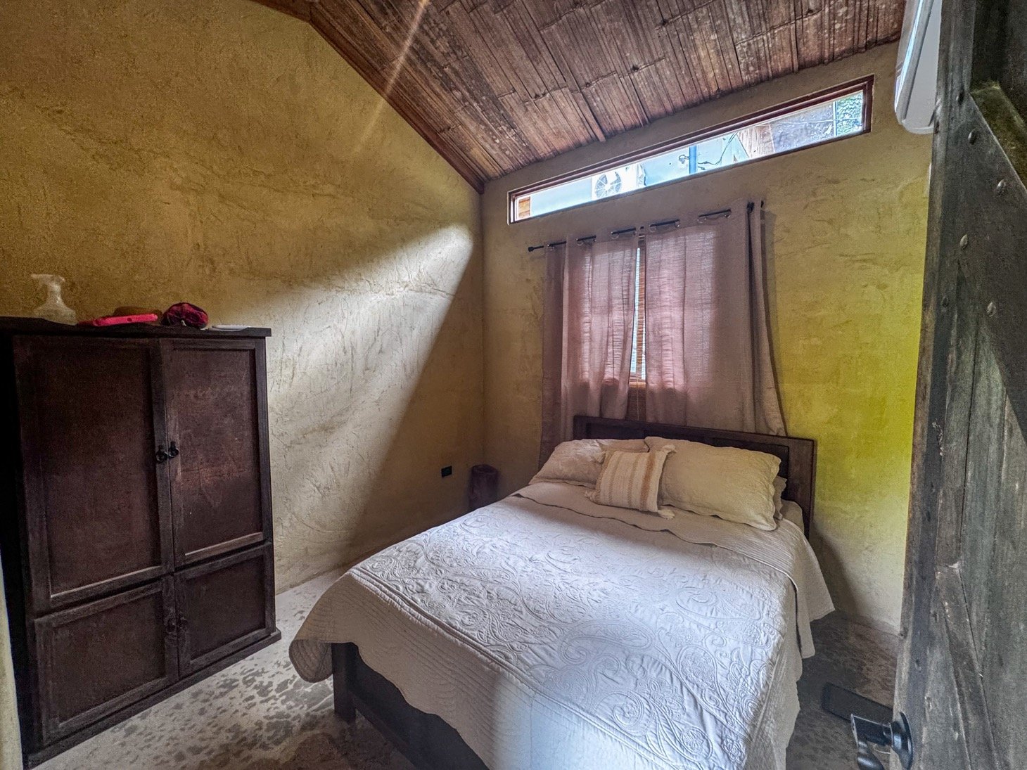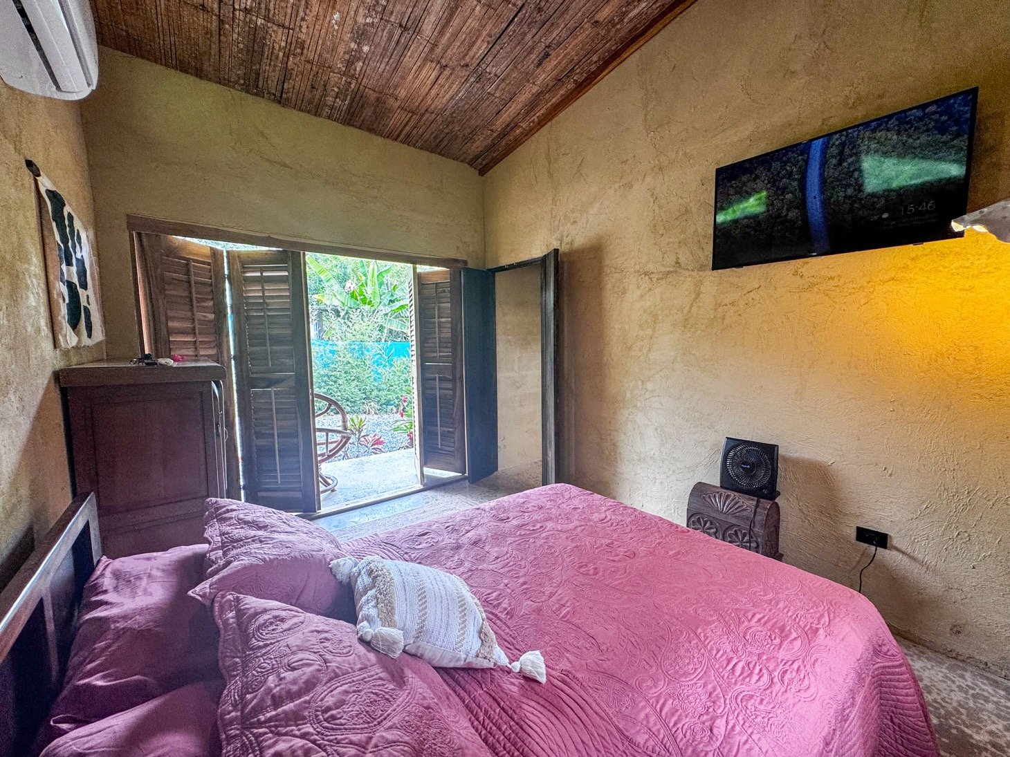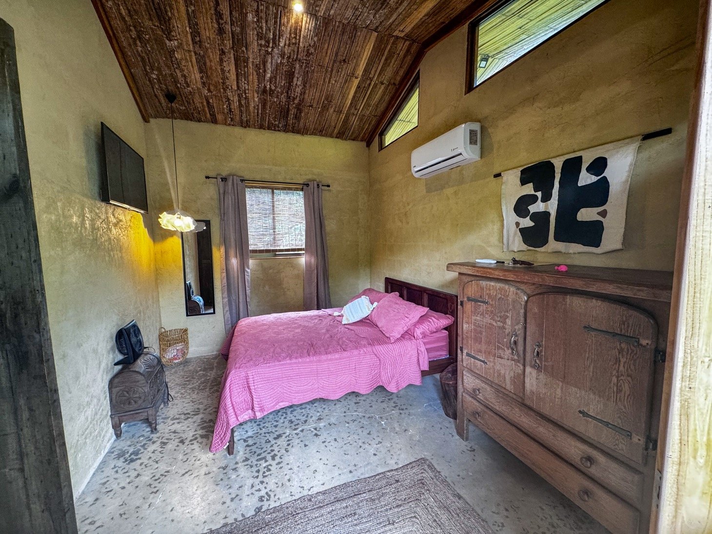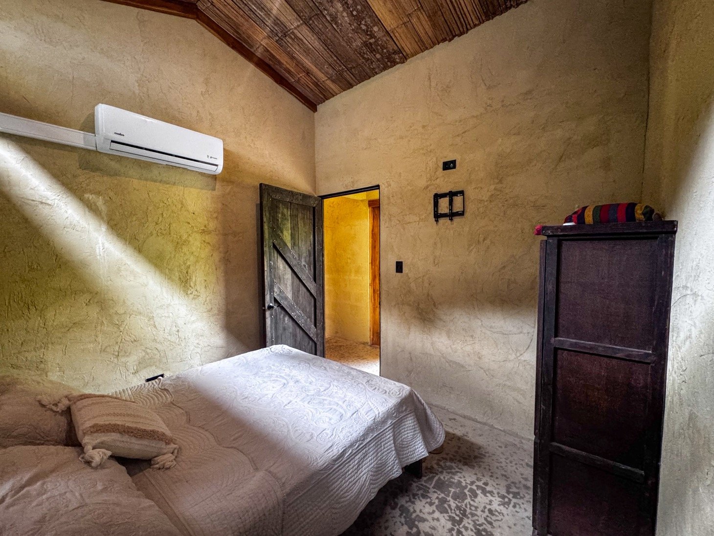The home features two air-conditioned bedrooms, one full bathroom, and refined teak wood accents that add warmth and character to the interior. Built entirely with solid concrete blocks, the structure is topped with ceilings finished in traditional woven esterilla, lending an artisanal touch.