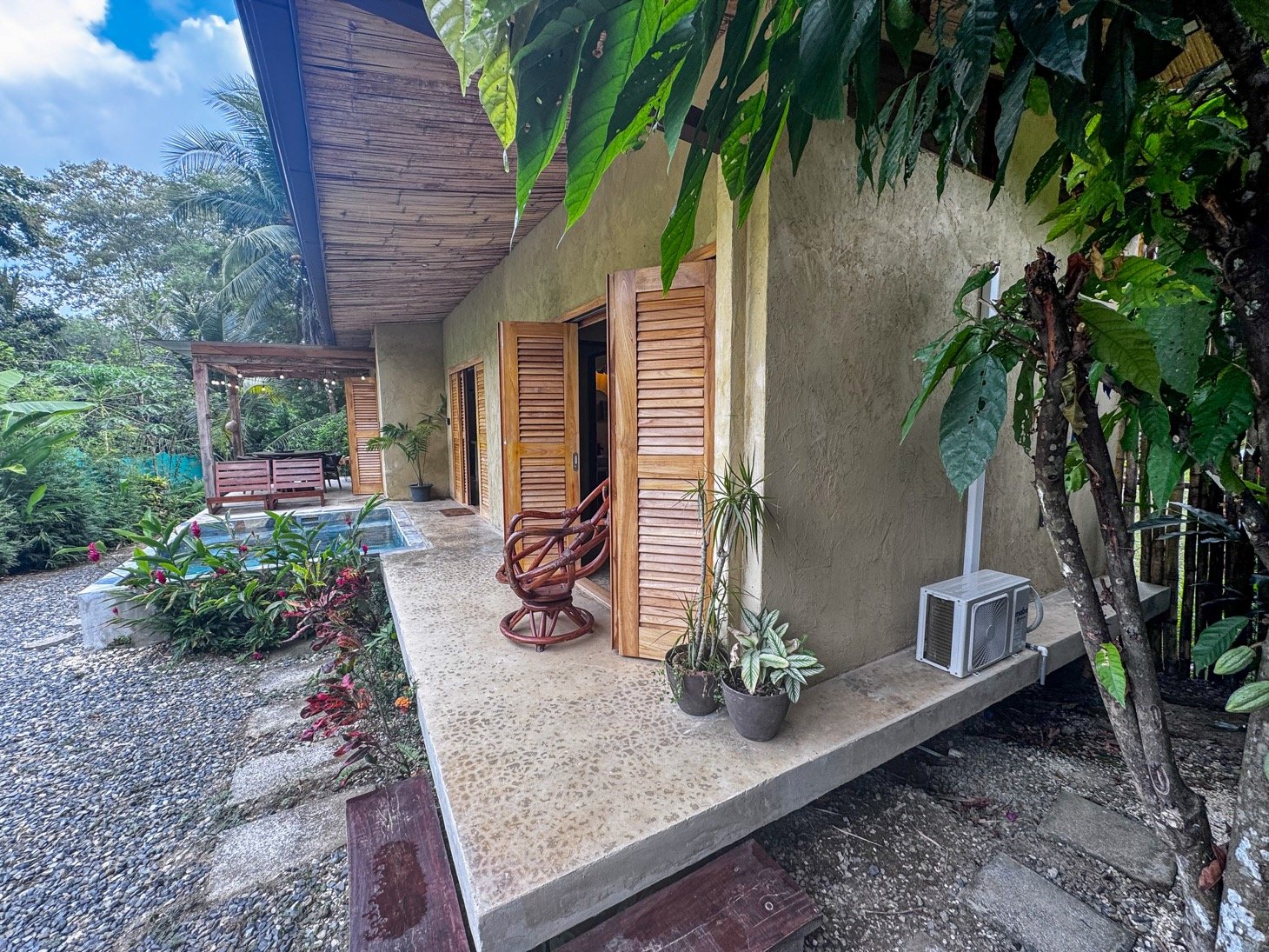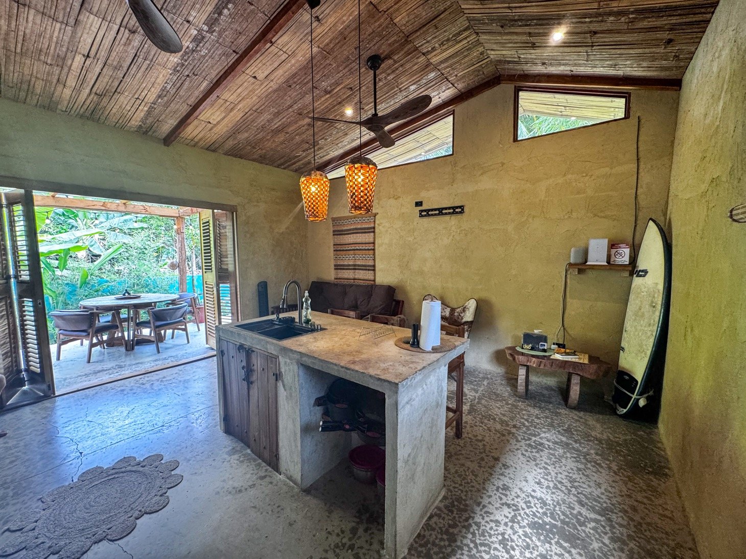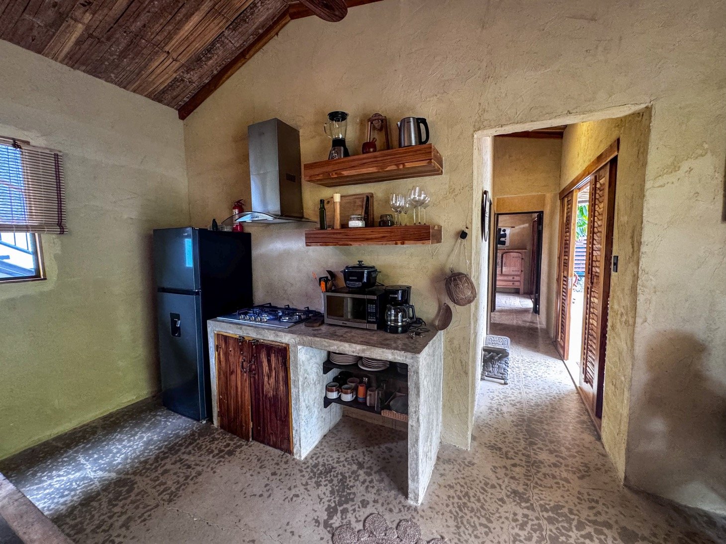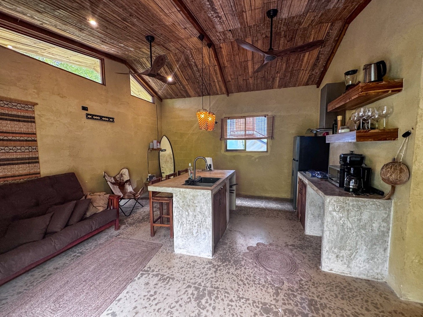 The home features two air-conditioned bedrooms, one full bathroom, and refined teak wood accents that add warmth and character to the interior. Built entirely with solid concrete blocks, the structure is topped with ceilings finished in traditional woven esterilla, lending an artisanal touch.
