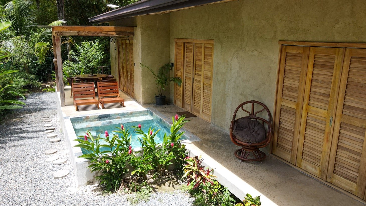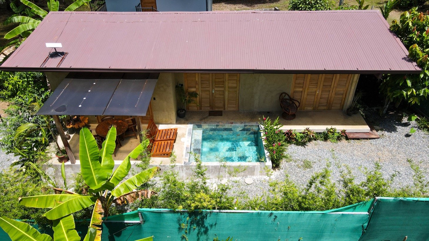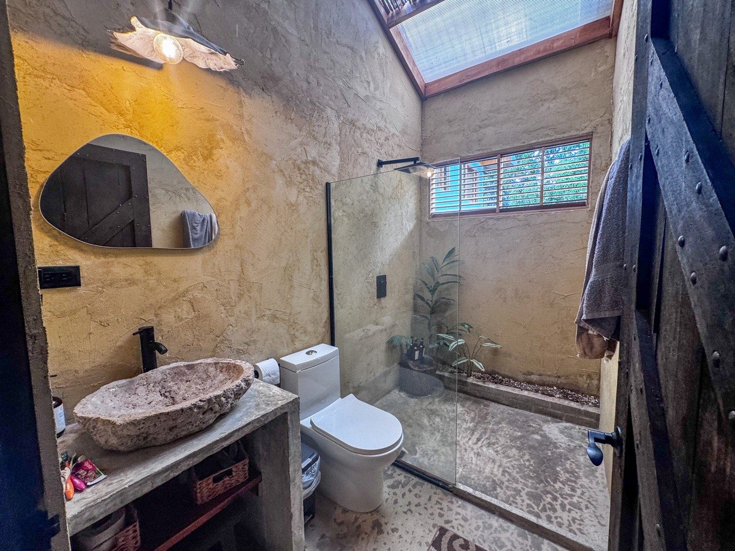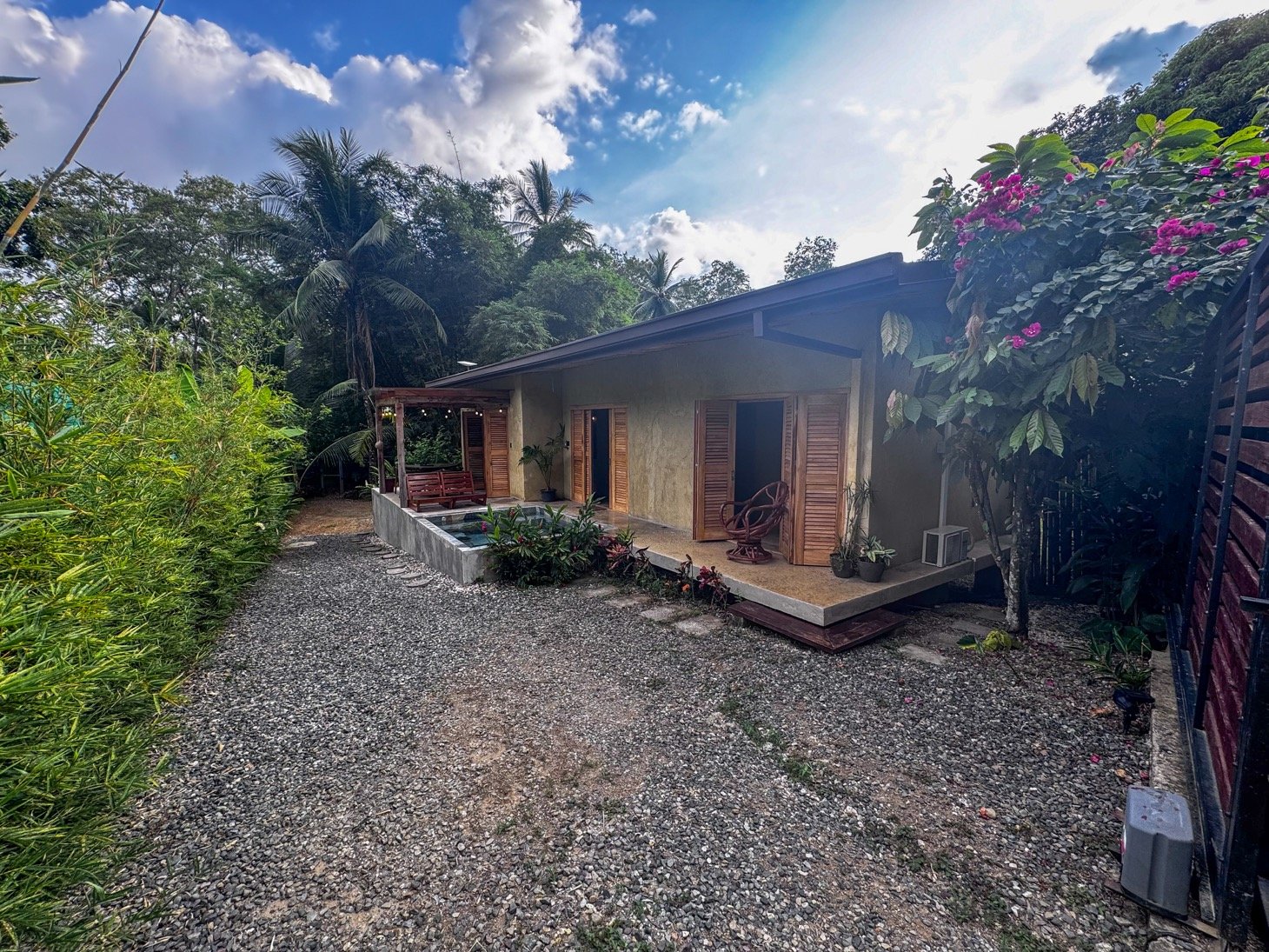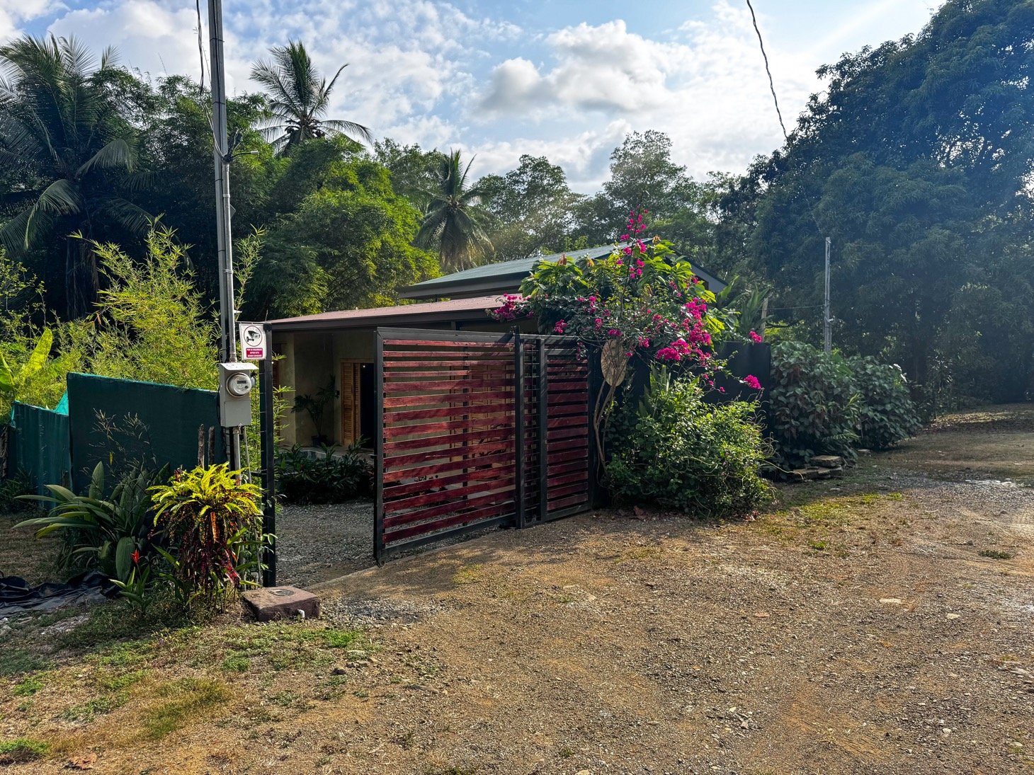 The home features two air-conditioned bedrooms, one full bathroom, and refined teak wood accents that add warmth and character to the interior. Built entirely with solid concrete blocks, the structure is topped with ceilings finished in traditional woven esterilla, lending an artisanal touch.